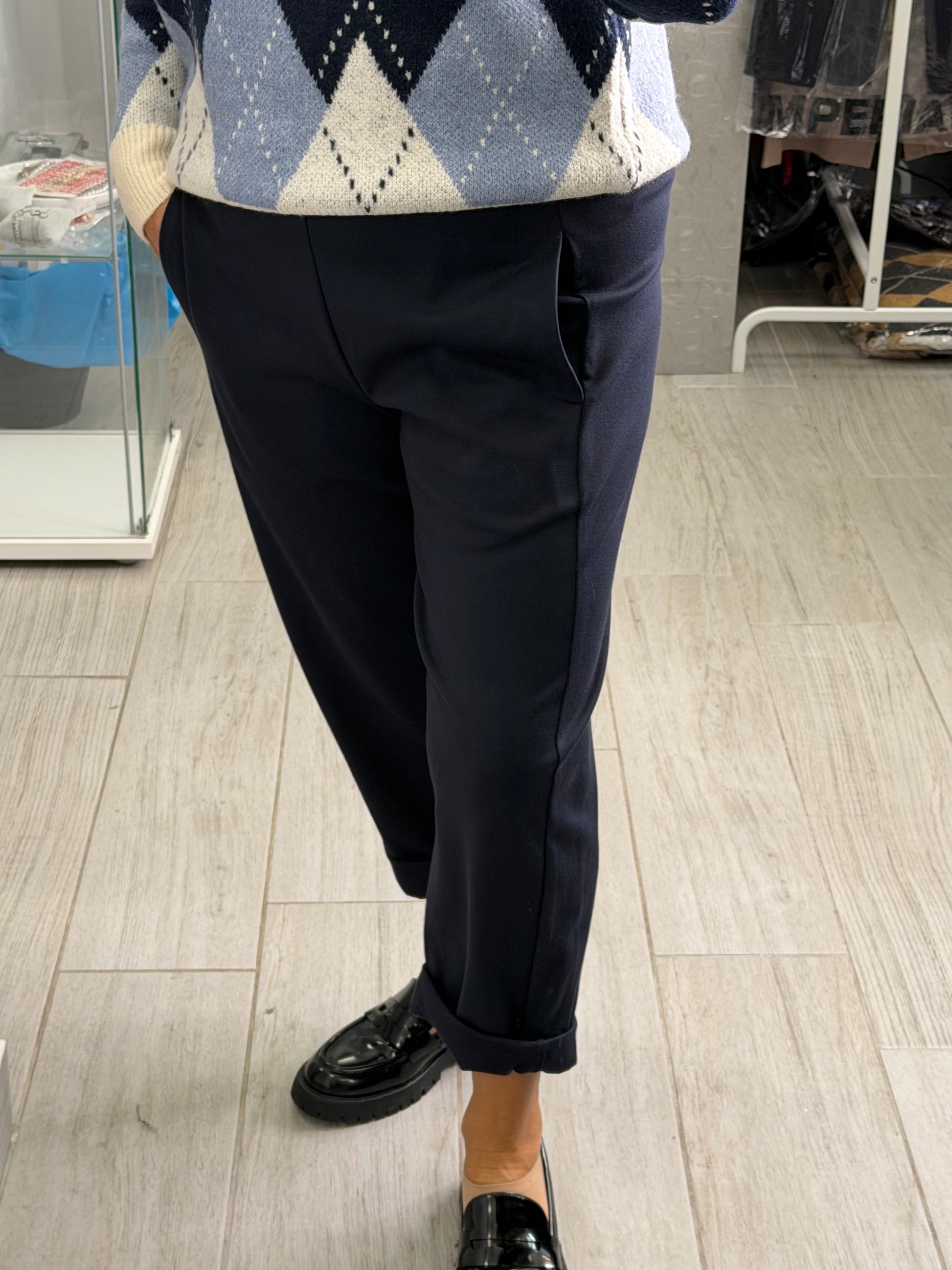 Pantalone in tessuto punto Milano, elastico su tutta la circonferenza della vita, tasche inserite nelle cuciture davanti. Taglia unica veste fino ad una 46. Composizione 65% viscosa 30% poliammide 5% elastan