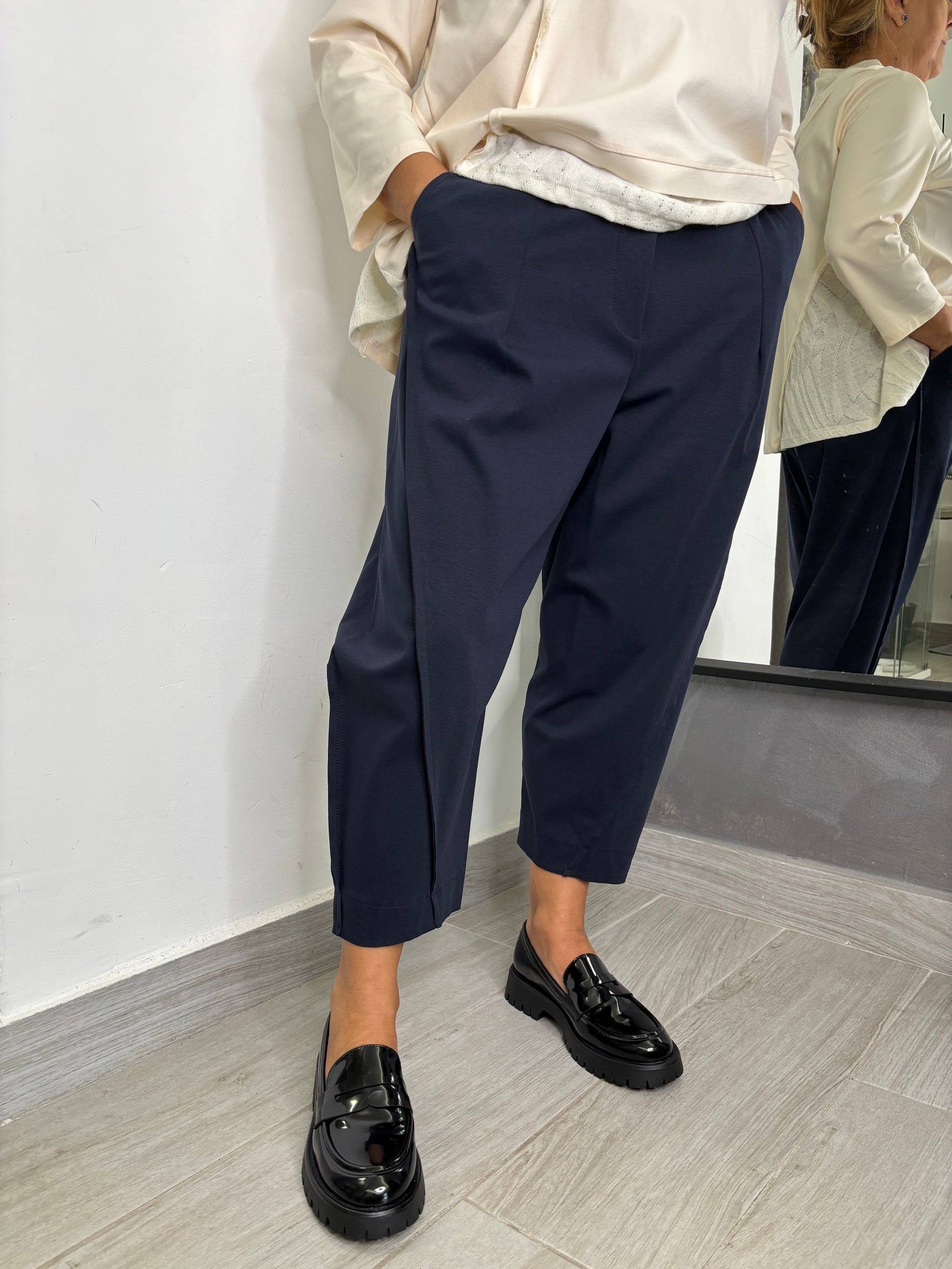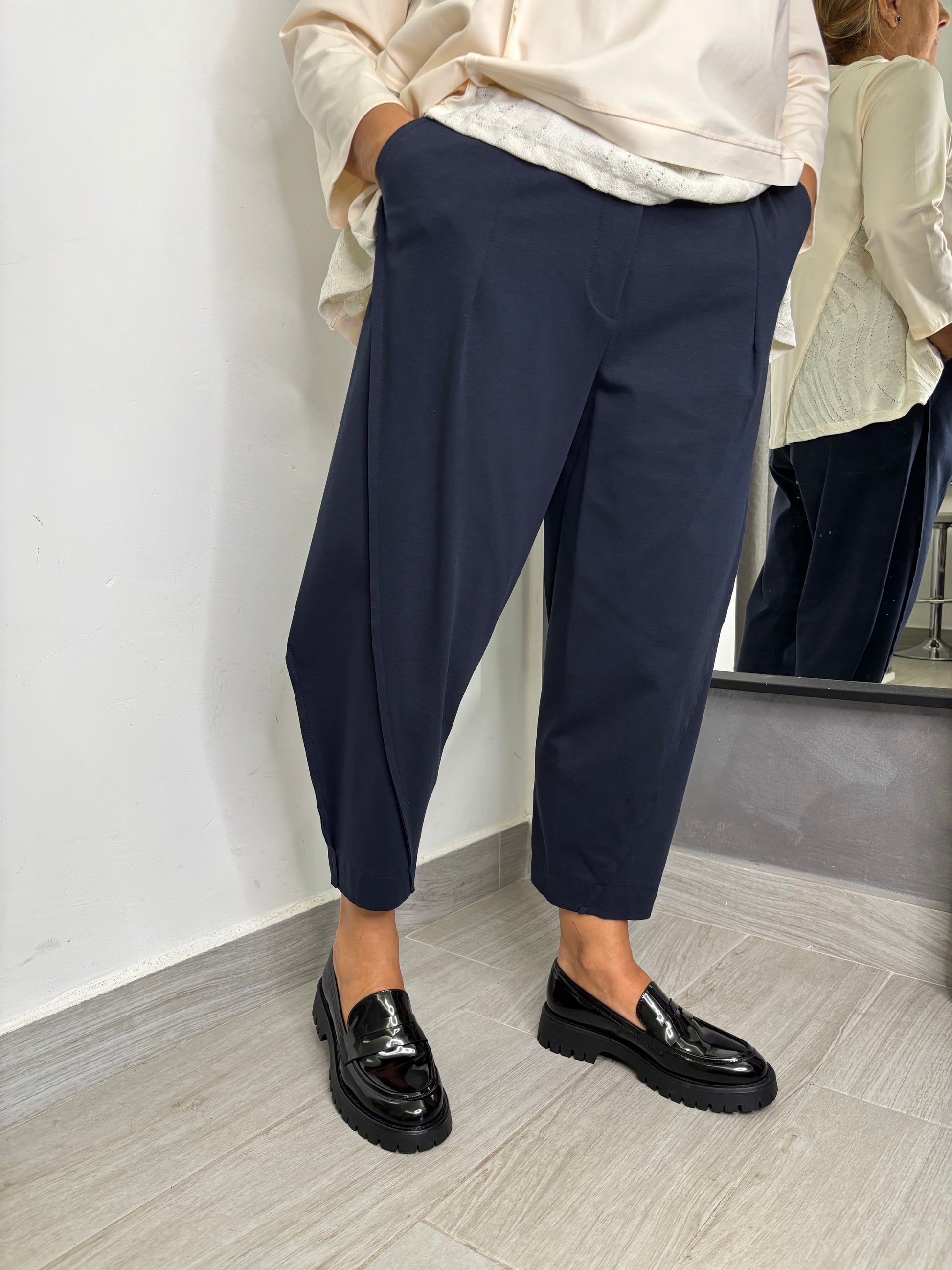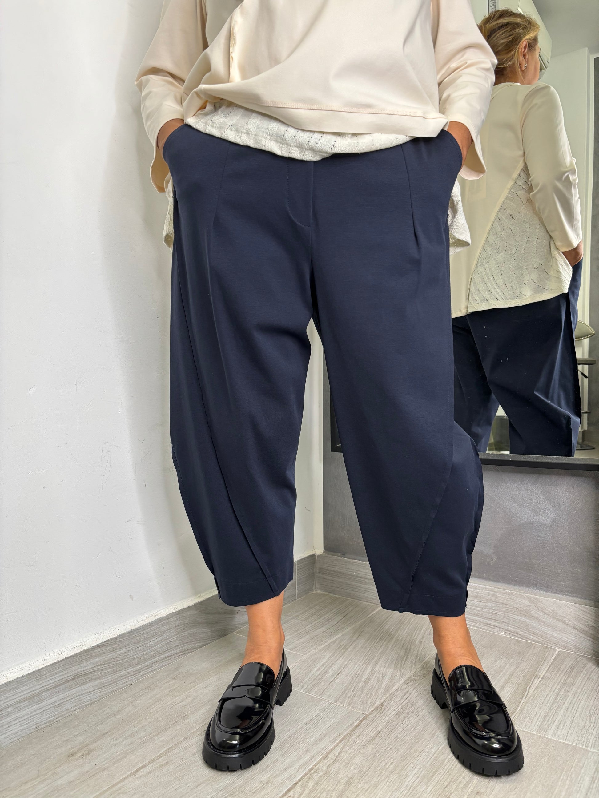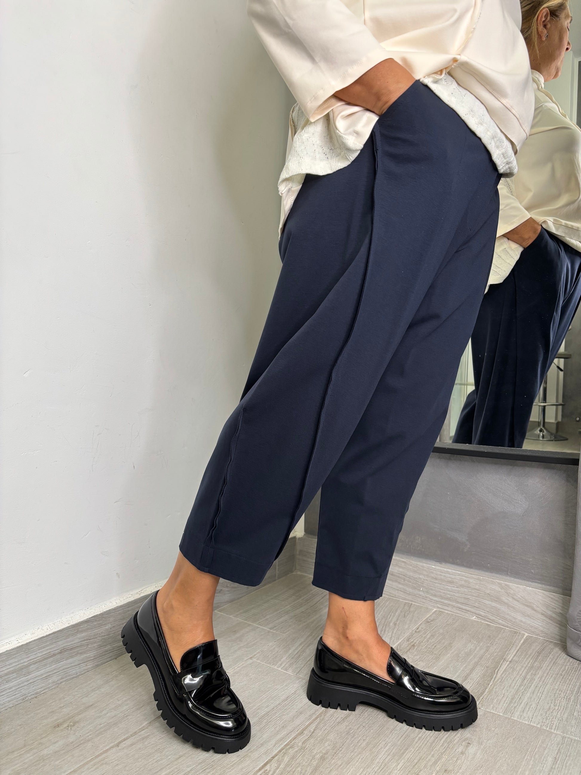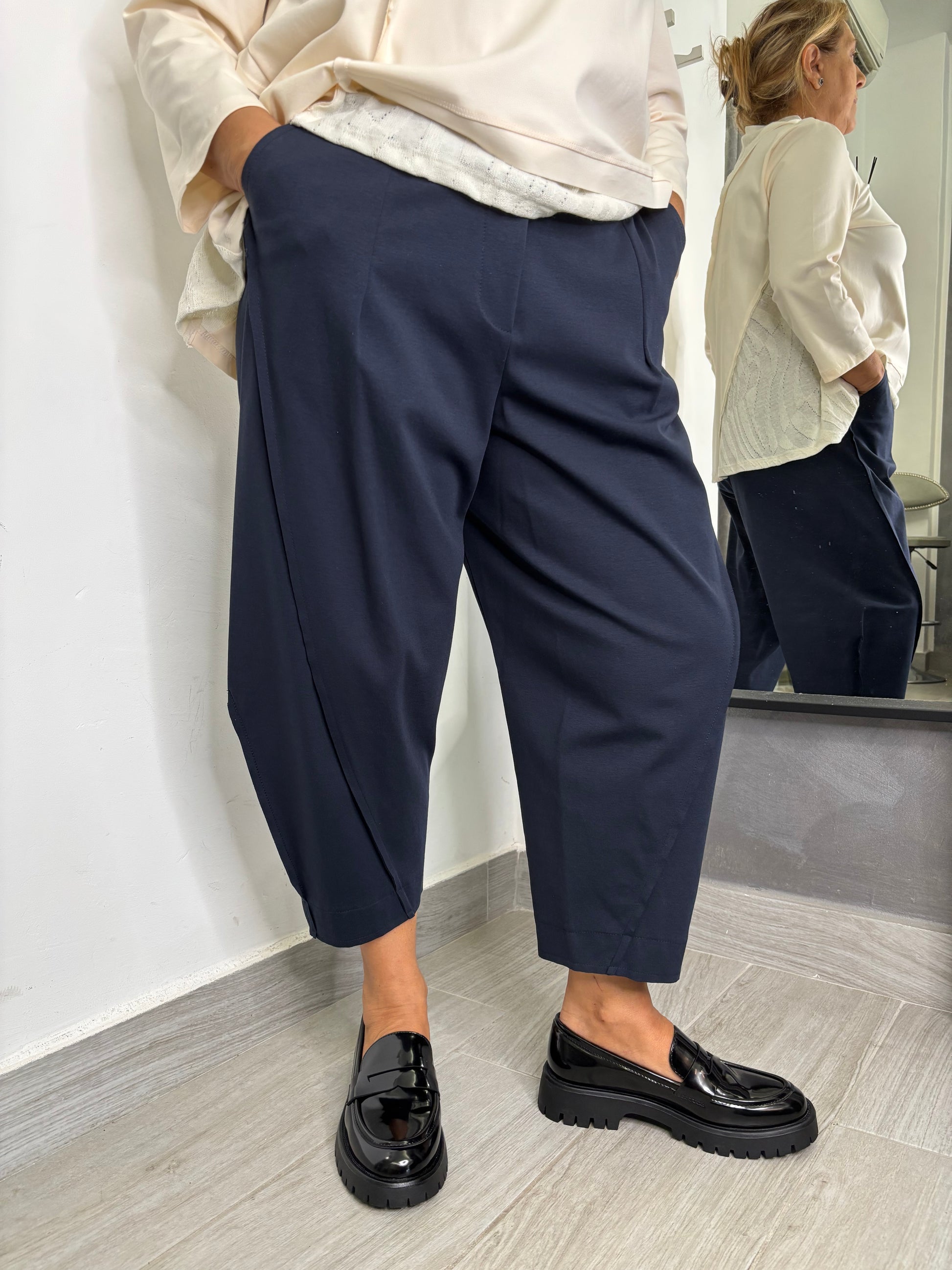 Pantalone in punto Milano, elastico in vita. Motivo cuciture a taglio vivo lungo tutta la gamba, tasche laterali davanti e finte dietro. Taglia unica. Vestibilità larga e comoda. Veste fino ad una 48. Composizione 53% cotone 38% poliestere 9% elastan