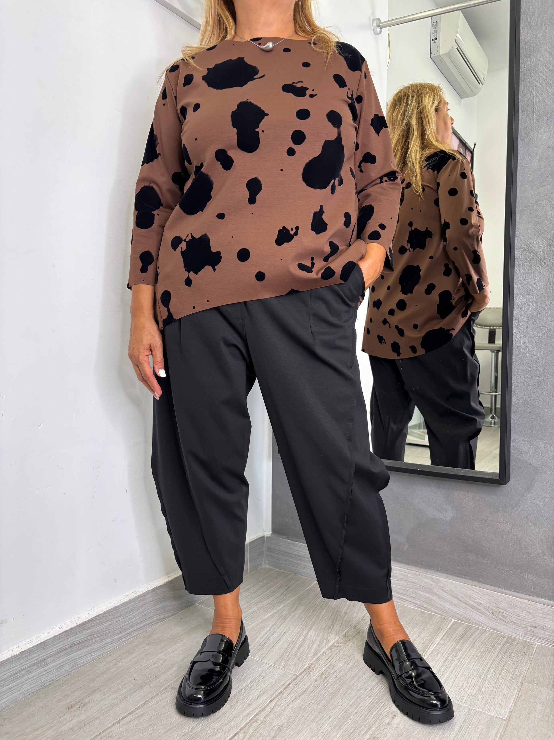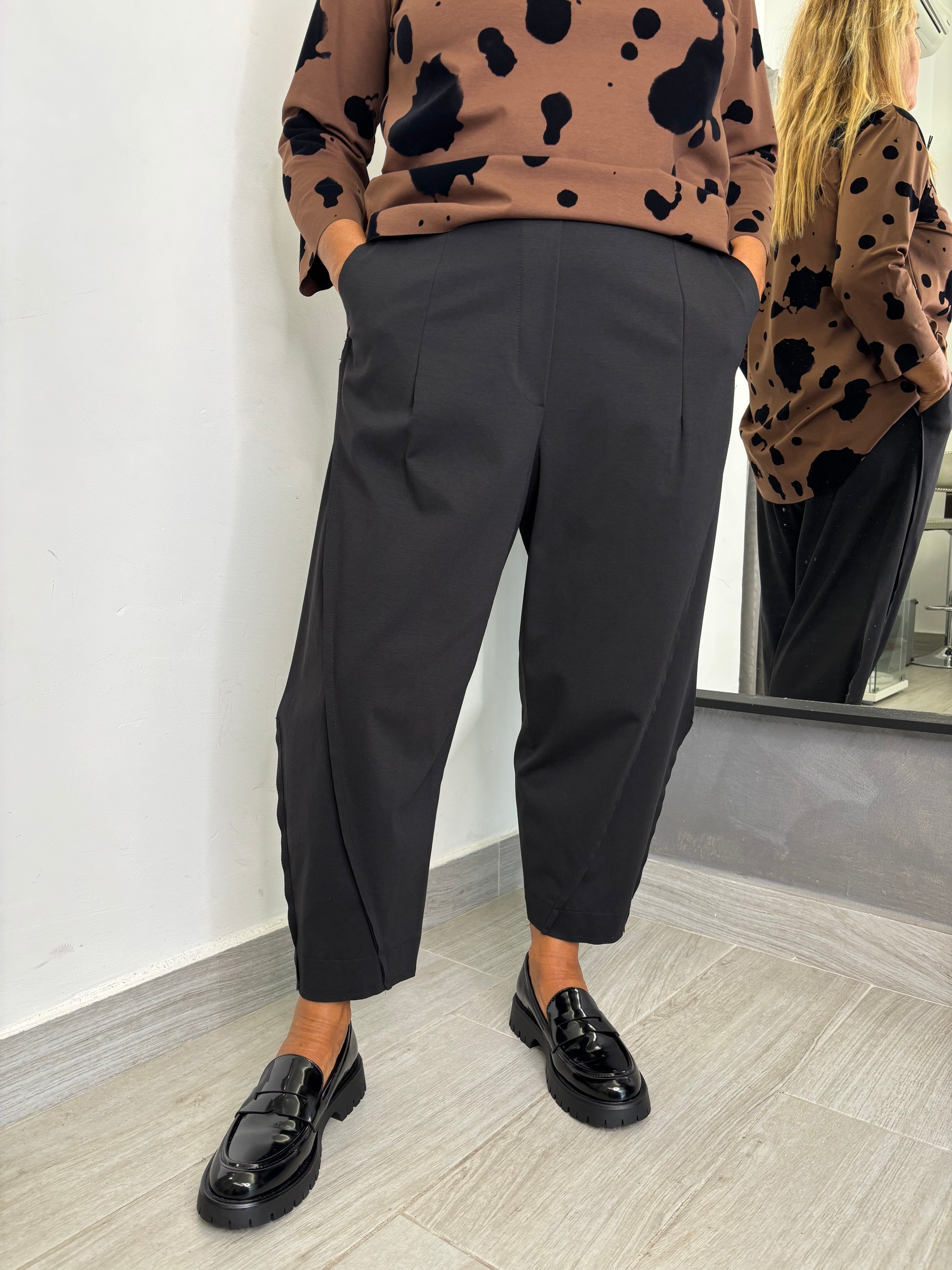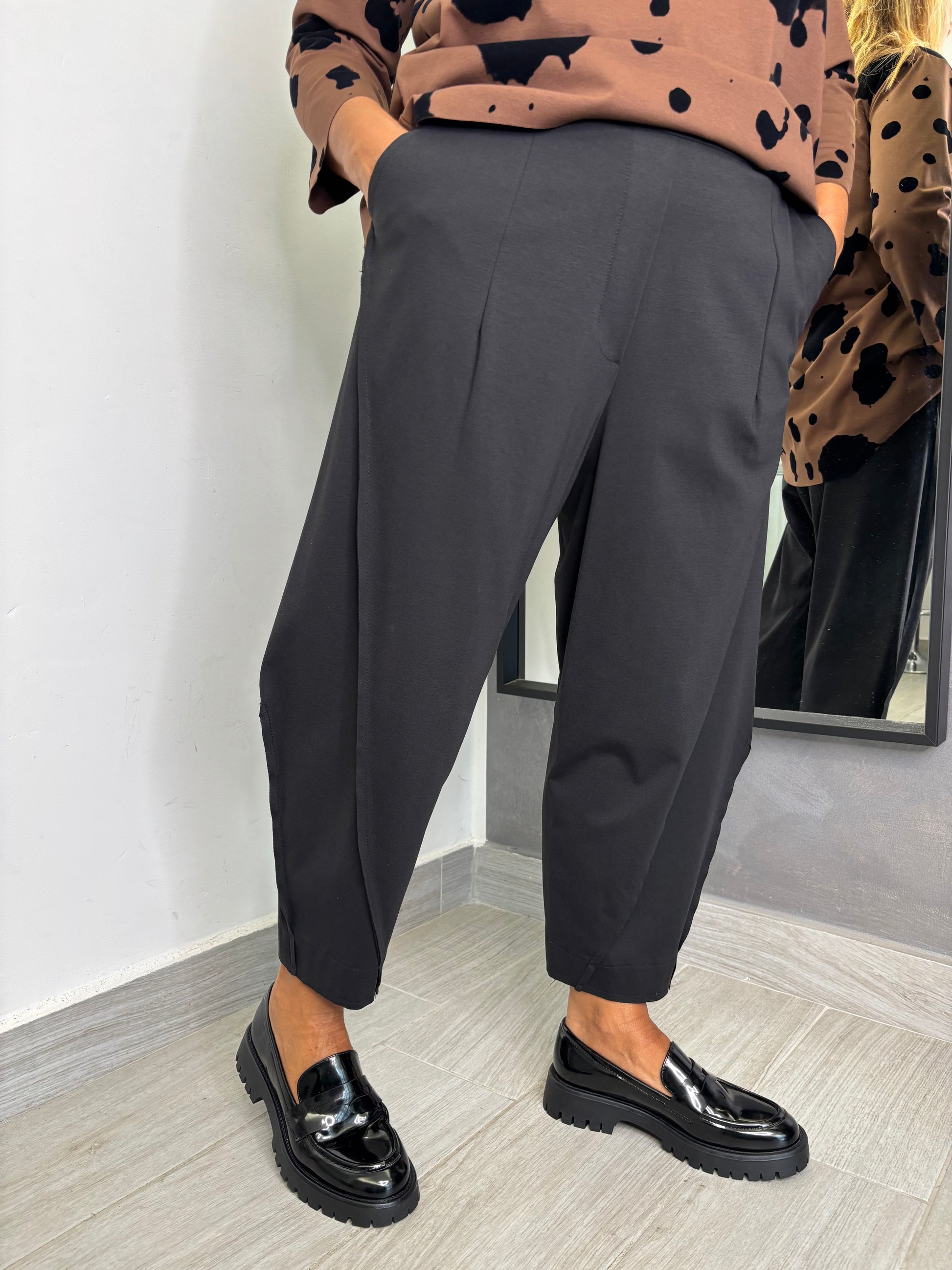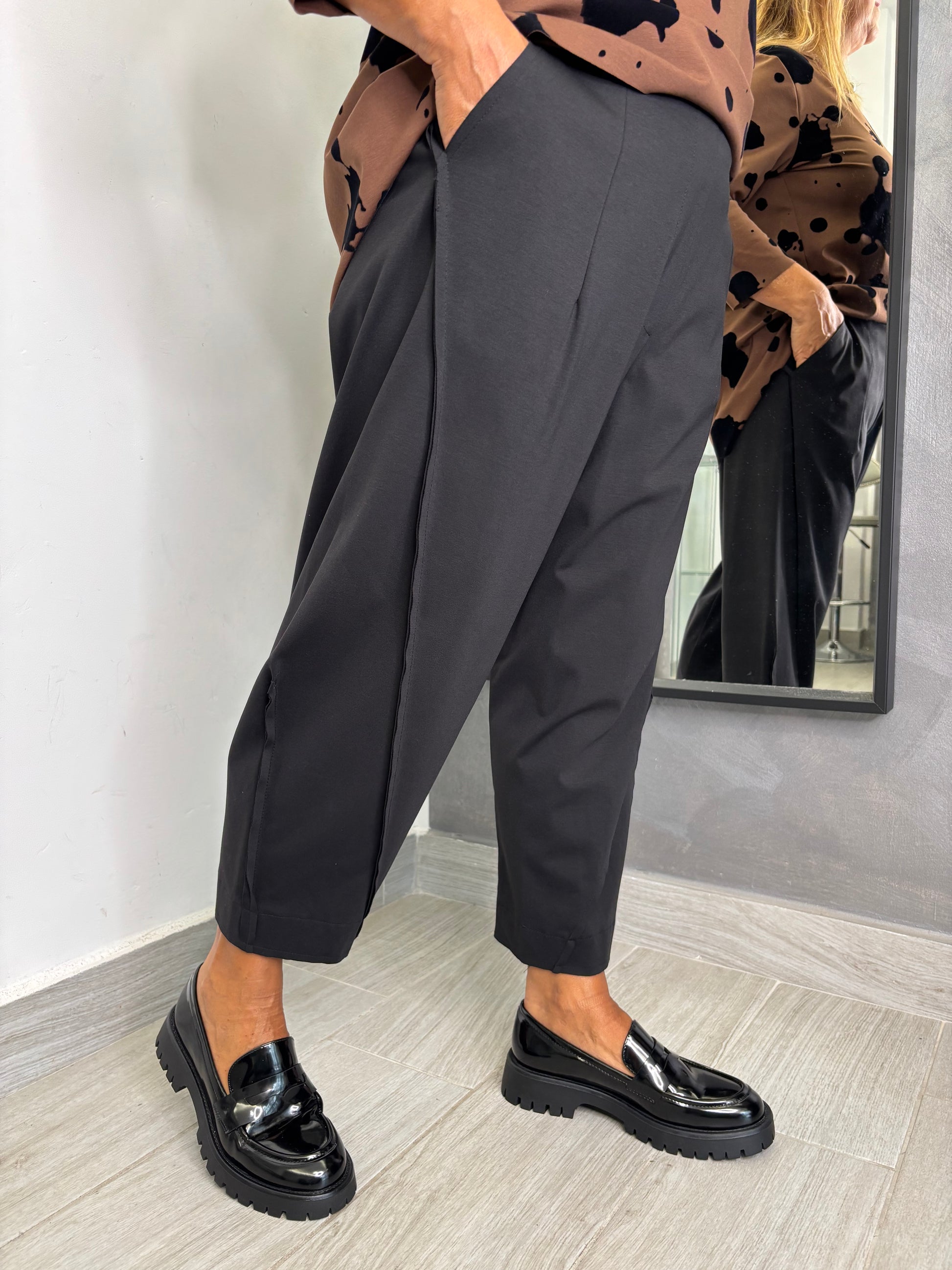Pantalone in punto Milano, elastico in vita. Motivo cuciture a taglio vivo lungo tutta la gamba, tasche laterali davanti e finte dietro. Taglia unica. Vestibilità larga e comoda. Veste fino ad una 48. Composizione 53% cotone 38% poliestere 9% elastan