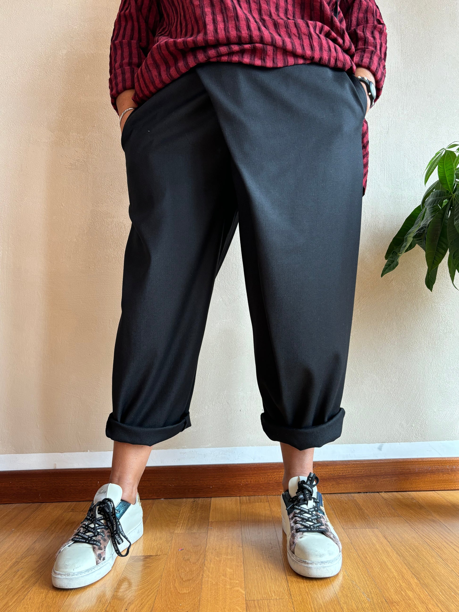 Pantalone in misto lana, elastico in vita, piegone cucito in cinturino, tasche inserite nei fianchi e una applicata dietro sulla parte destra. Taglia unica veste fino ad una 46