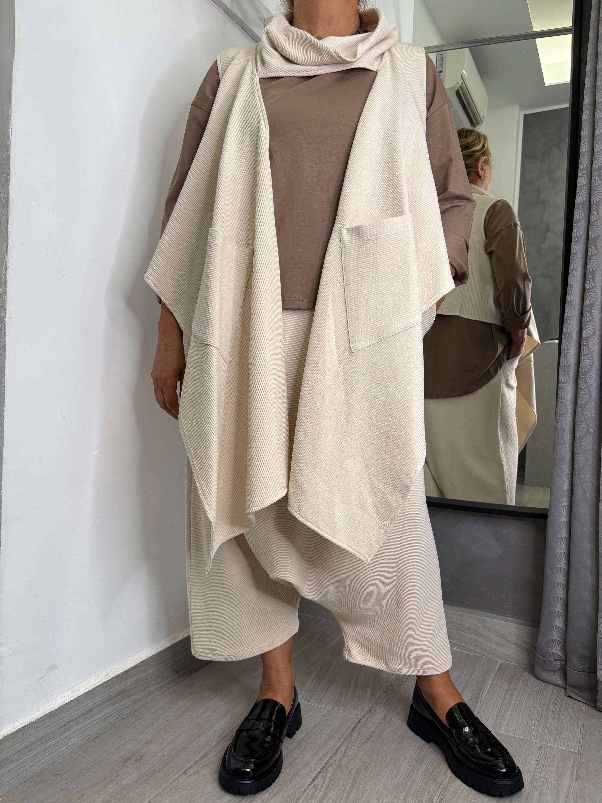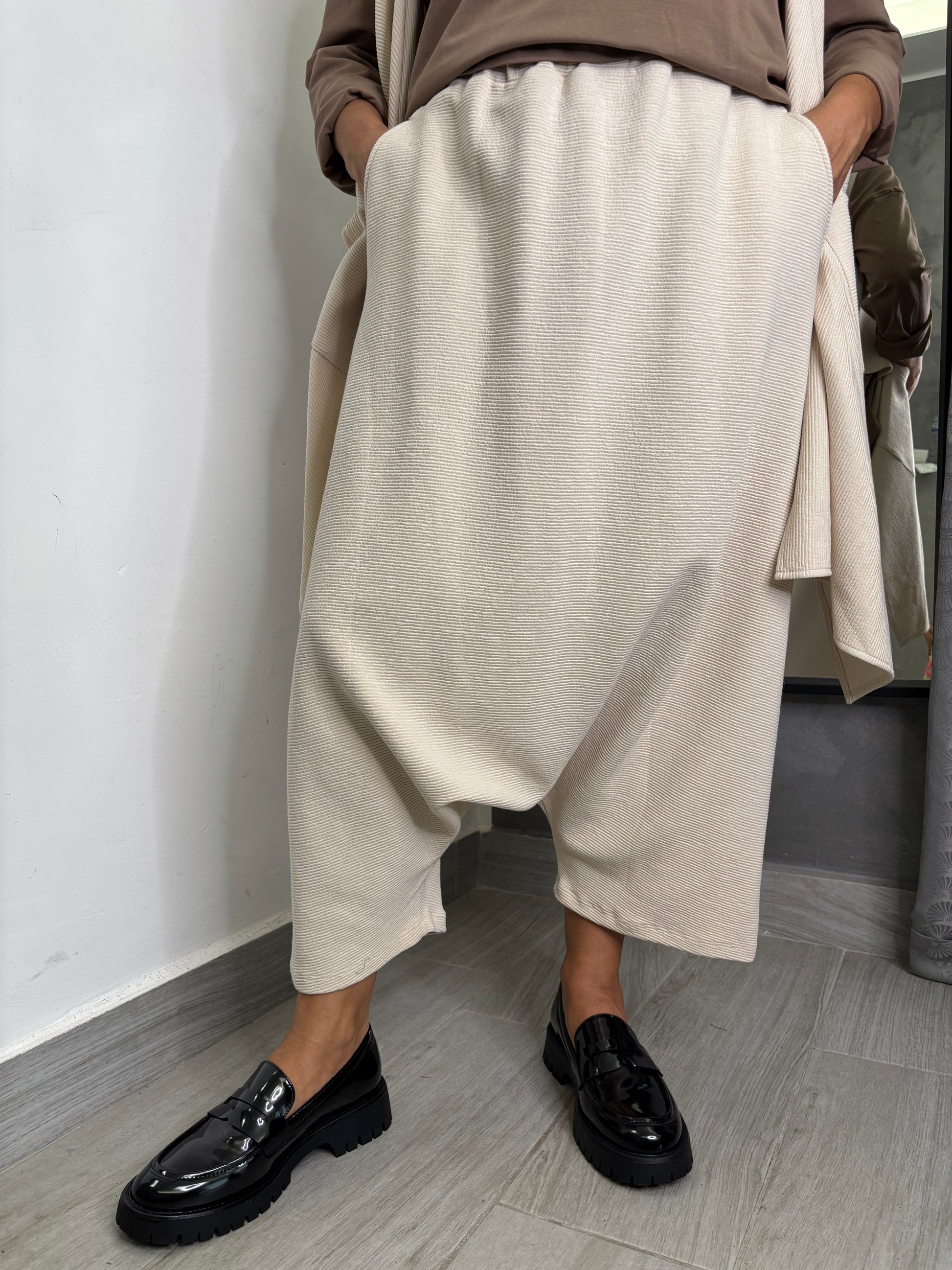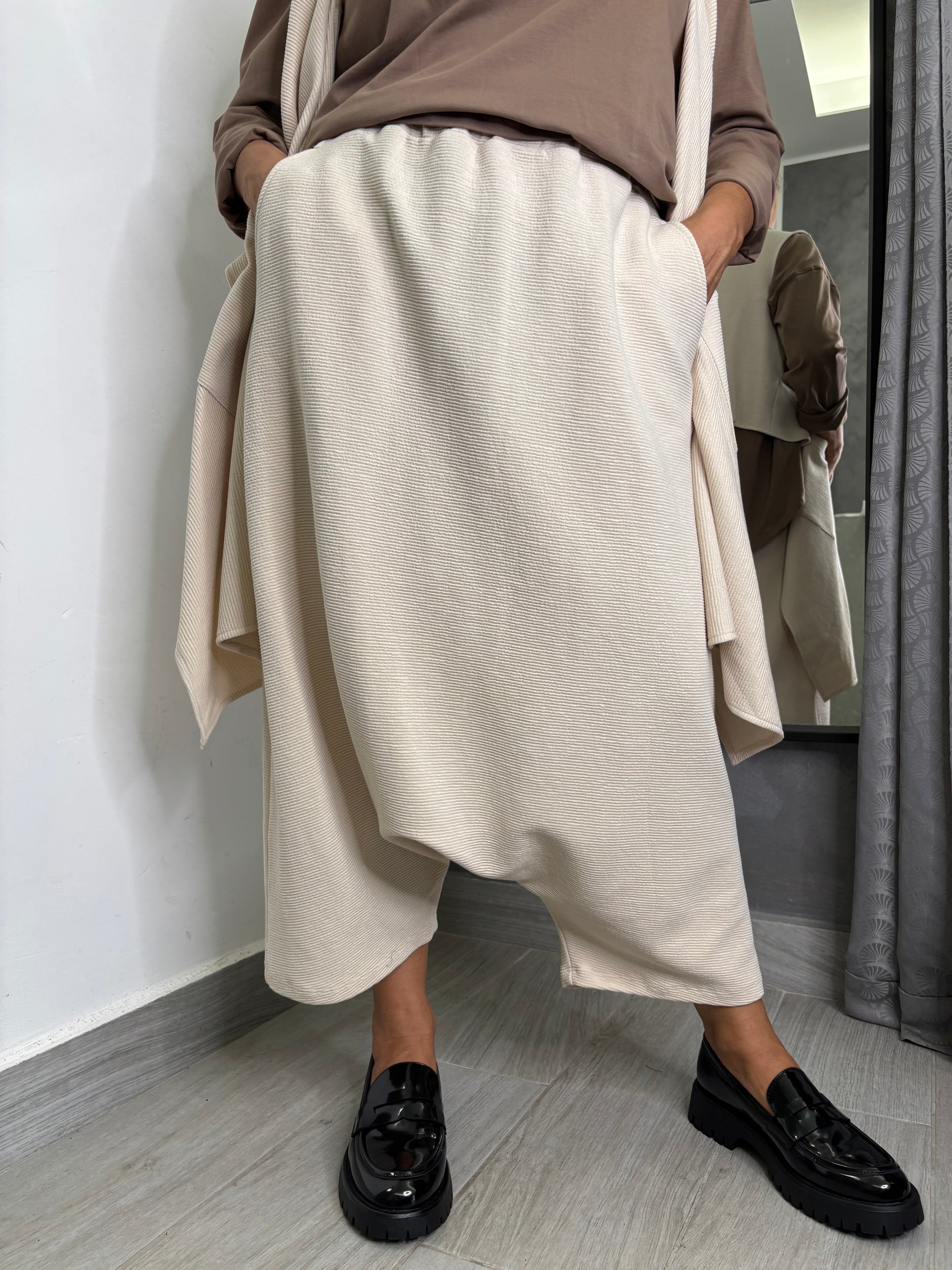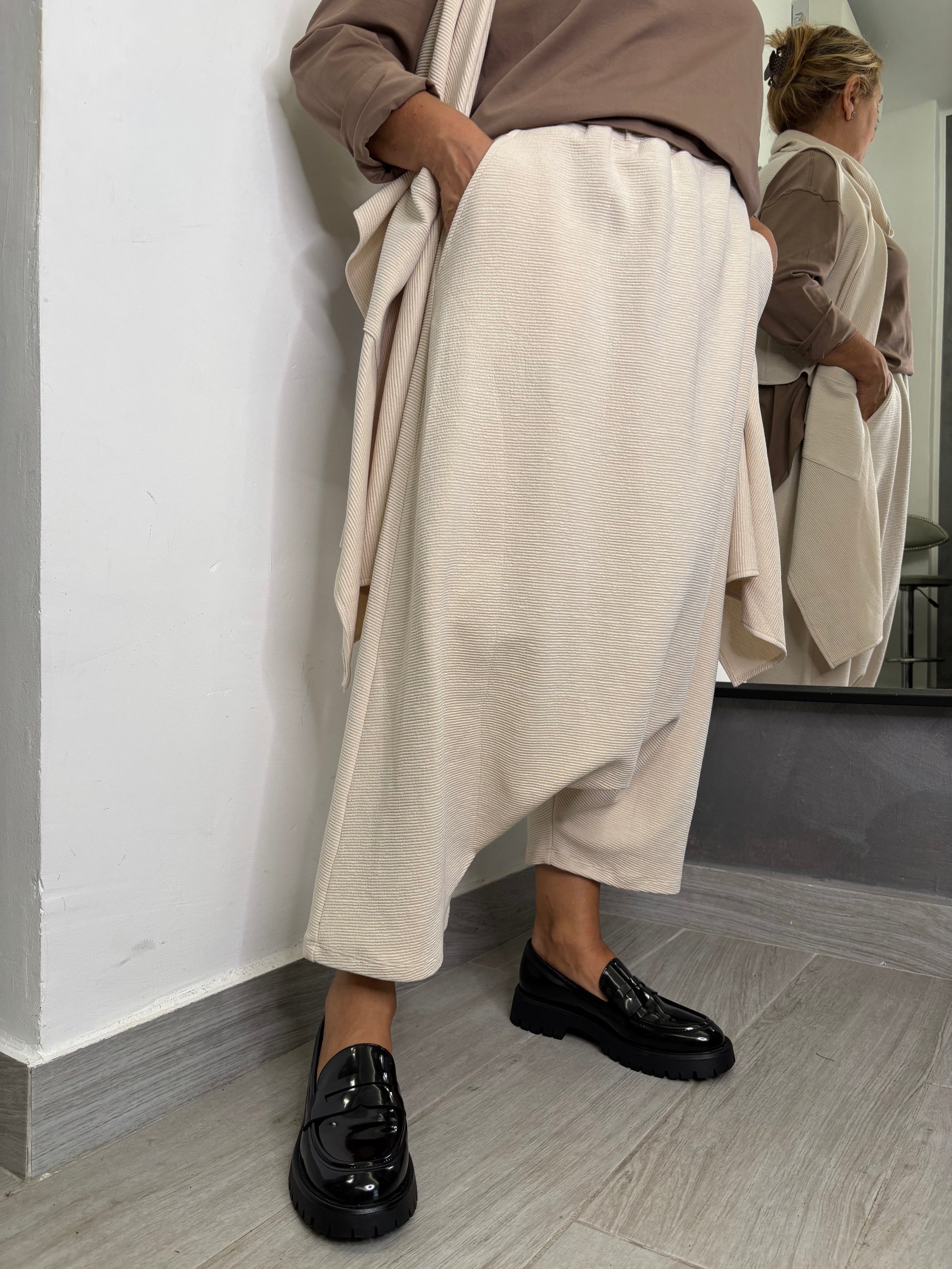 Pantalone a cavallo basso. Tessuto a righe con elastico su tutta la circonferenza vita e tasche trasversali. Taglia unica veste fino ad una 48. Composizione 82% viscosa 15% poliammide 3% elastan.