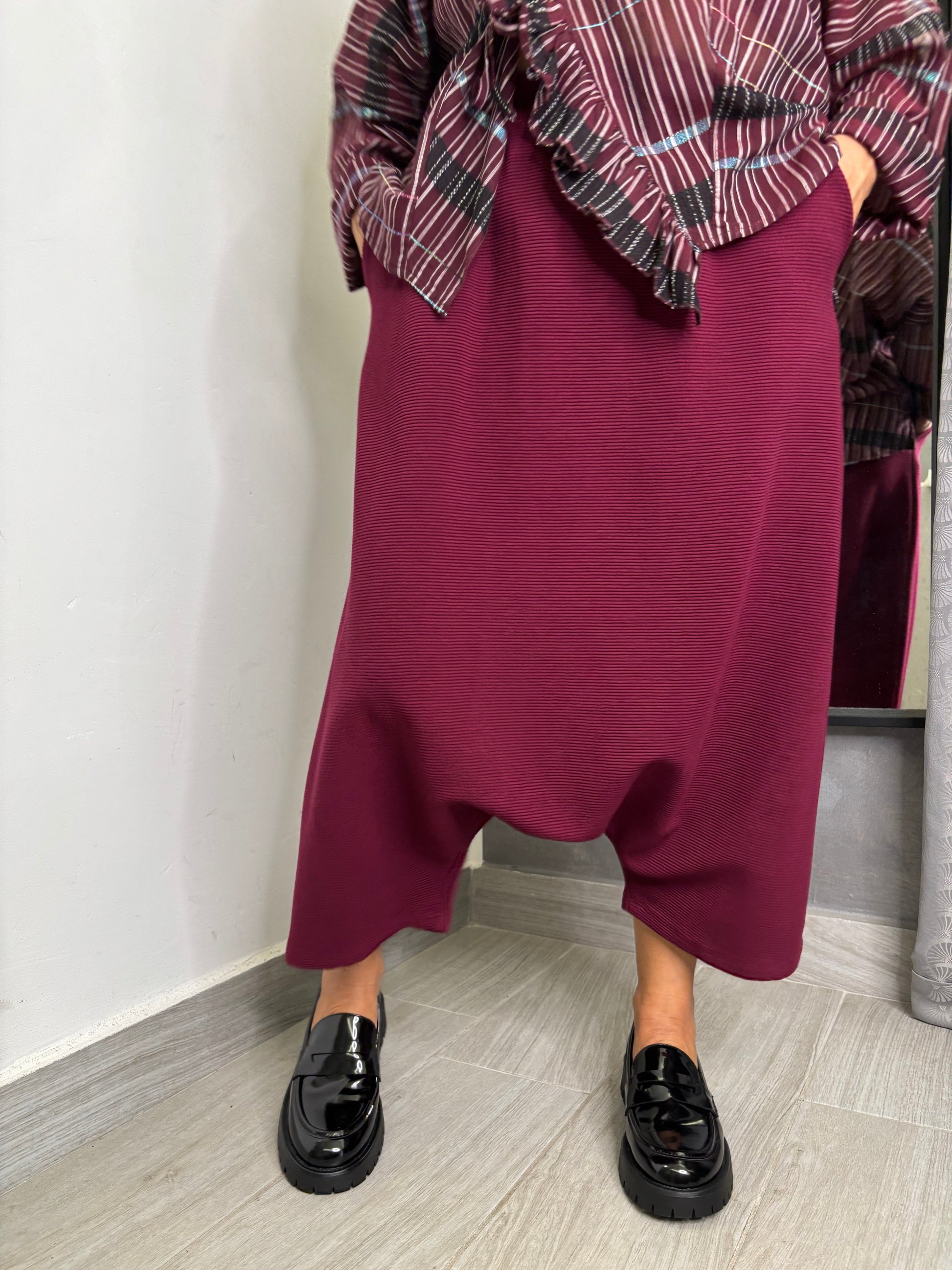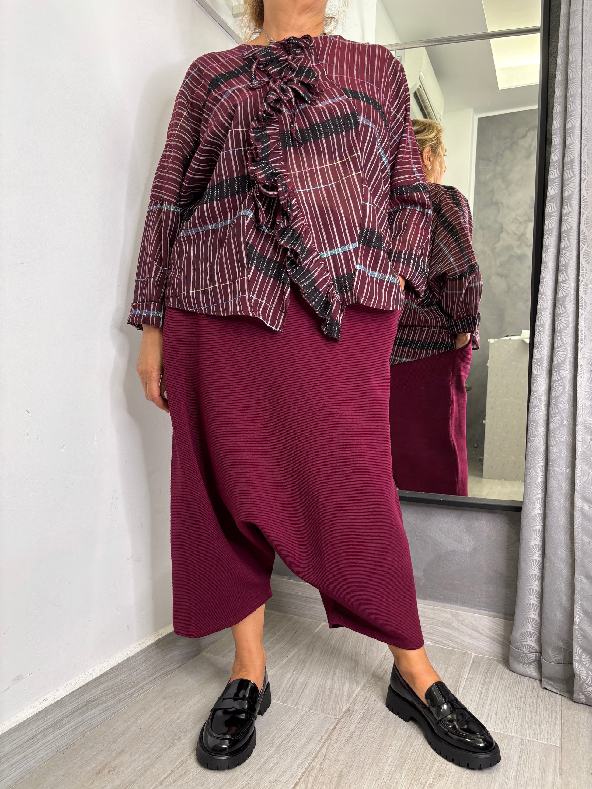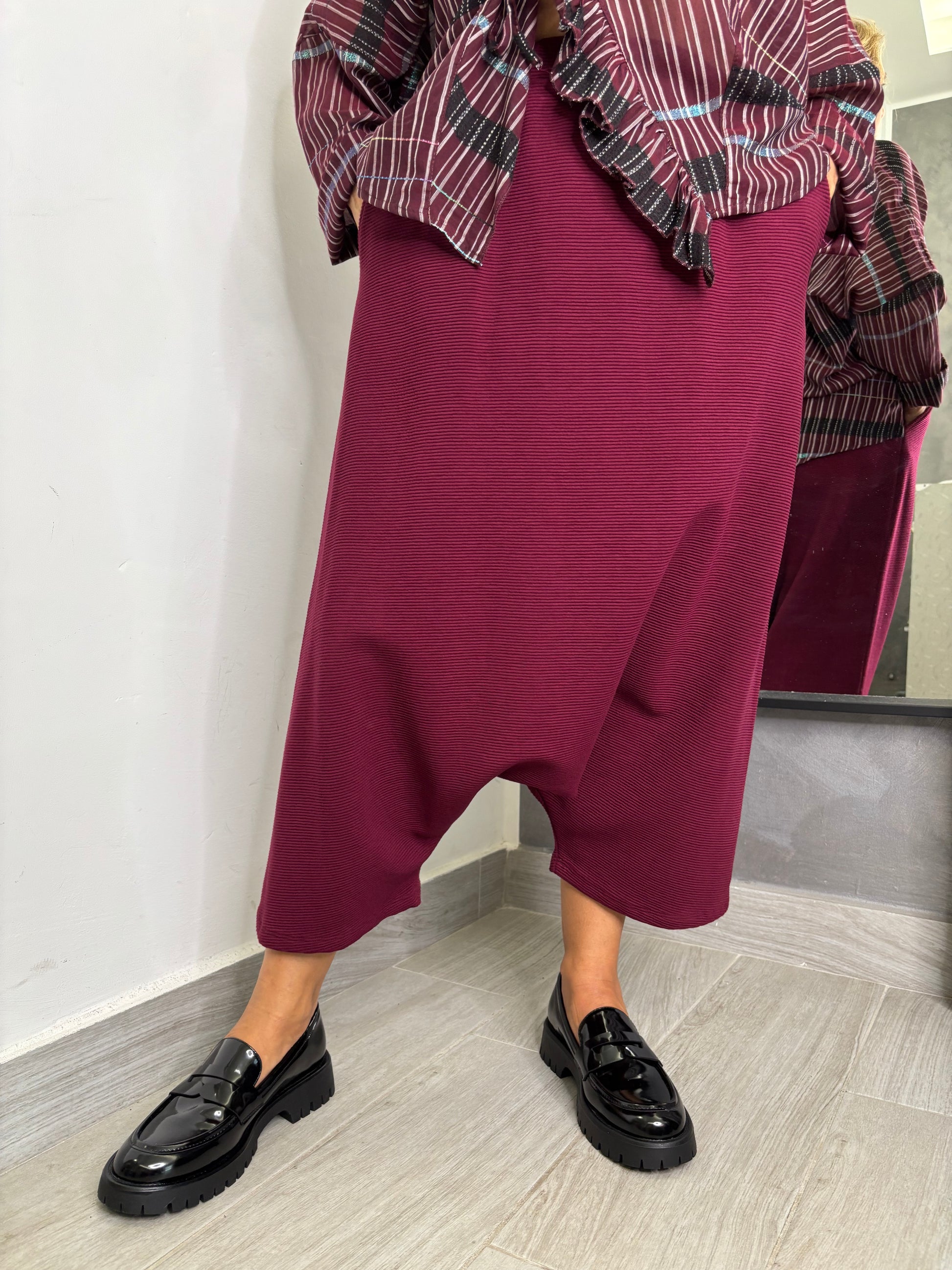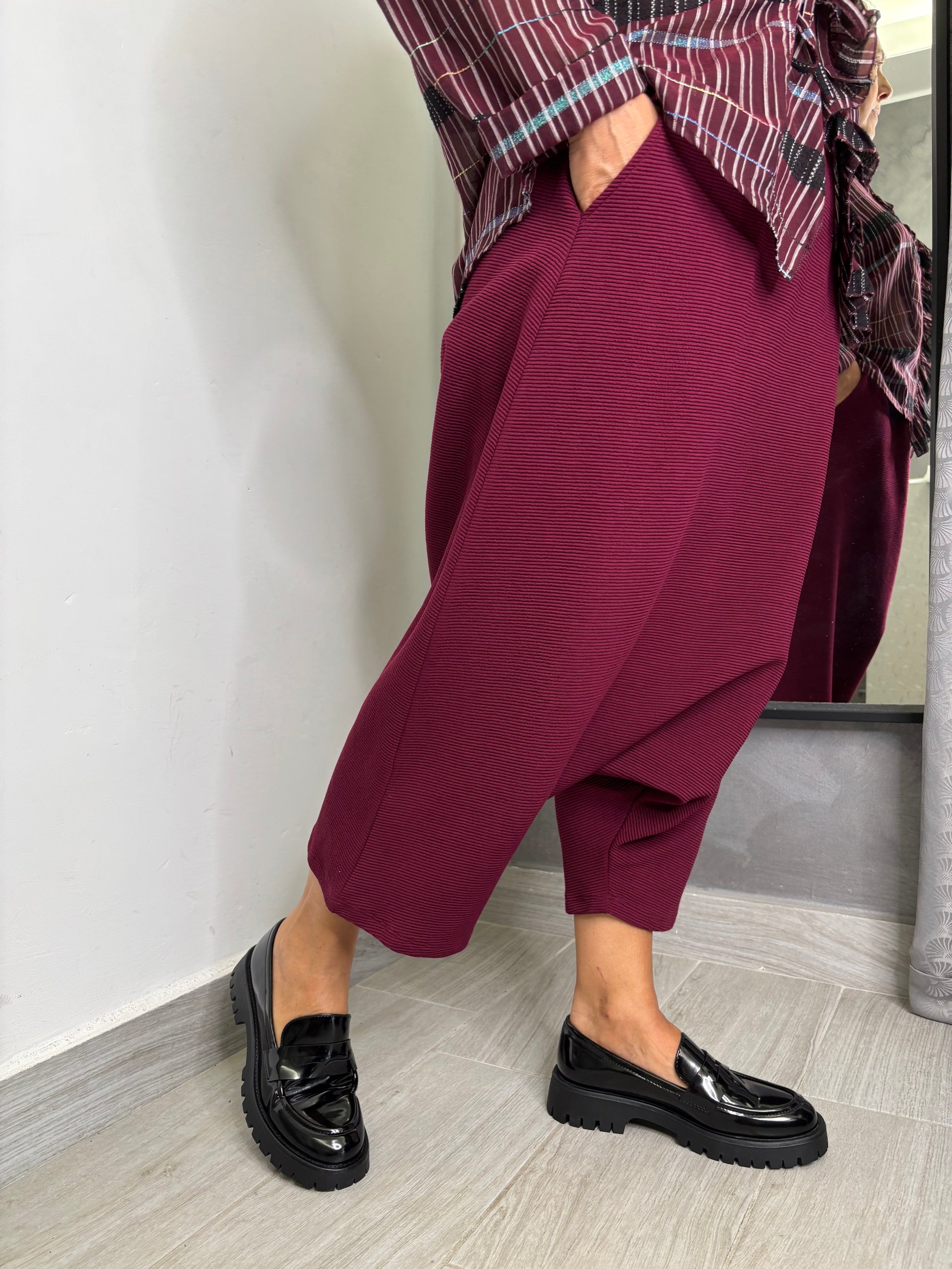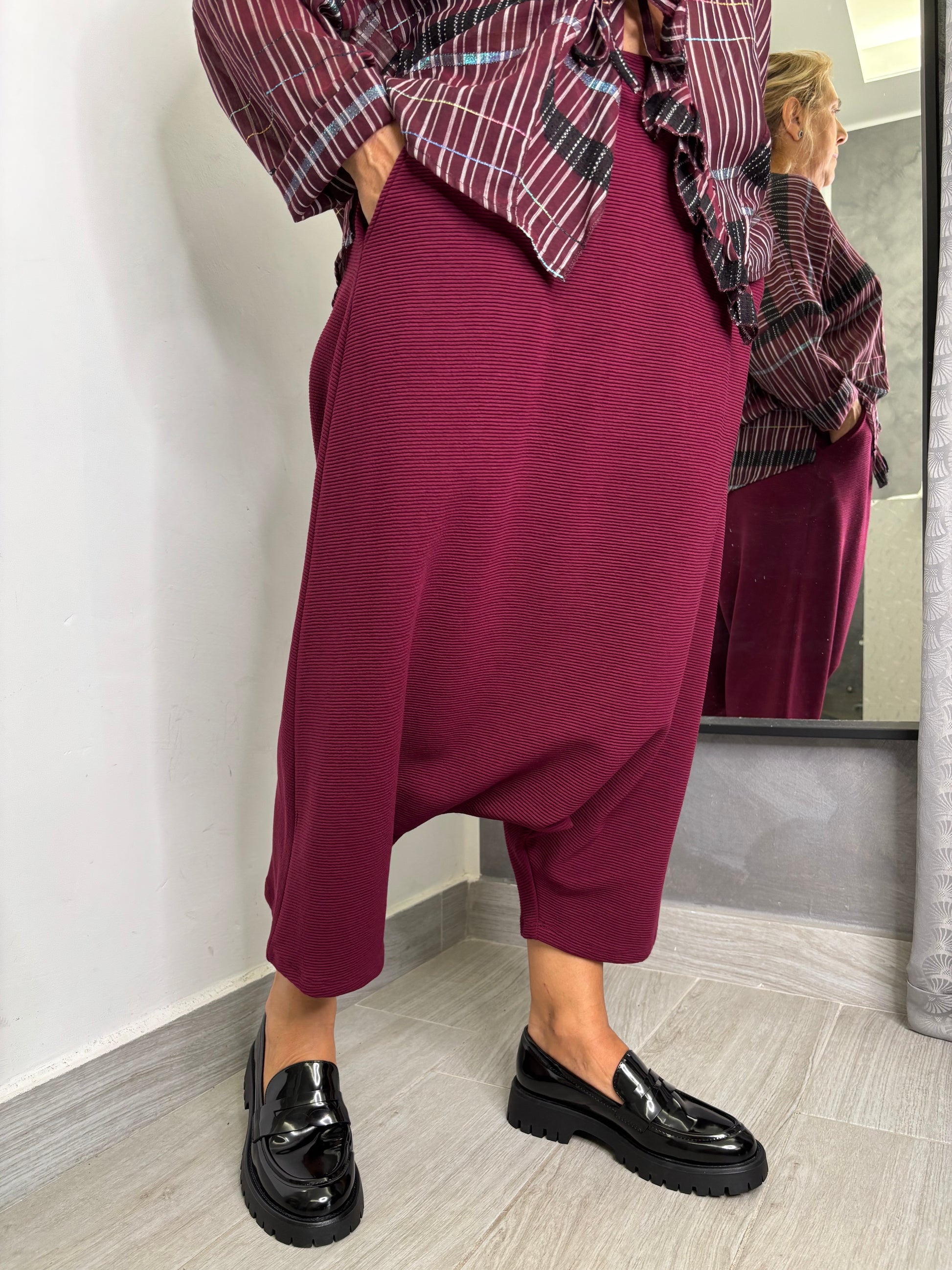 Pantalone a cavallo basso. Tessuto a righe con elastico su tutta la circonferenza vita e tasche trasversali. Taglia unica veste fino ad una 48. Composizione 82% viscosa 15% poliammide 3% elastan.