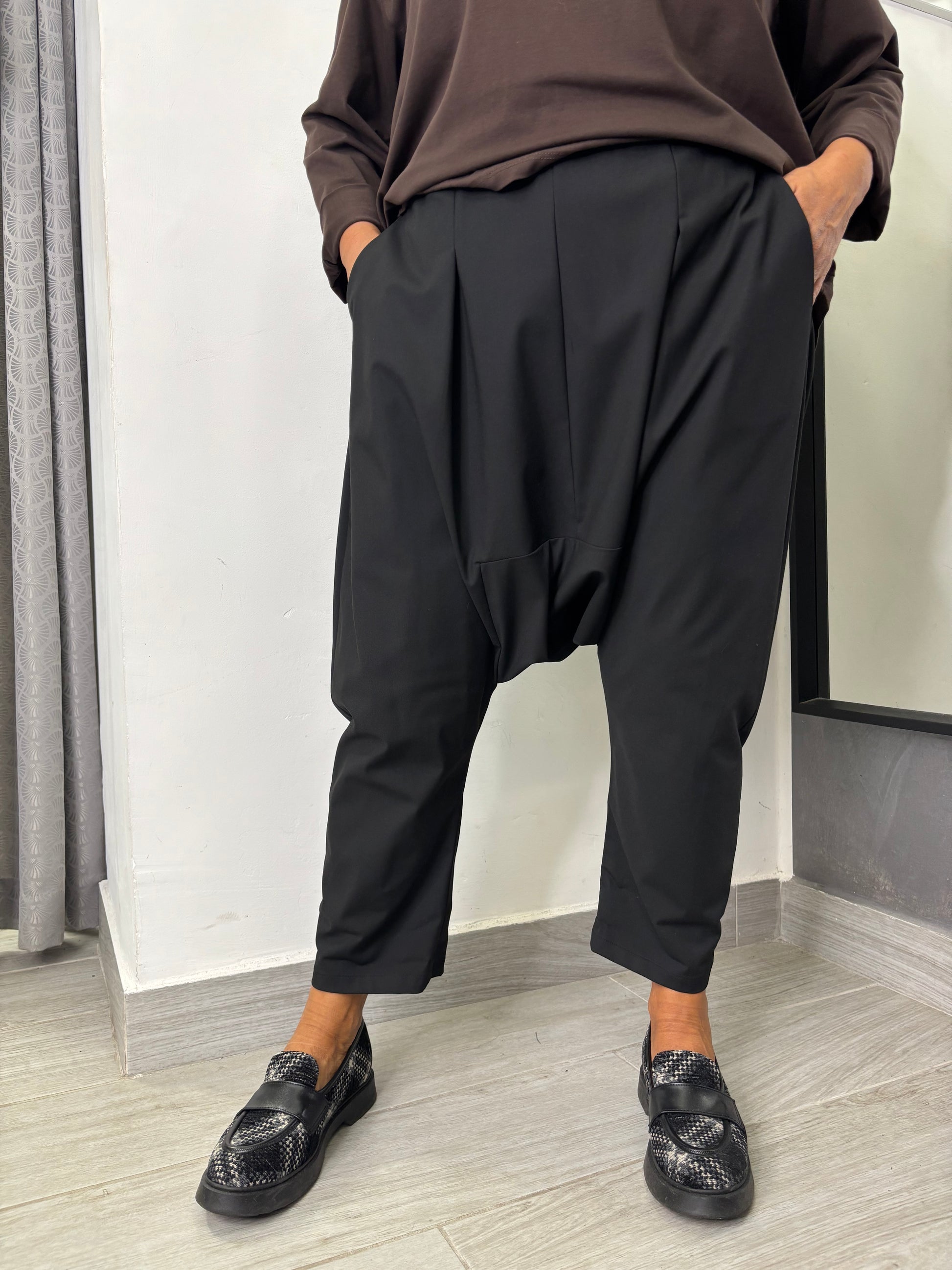 Pantalone a cavallo basso con pieghe cucite in vita e cuciture orizzontale sotto il cavallo, elastico su tutta la circonferenza della vita e tasche trasversali. Taglia unica veste fino ad una 46. Composizione 64% poliestere 33% viscosa 3% elastan