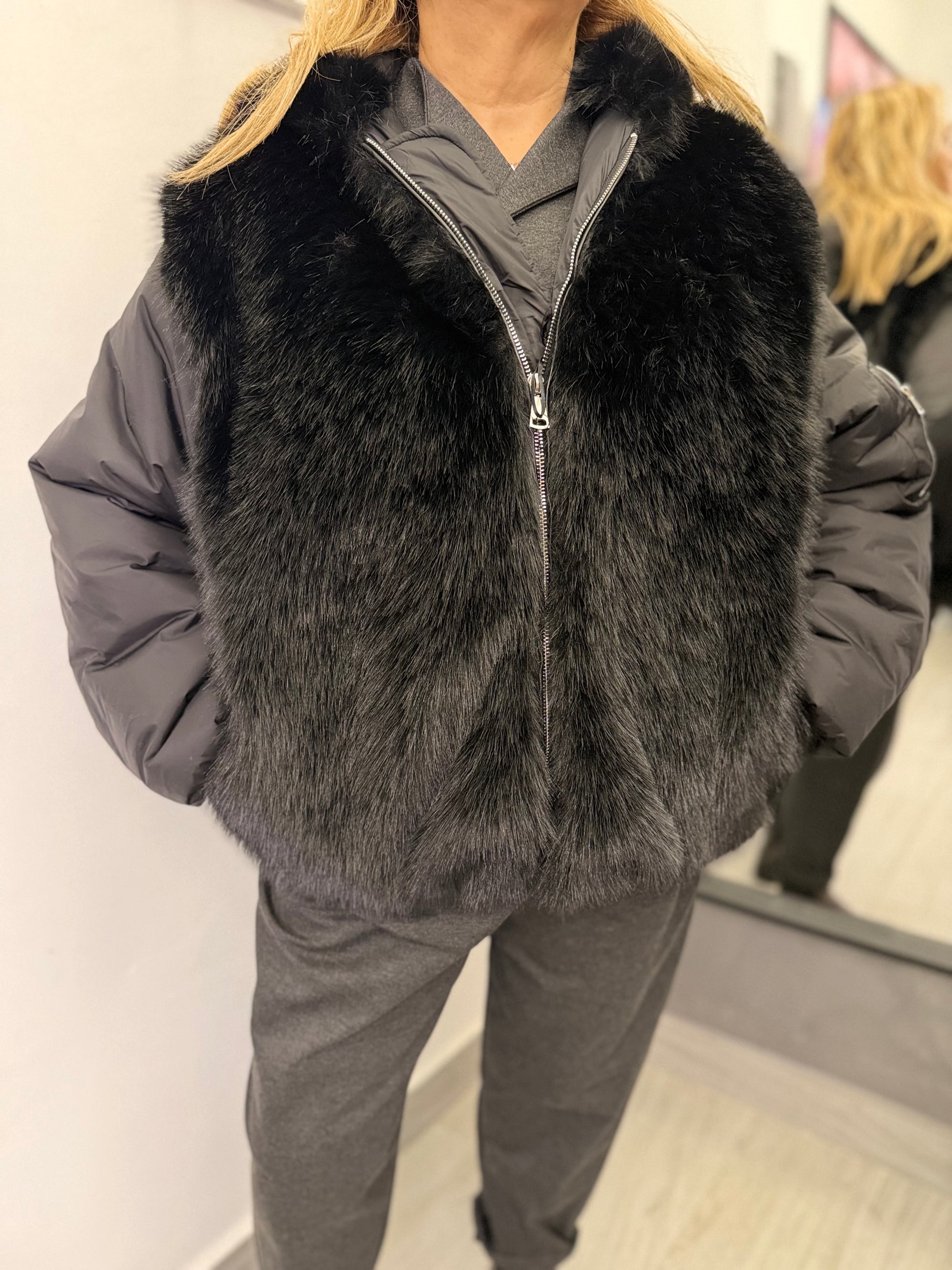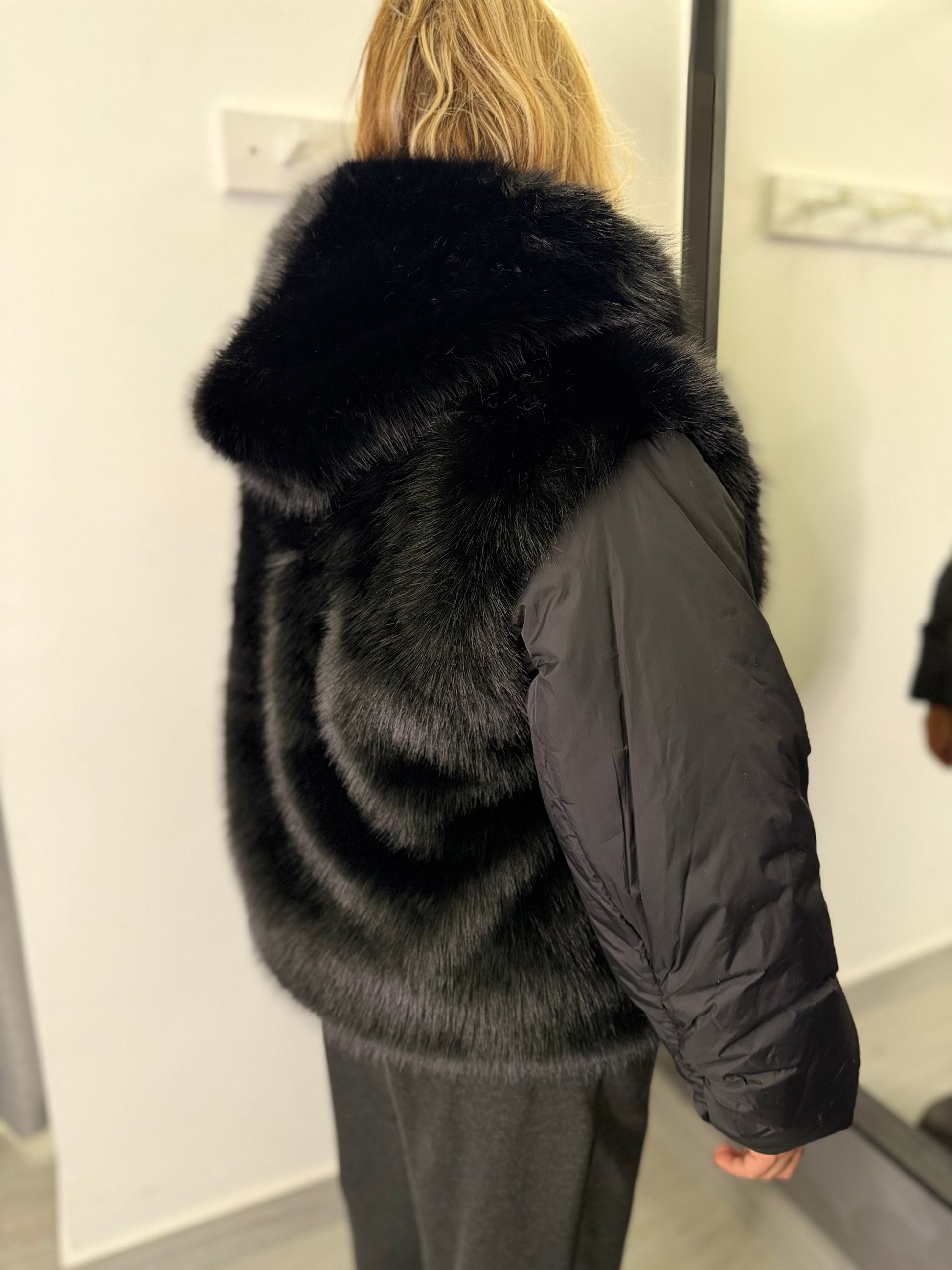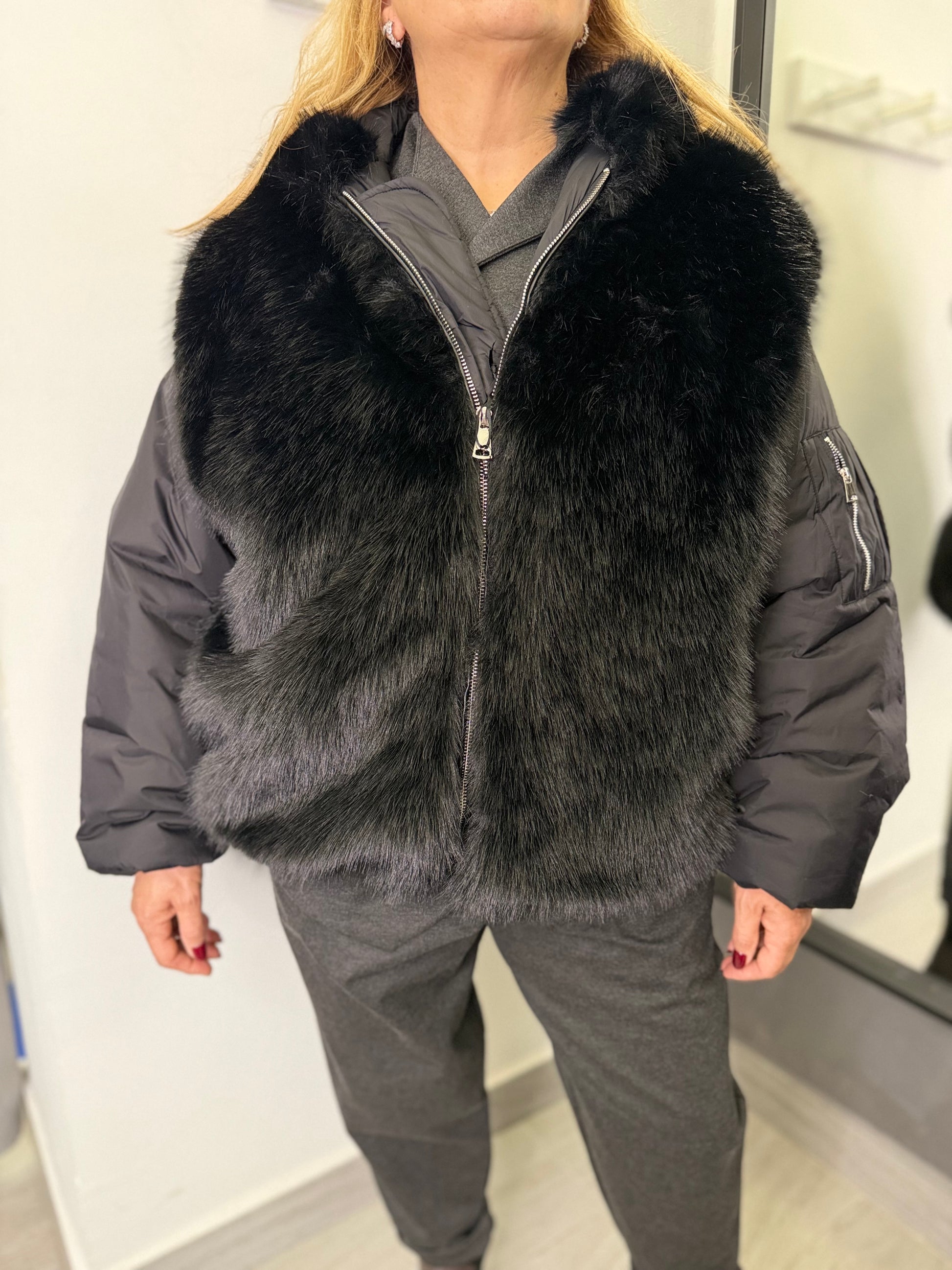 Piumino modello bomber con parte centrale in Ecopelliccia, tutto foderato con tasche laterali, abbottonatura con zip e cappuccio in pelo. Taglia unica veste fino ad una 46/48