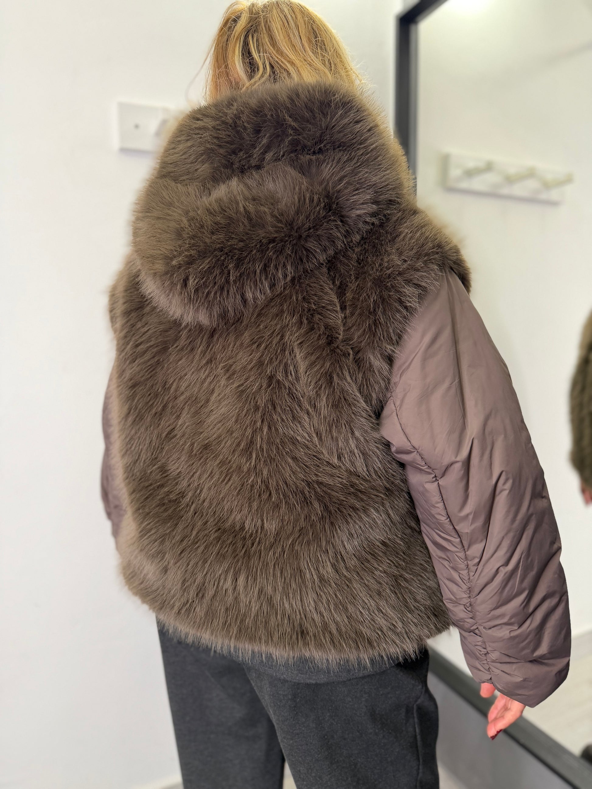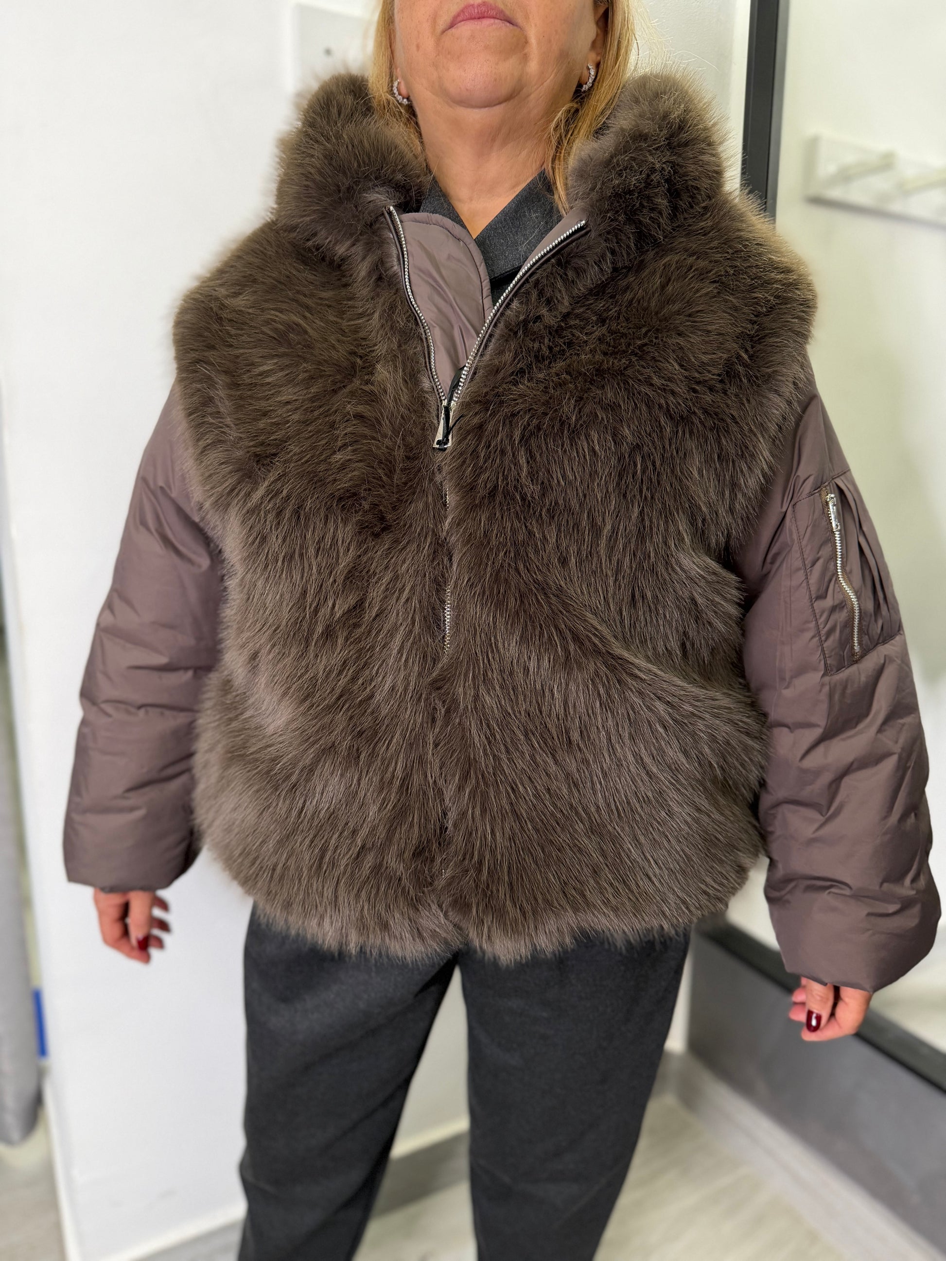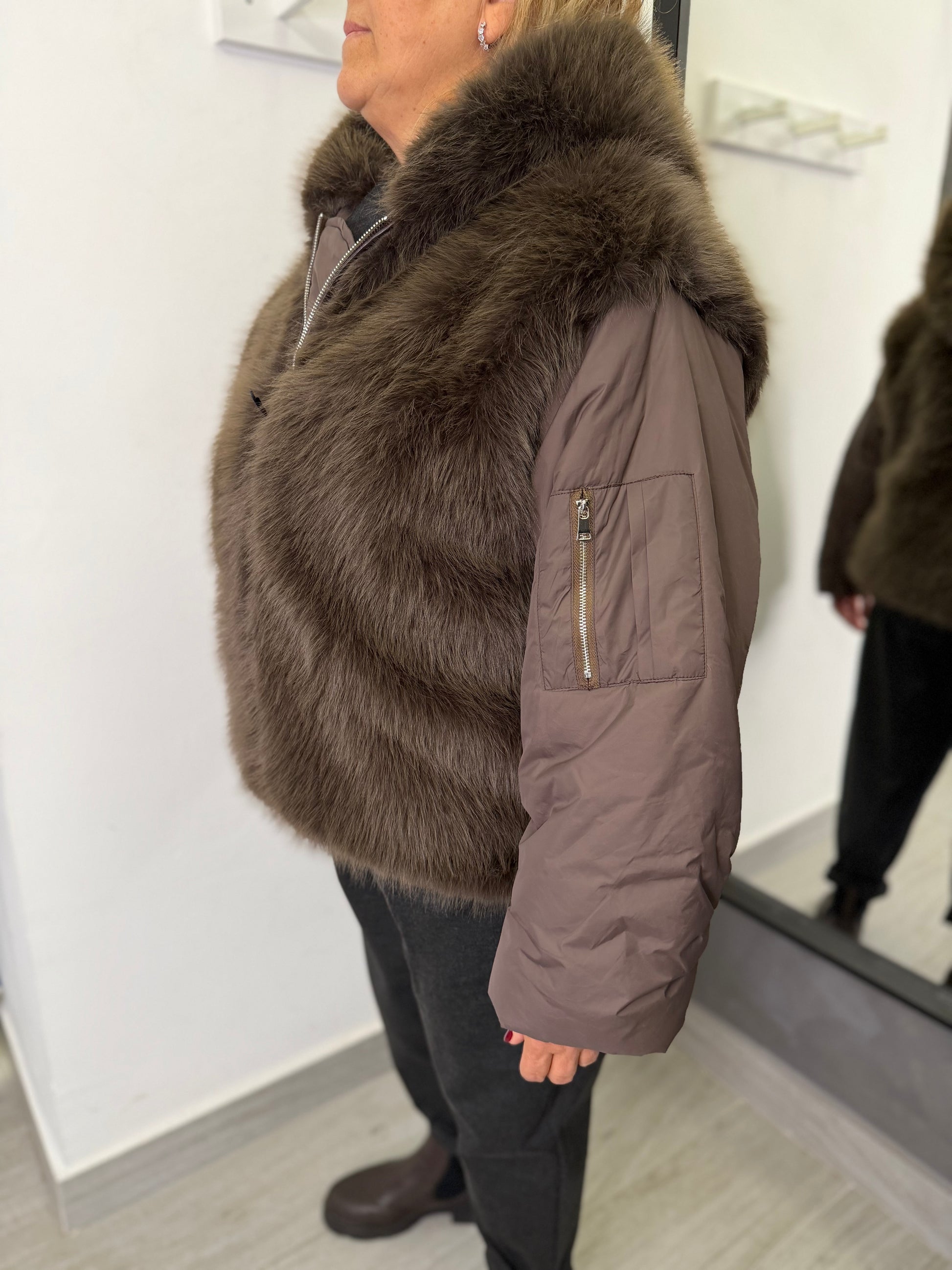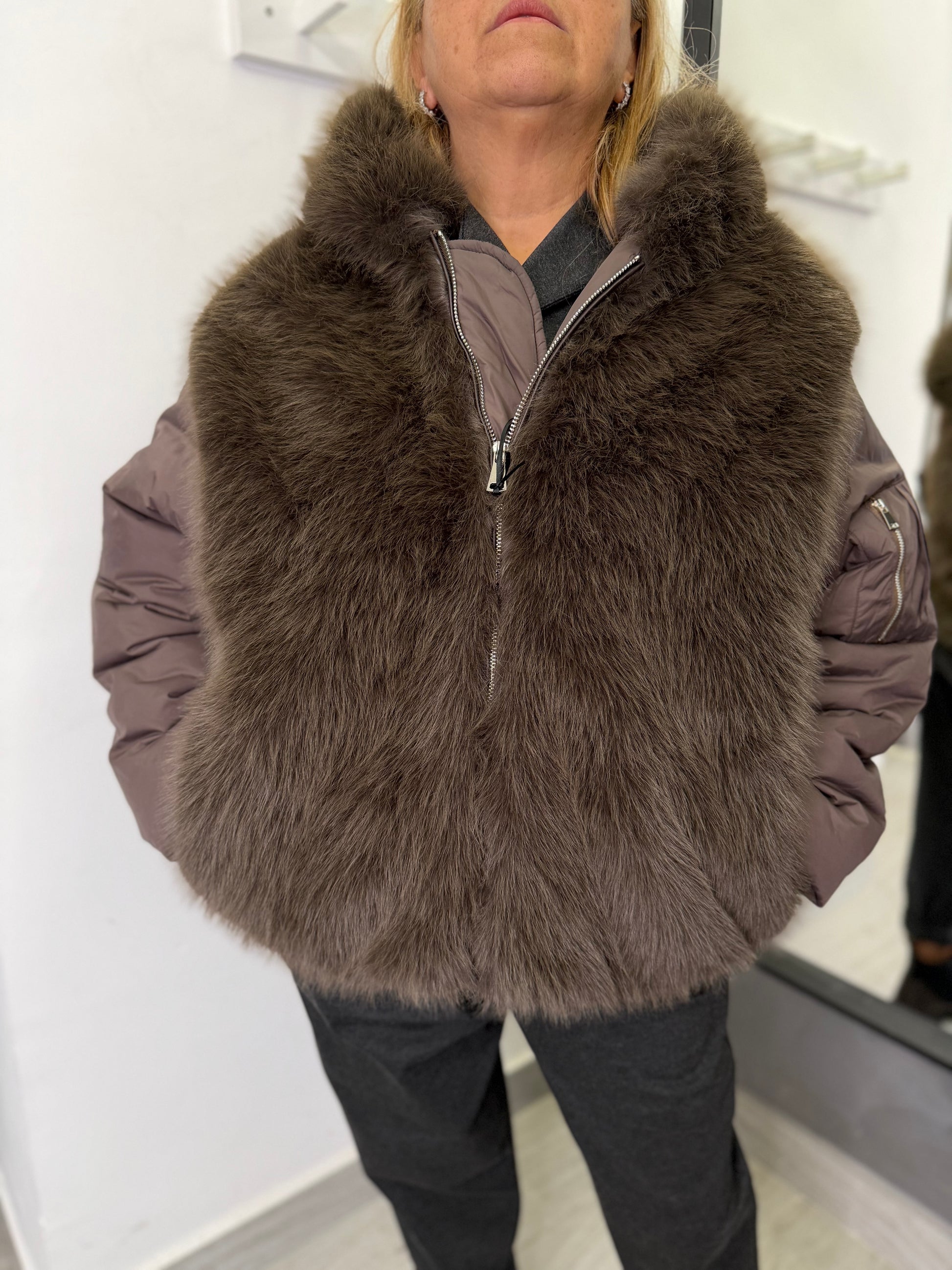 Piumino modello bomber con parte centrale in Ecopelliccia, tutto foderato con tasche laterali, abbottonatura con zip e cappuccio in pelo. Taglia unica veste fino ad una 46/48