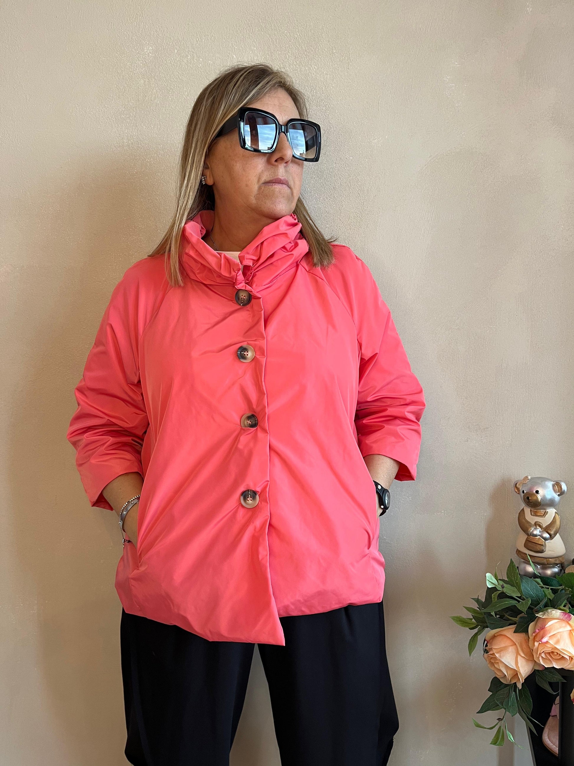 Spolverino in tessuto tecnico con collo alla coreana, manica a 3/4, abbottonatura con bottoni, tasche laterali e piegone a soffietto nella parte centrale dietro. Taglia unica veste fino ad una 46/48. Composizione 100 poliestere