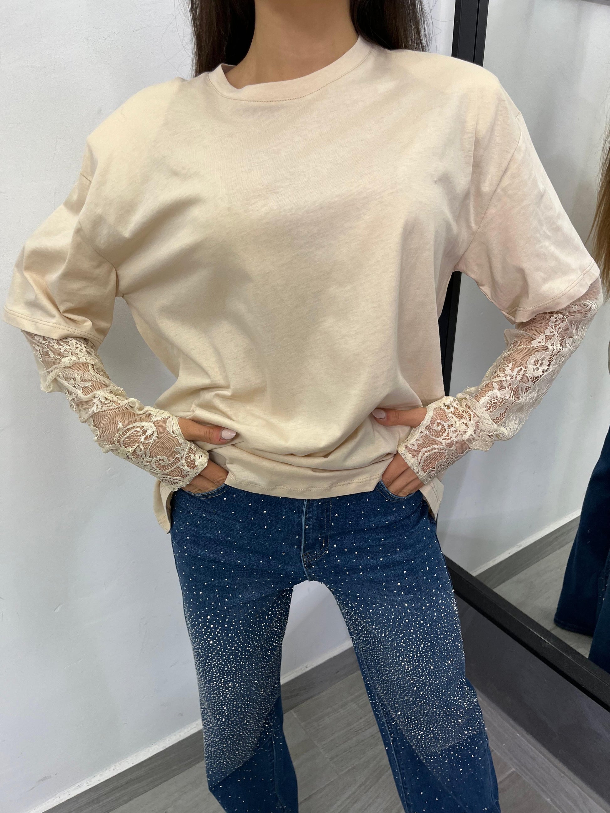 T-shirt a manica corta con manicotti in pizzo, a guanto. Spalla con imbottitura.Taglia unica veste fino a una 48.