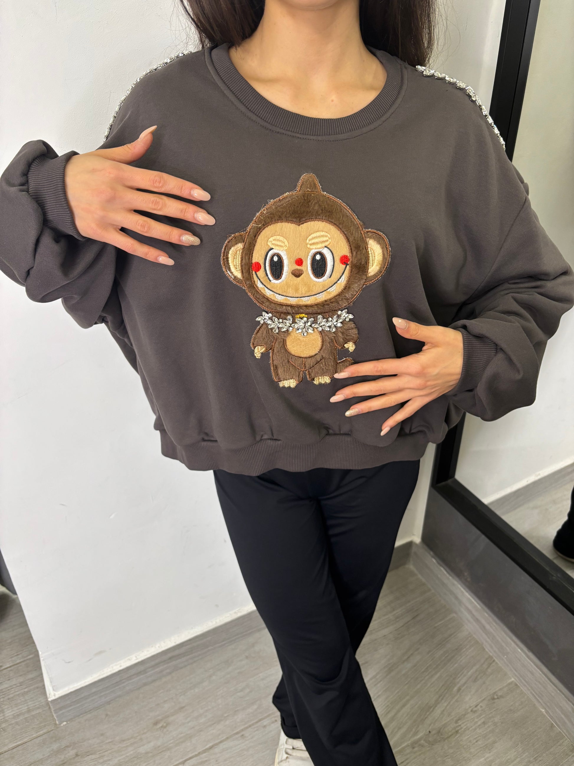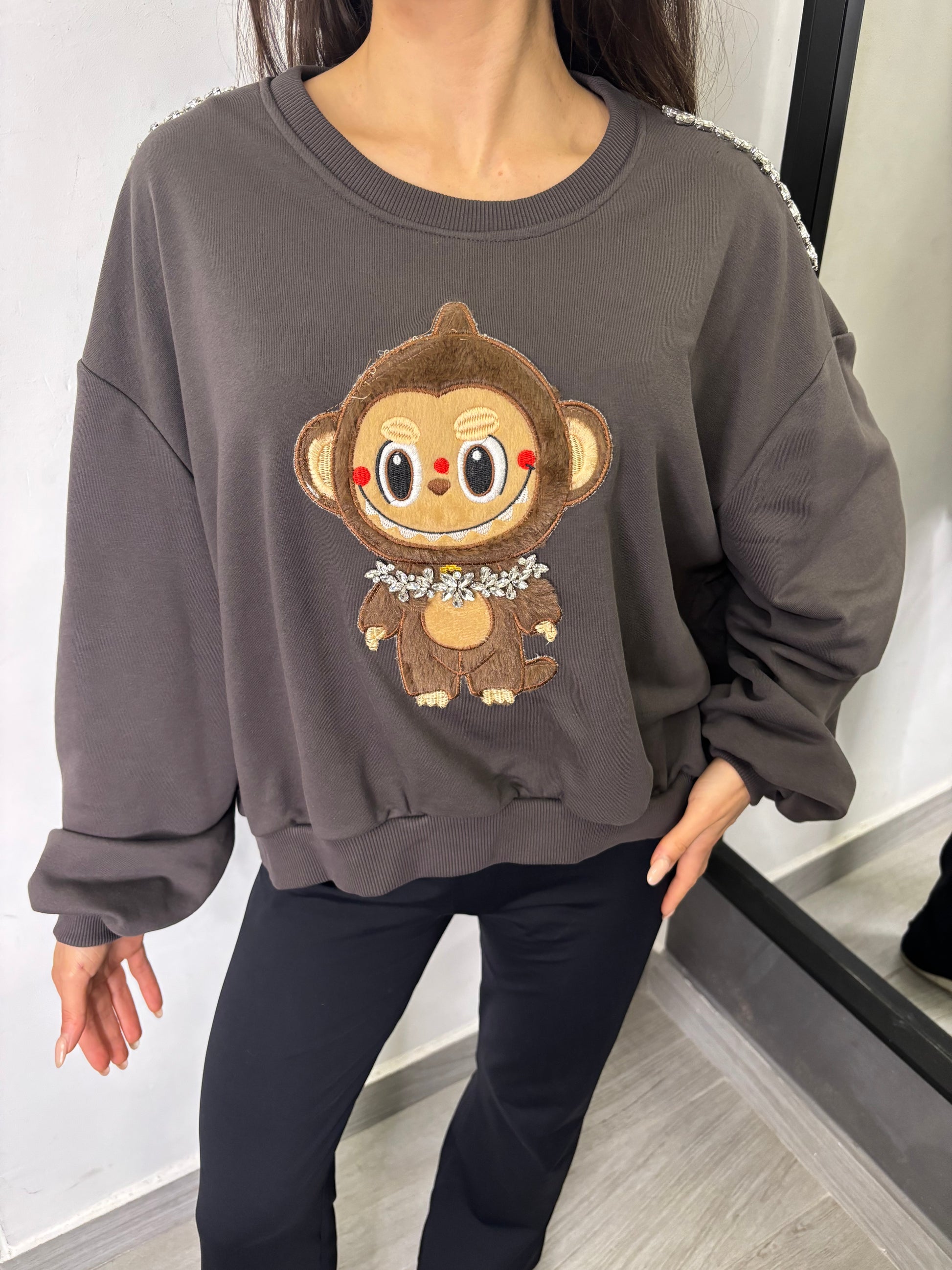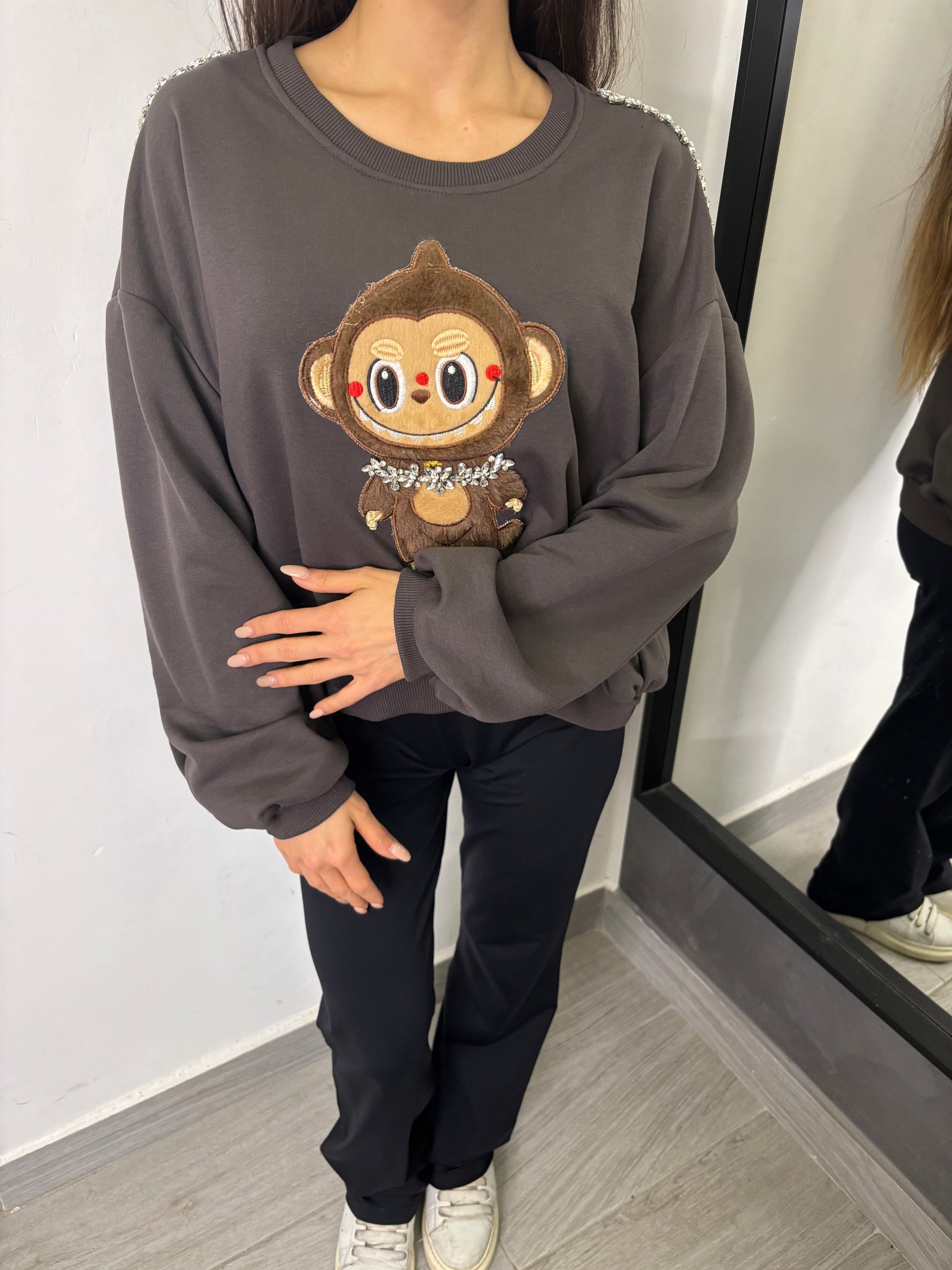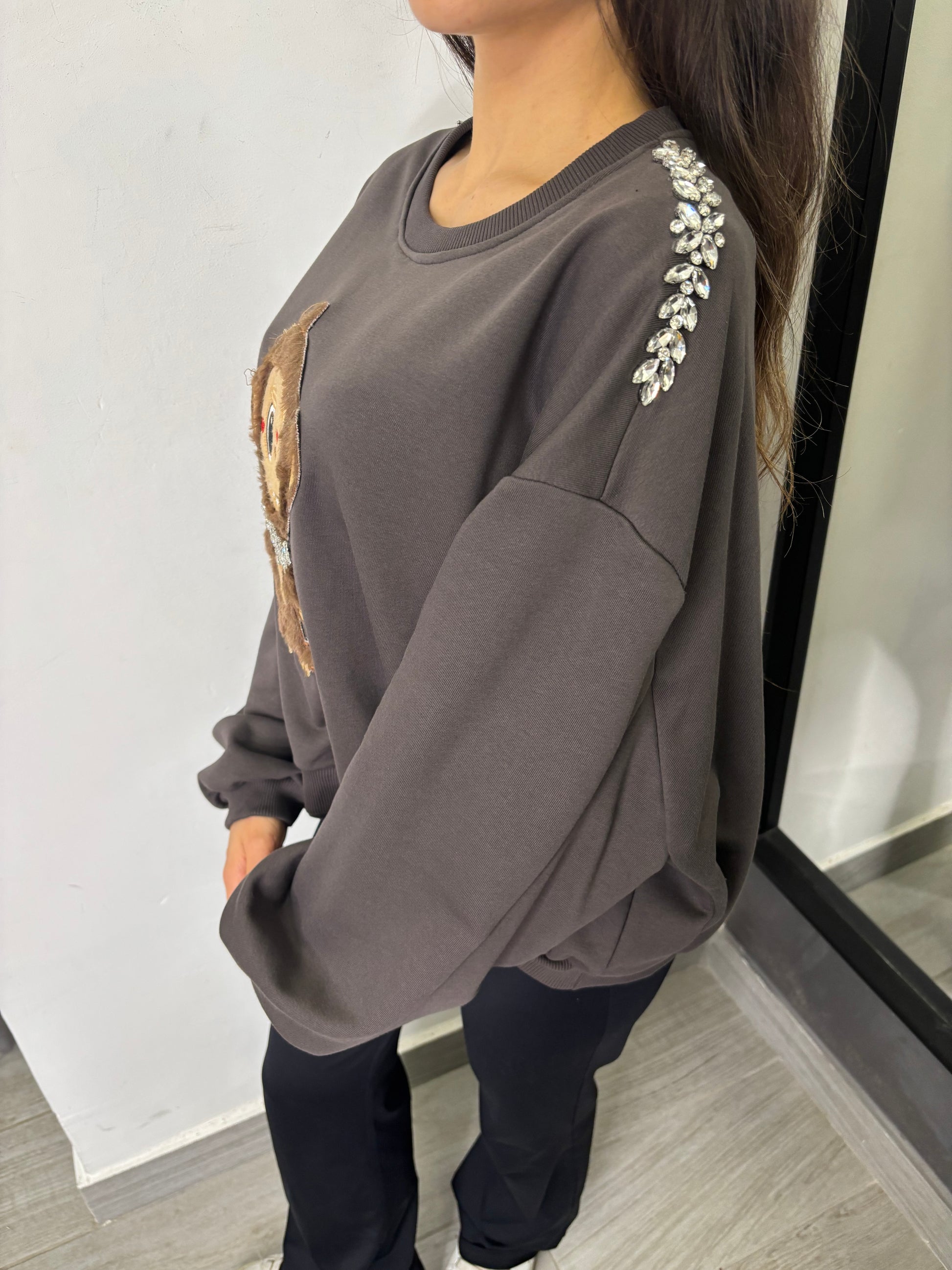 Felpa garzata a giro collo con stampa davanti e caboscion sulle spalle . Modello over. Taglia unica veste fino ad una 46. Composizione 65% cotone 35% poliestere