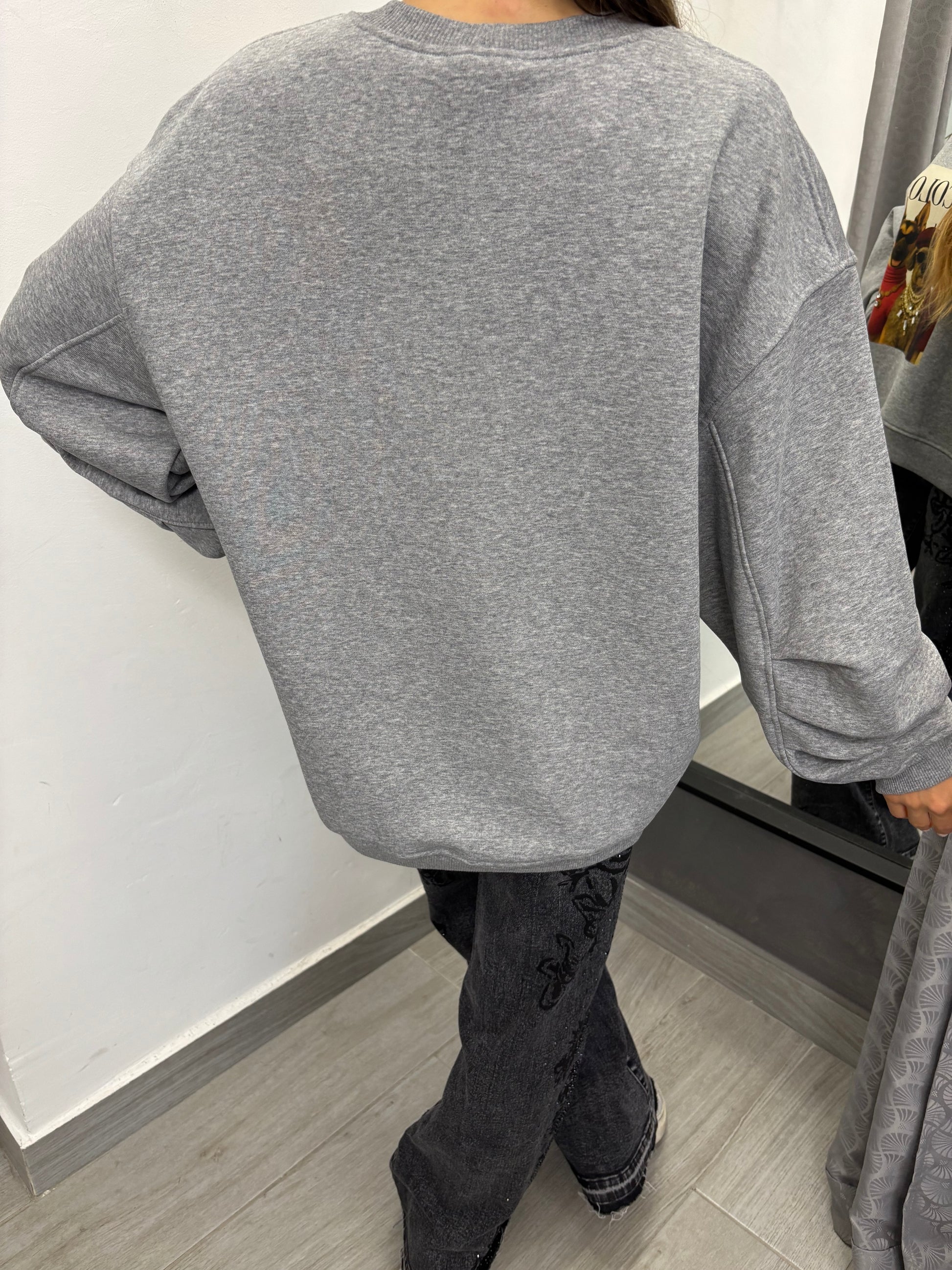 Felpa modello oversize, più corta davanti e più lunga dietro, manica leggermente arricciata sul dietro del gomito, stampa davanti con cani e pietre in silver. Composizione 60% cotone 40% poliestere