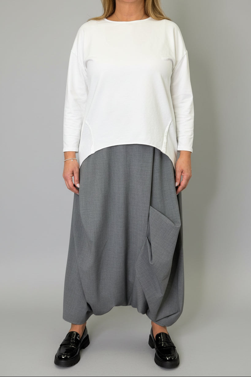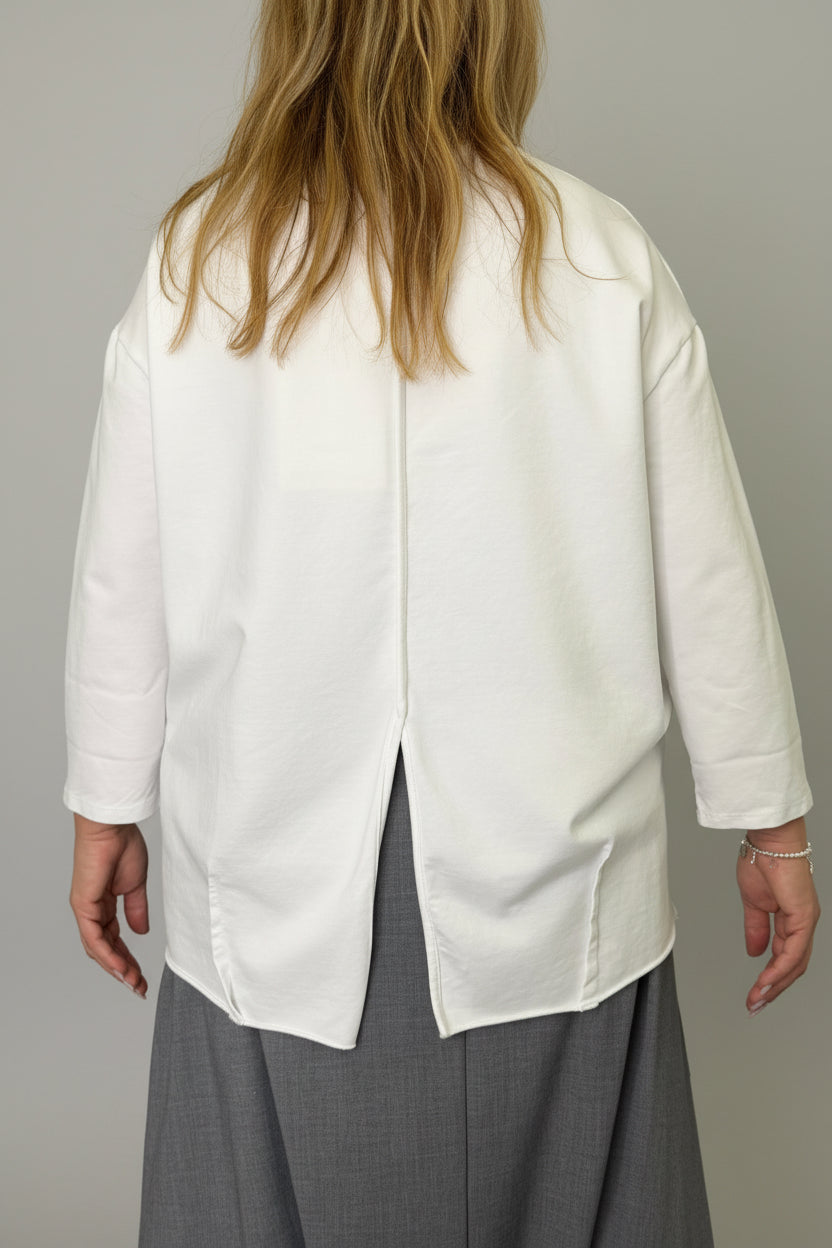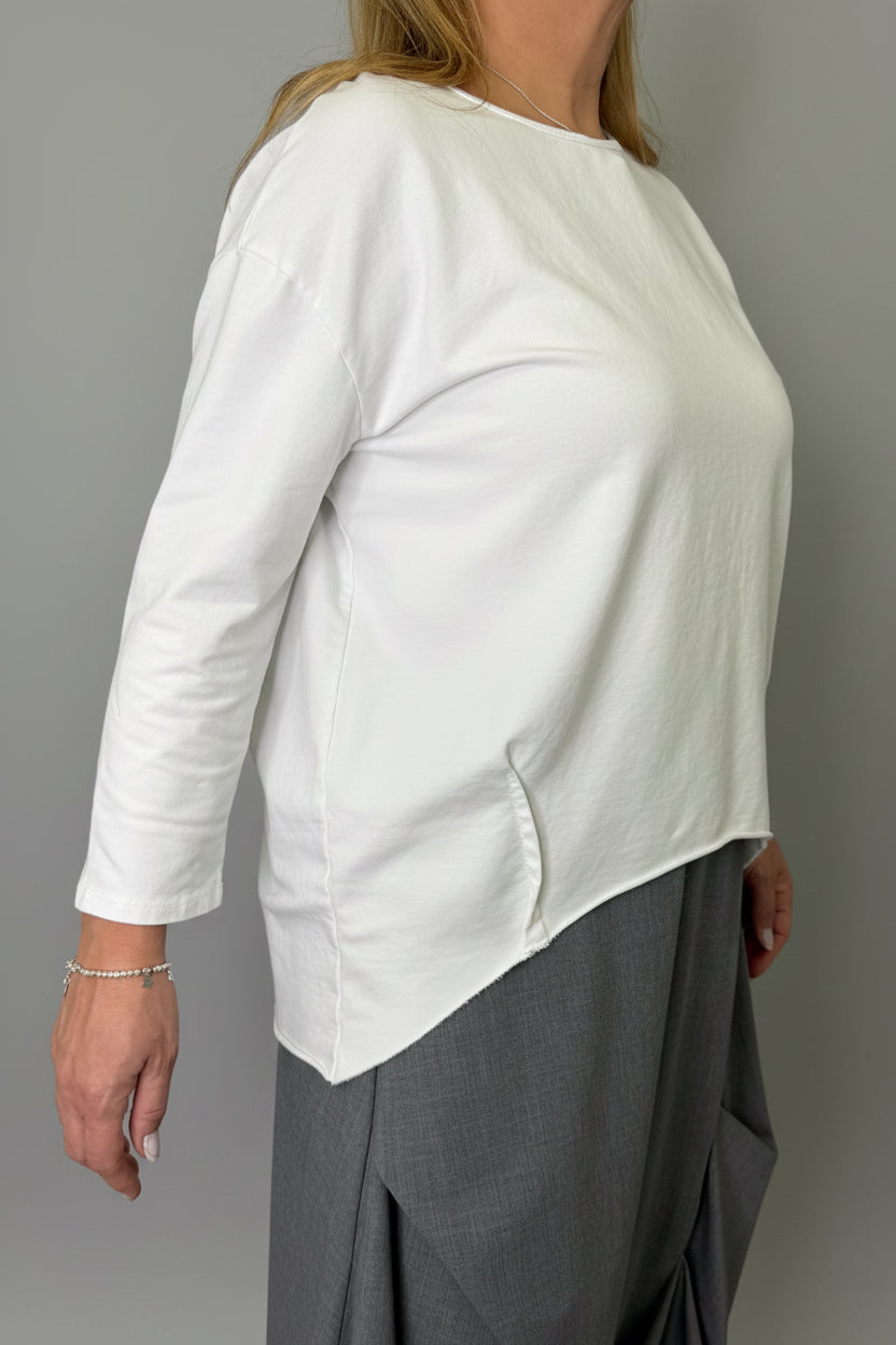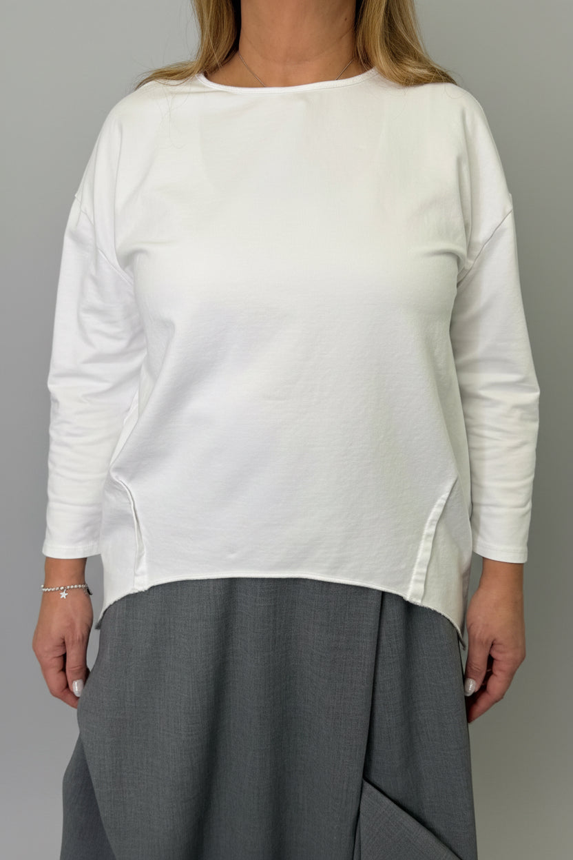 Maglia in tessuto garzato, con pencies nel fondo con taglio vivo e stondatura nel davanti. Taglia unica veste fino ad una 46. Composizione 95% cotone 5% elastan.