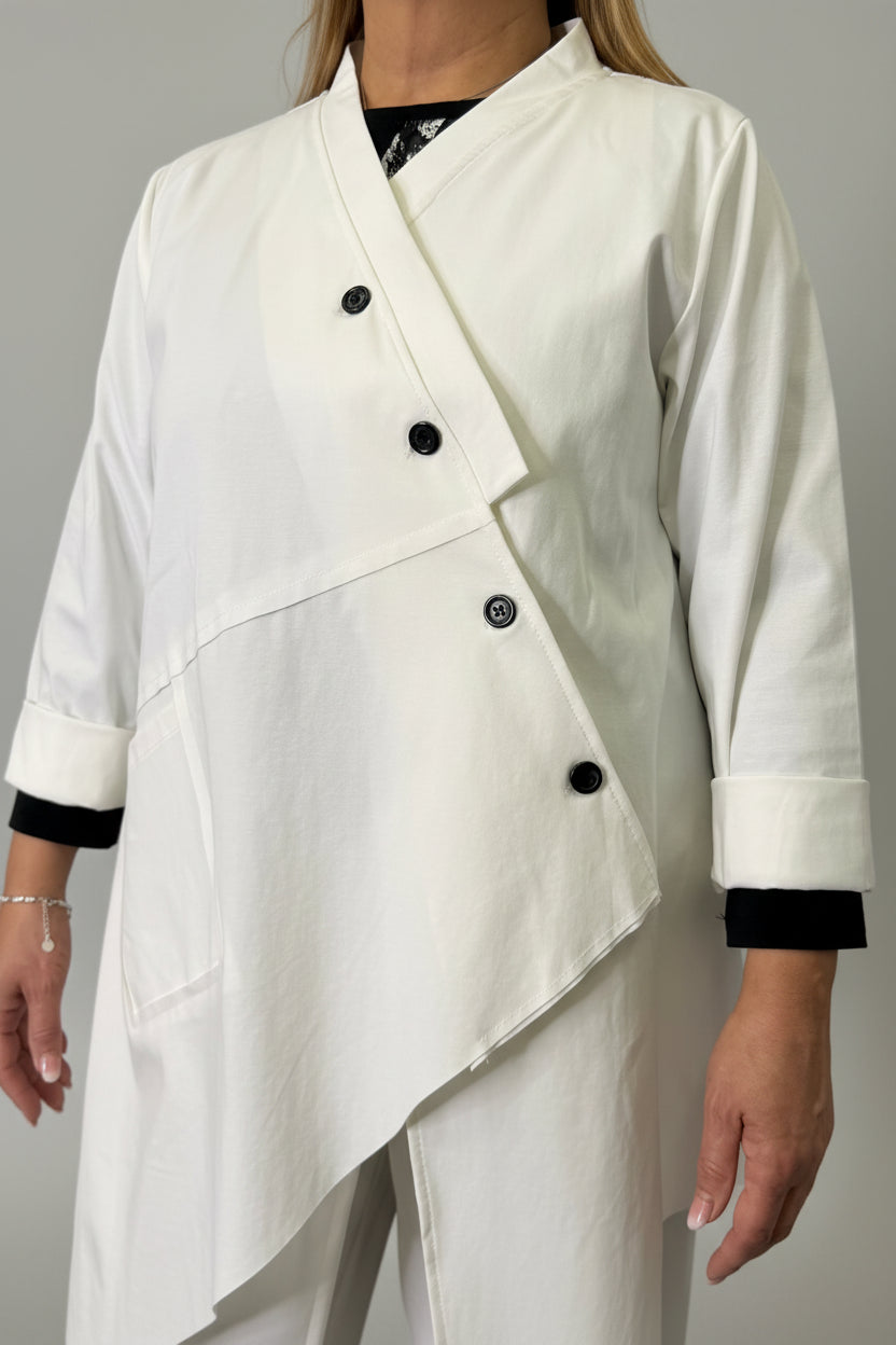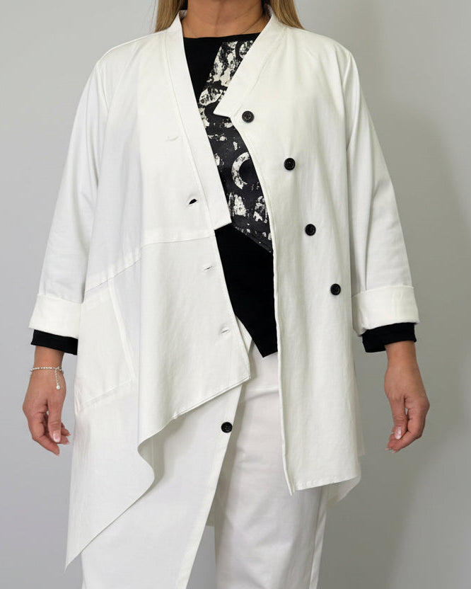 Giacca in tessuto punto Milano, scollo a V, abbottonatura trasversale. Taglia unica veste fino ad una 48. Composizione 53% cotone 38% poliammide 9% elastan