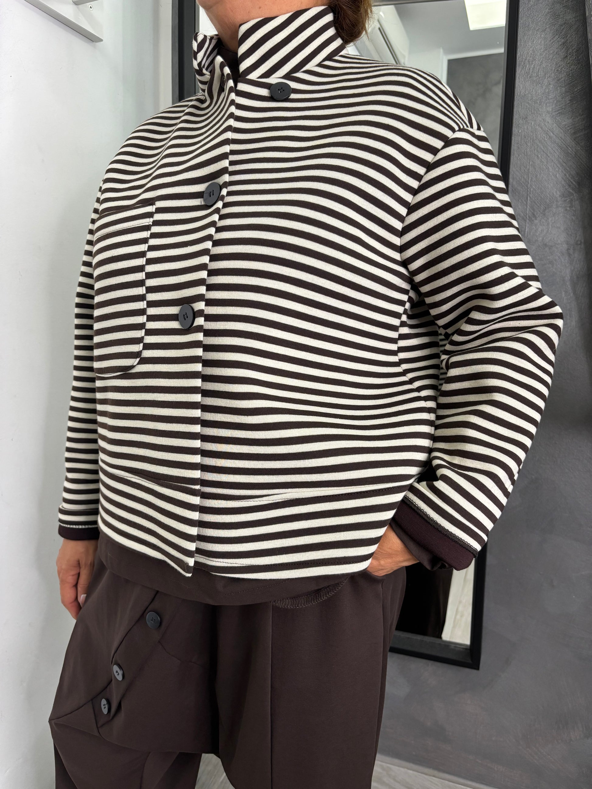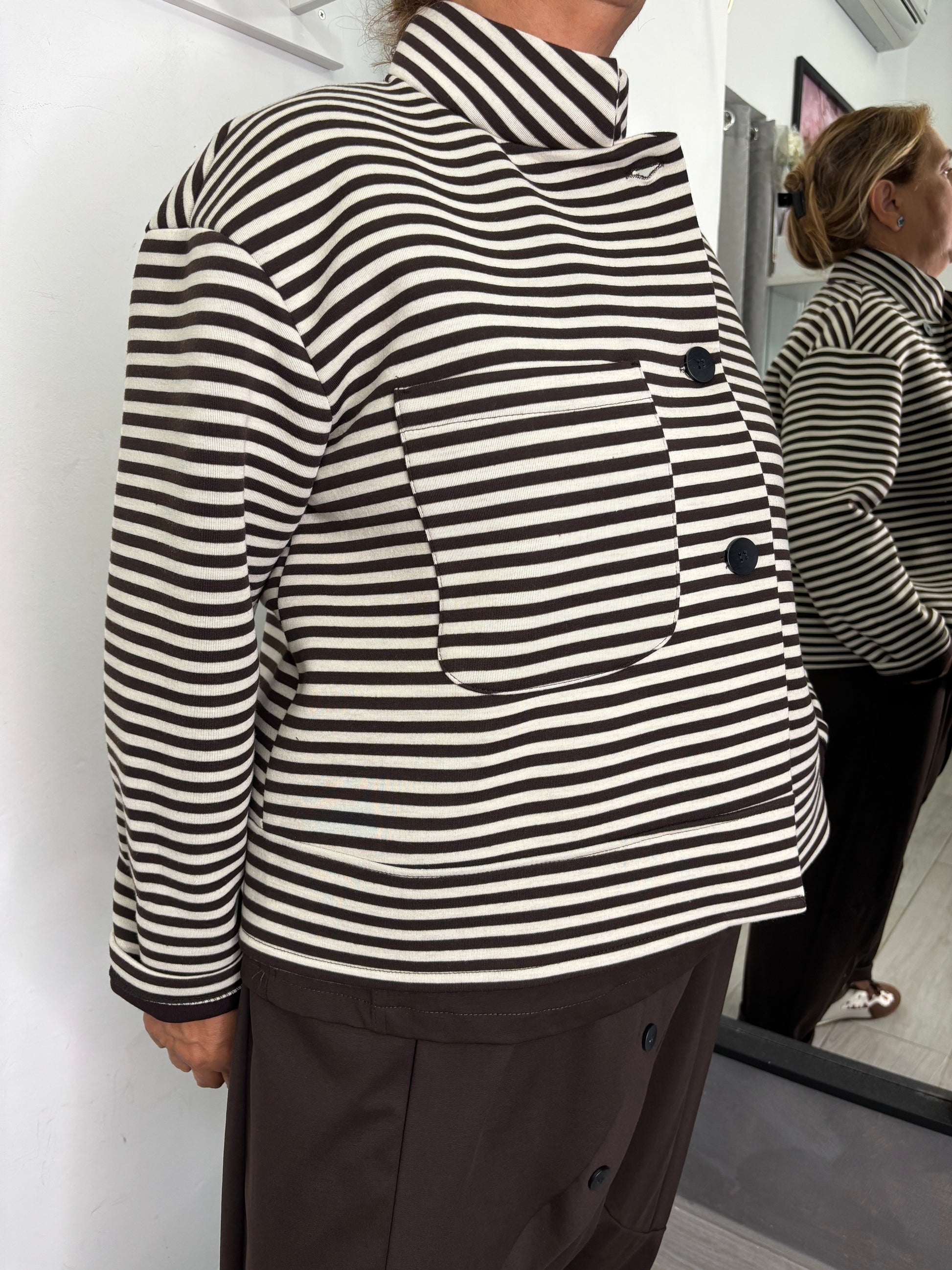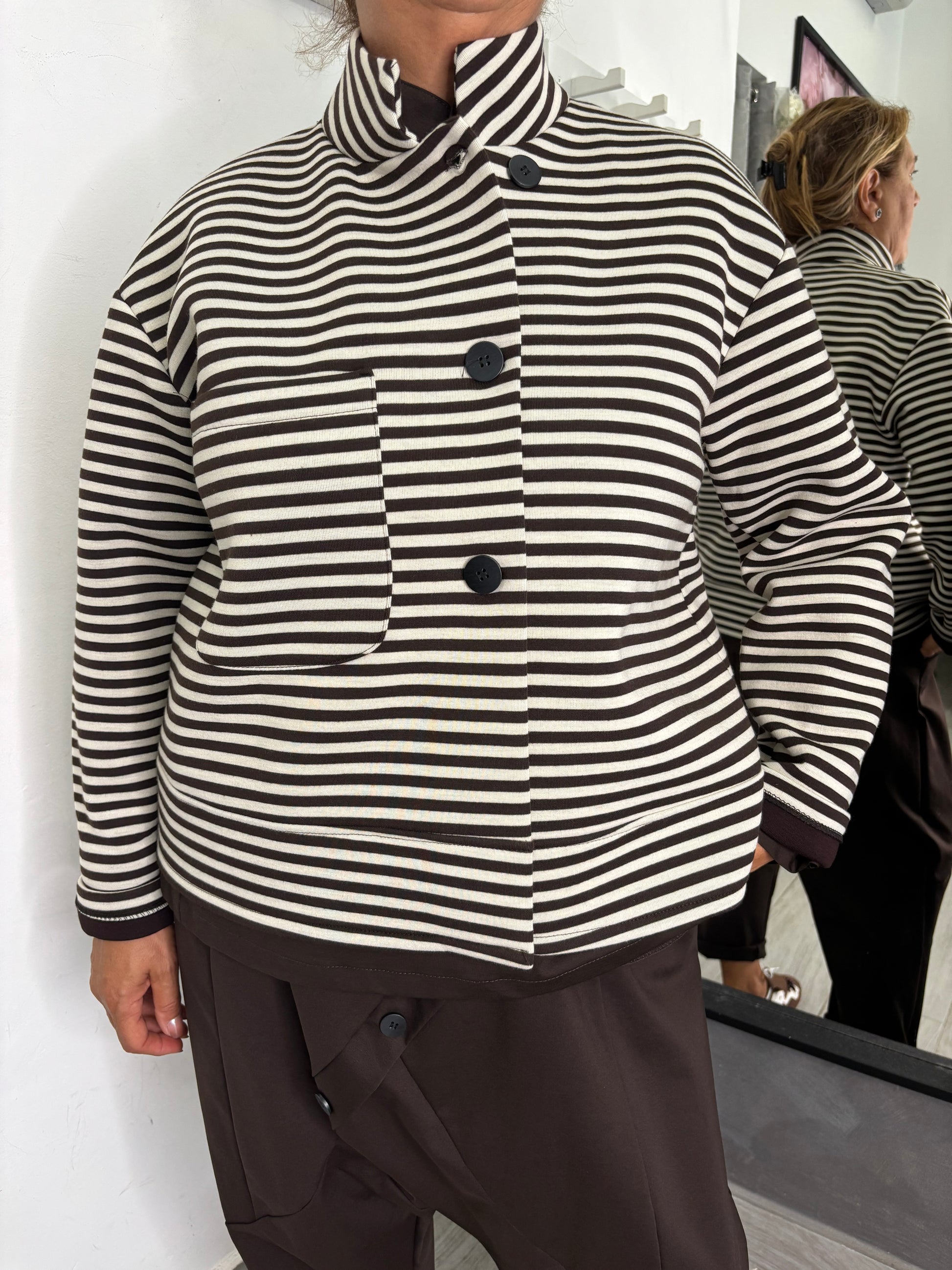 Giacca a righe fondo burro e righe marroni, collo coreana e abbottonatura laterale, una sola tasca applicata sulla parte destra. Taglia unica veste fino ad una 46.