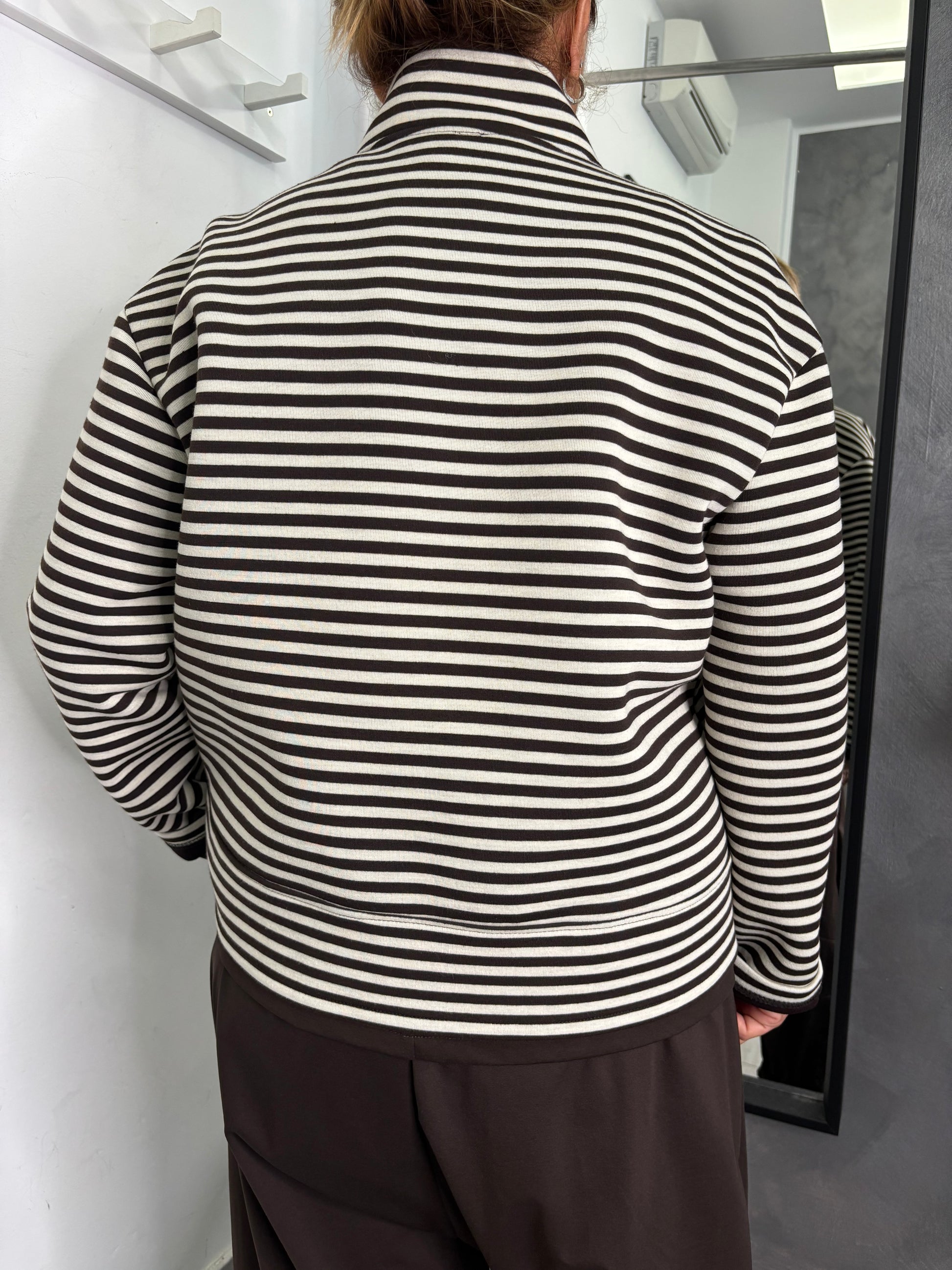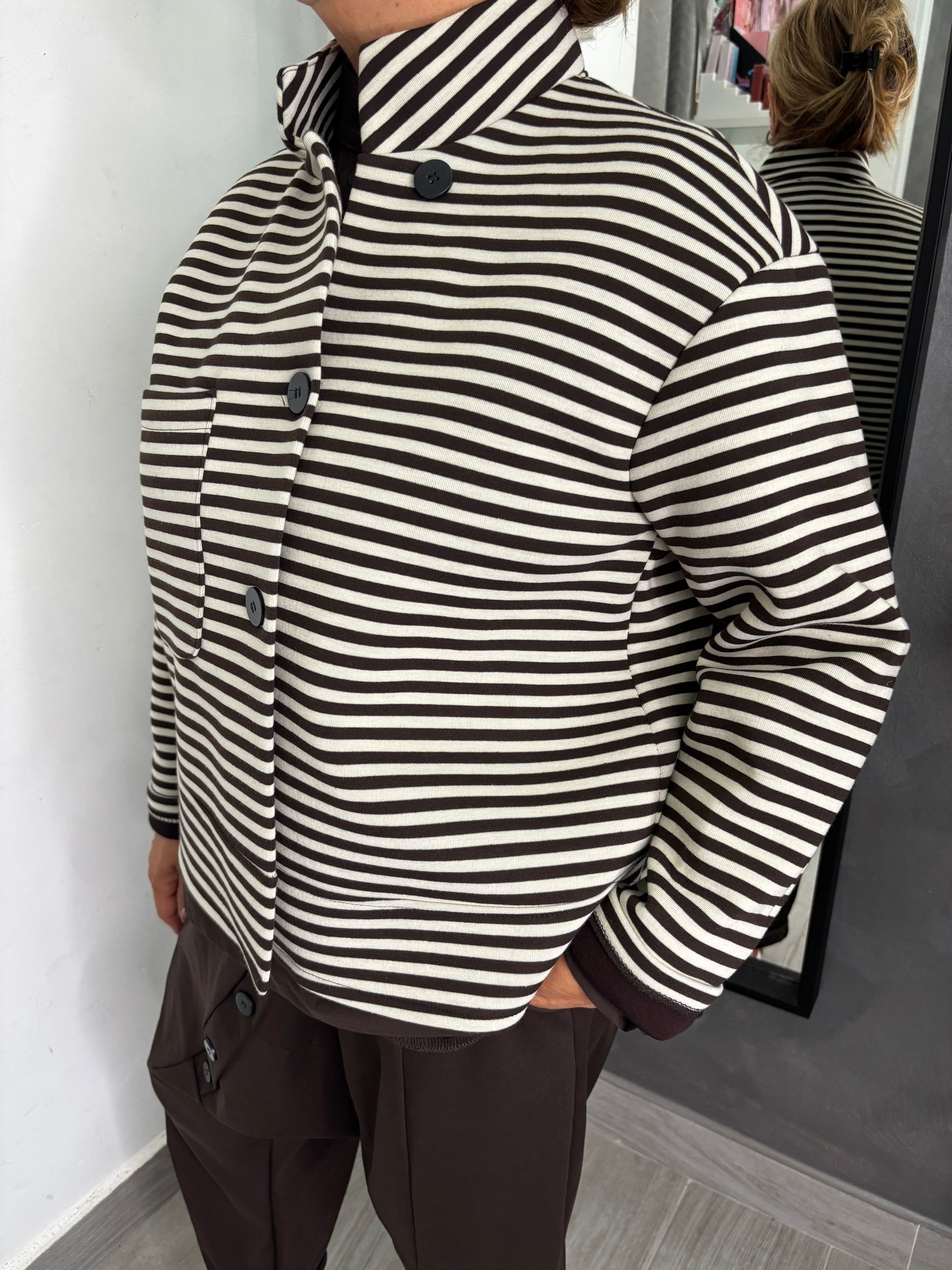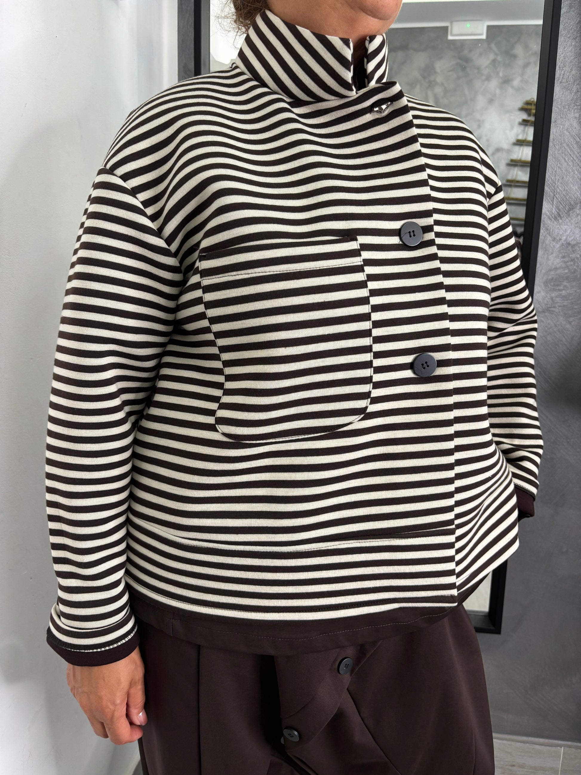Giacca a righe fondo burro e righe marroni, collo coreana e abbottonatura laterale, una sola tasca applicata sulla parte destra. Taglia unica veste fino ad una 46.
