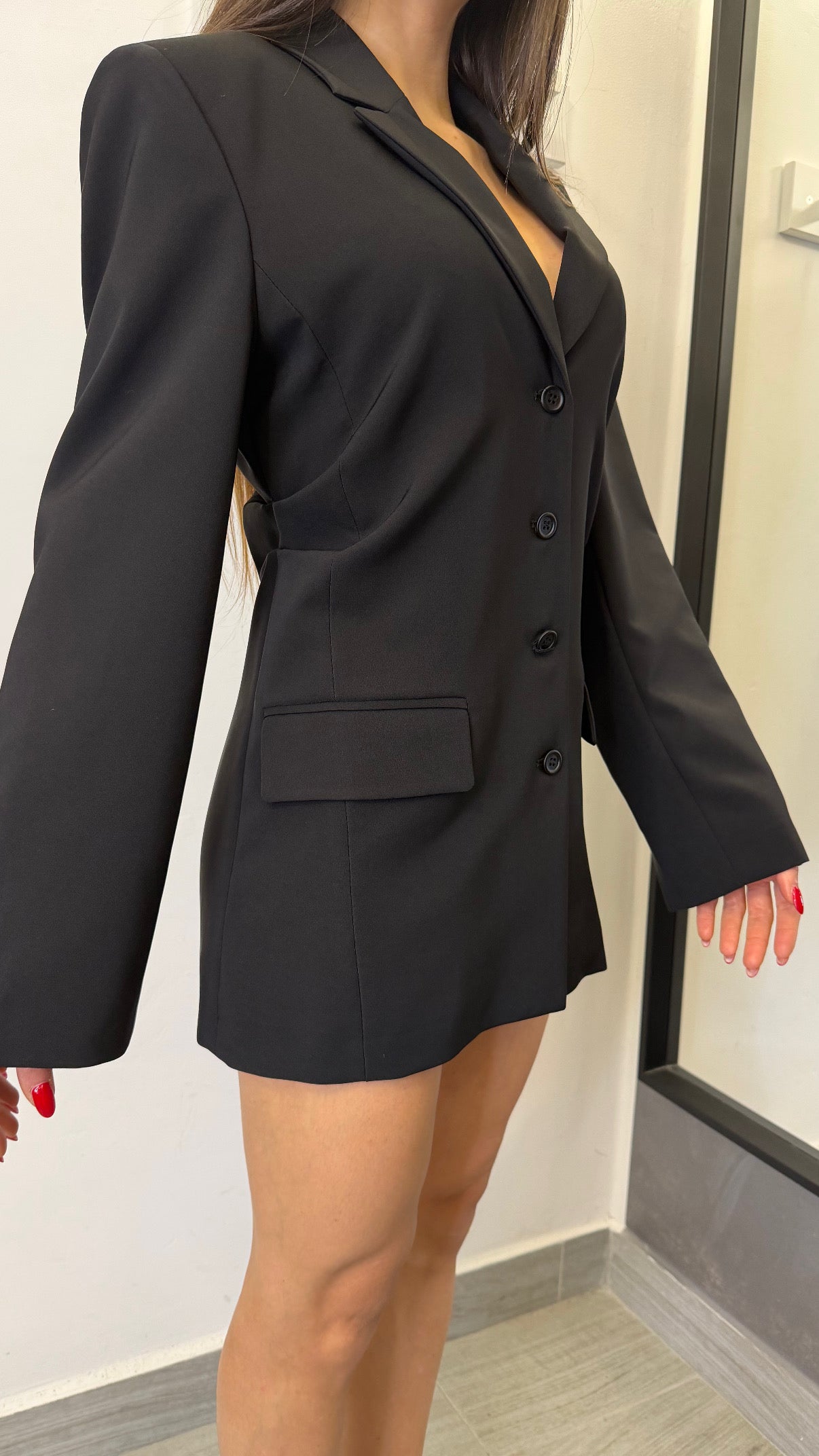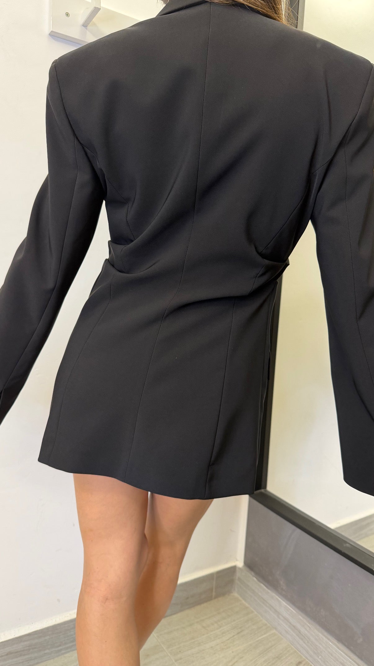Giacca modello avvitato con pieghe nel punto vita, cucite nei fianchi sia davanti che dietro. Abbottonatura davanti con 4 bottoni, collo a reverse. Tasche con aletta. Composizione 88% poliestere 22% elastan