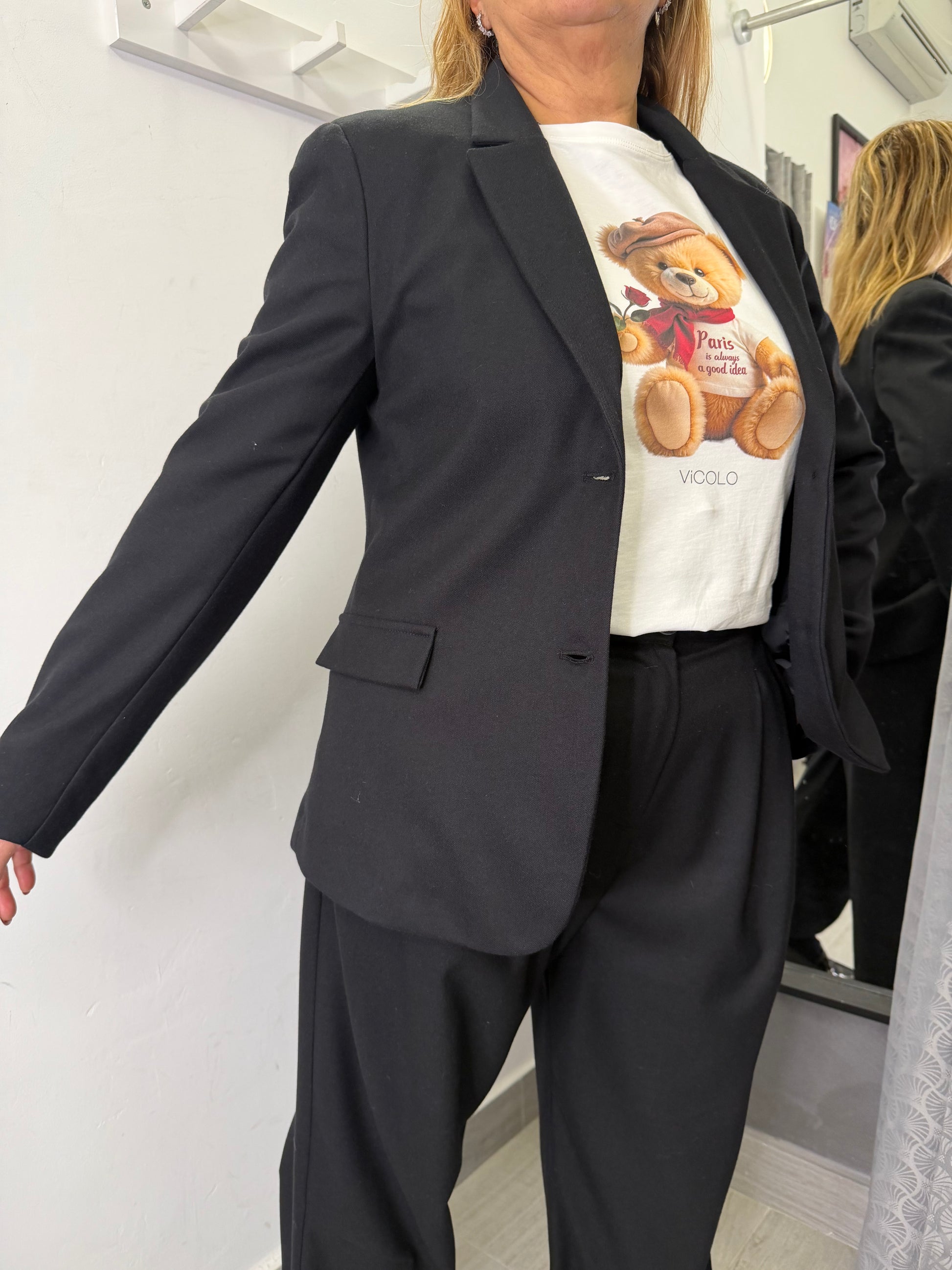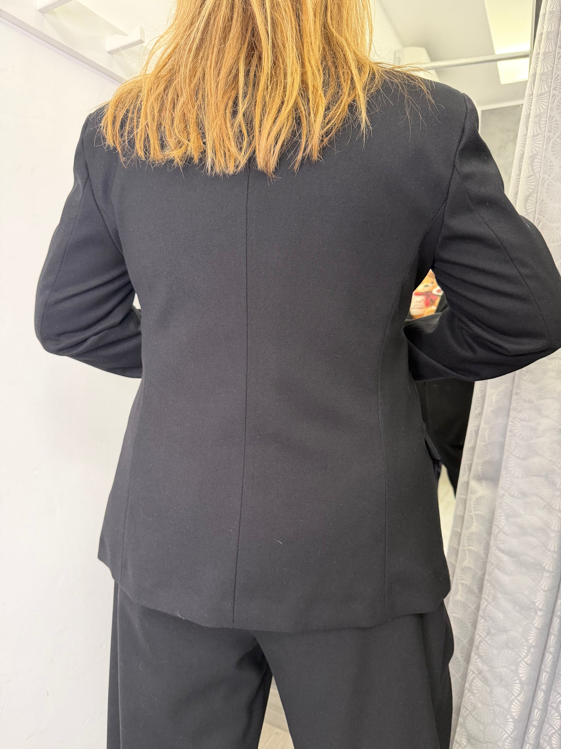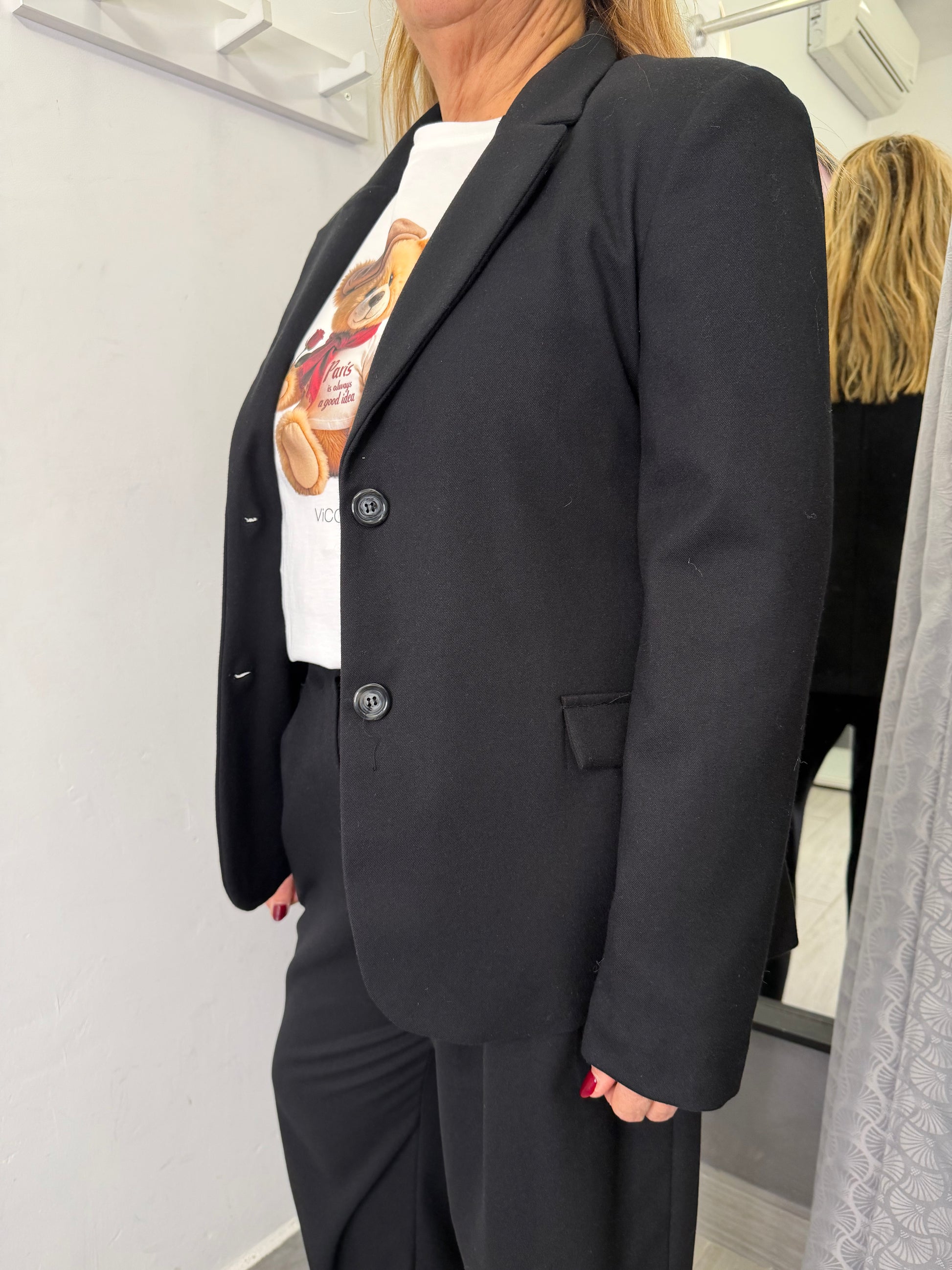 Giacca con due bottoni frontali, collo a reverse finte tasche. Composizione 65% poliestere 33% viscosa 2% elastan