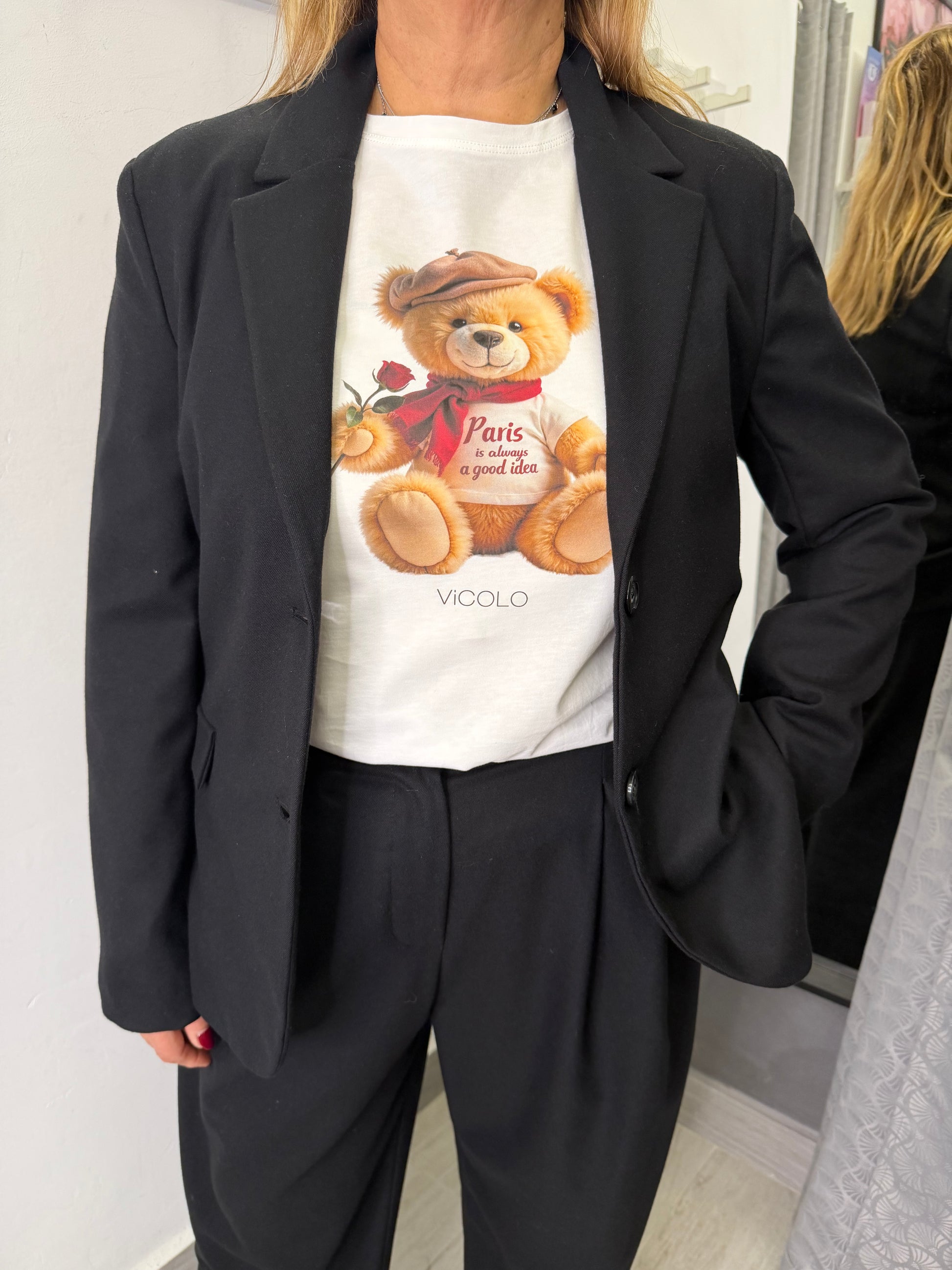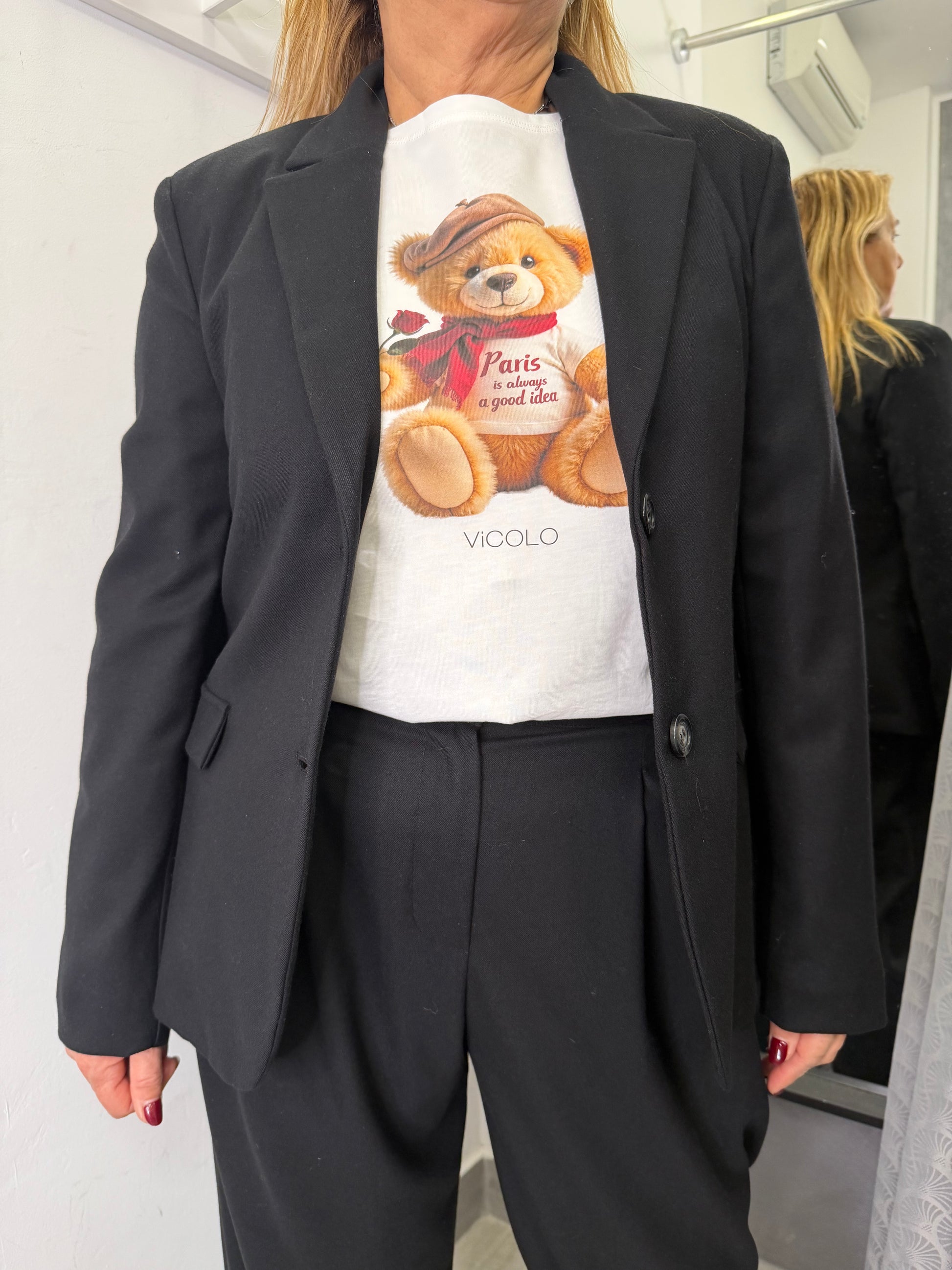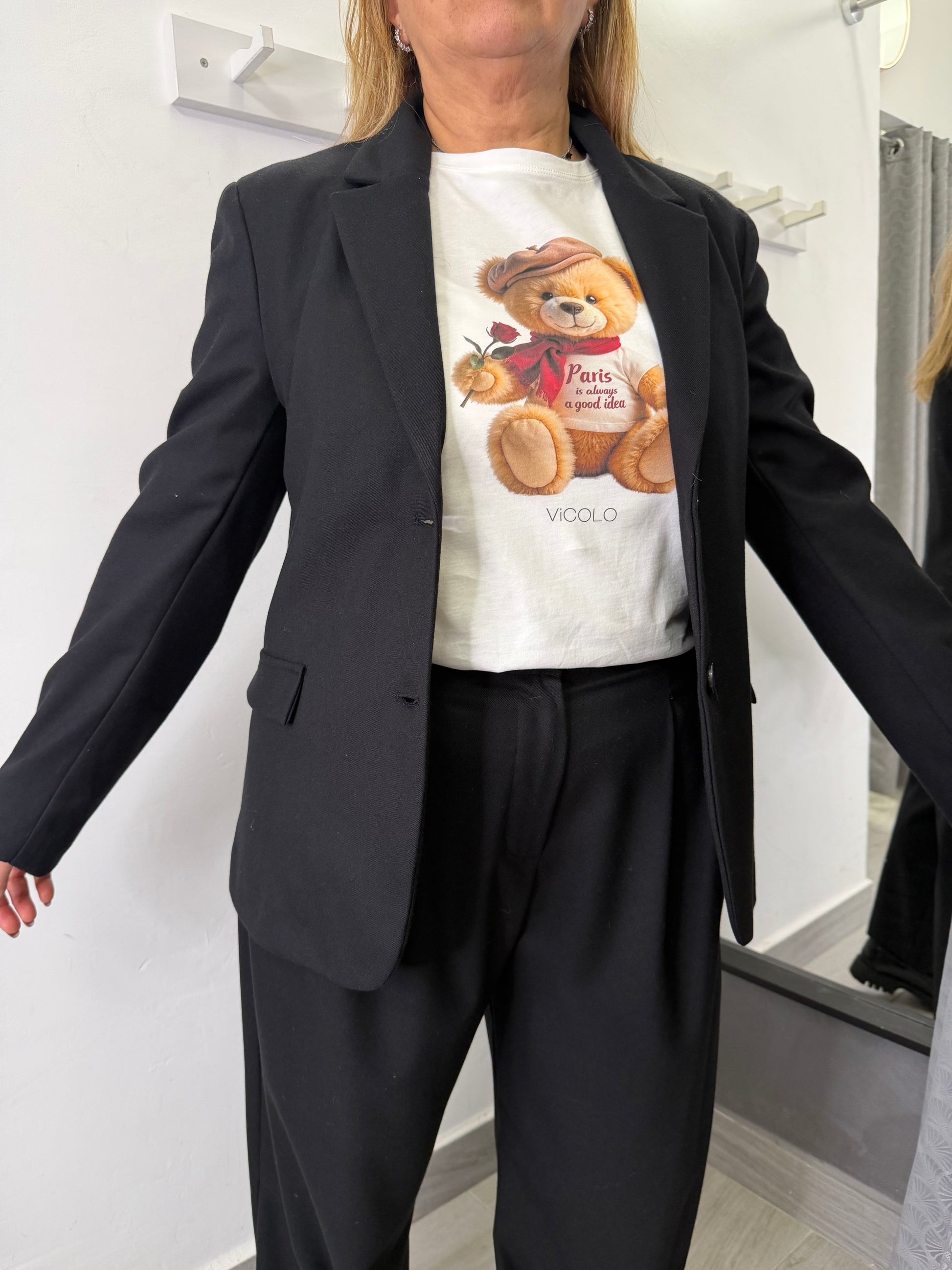 Giacca con due bottoni frontali, collo a reverse finte tasche. Composizione 65% poliestere 33% viscosa 2% elastan