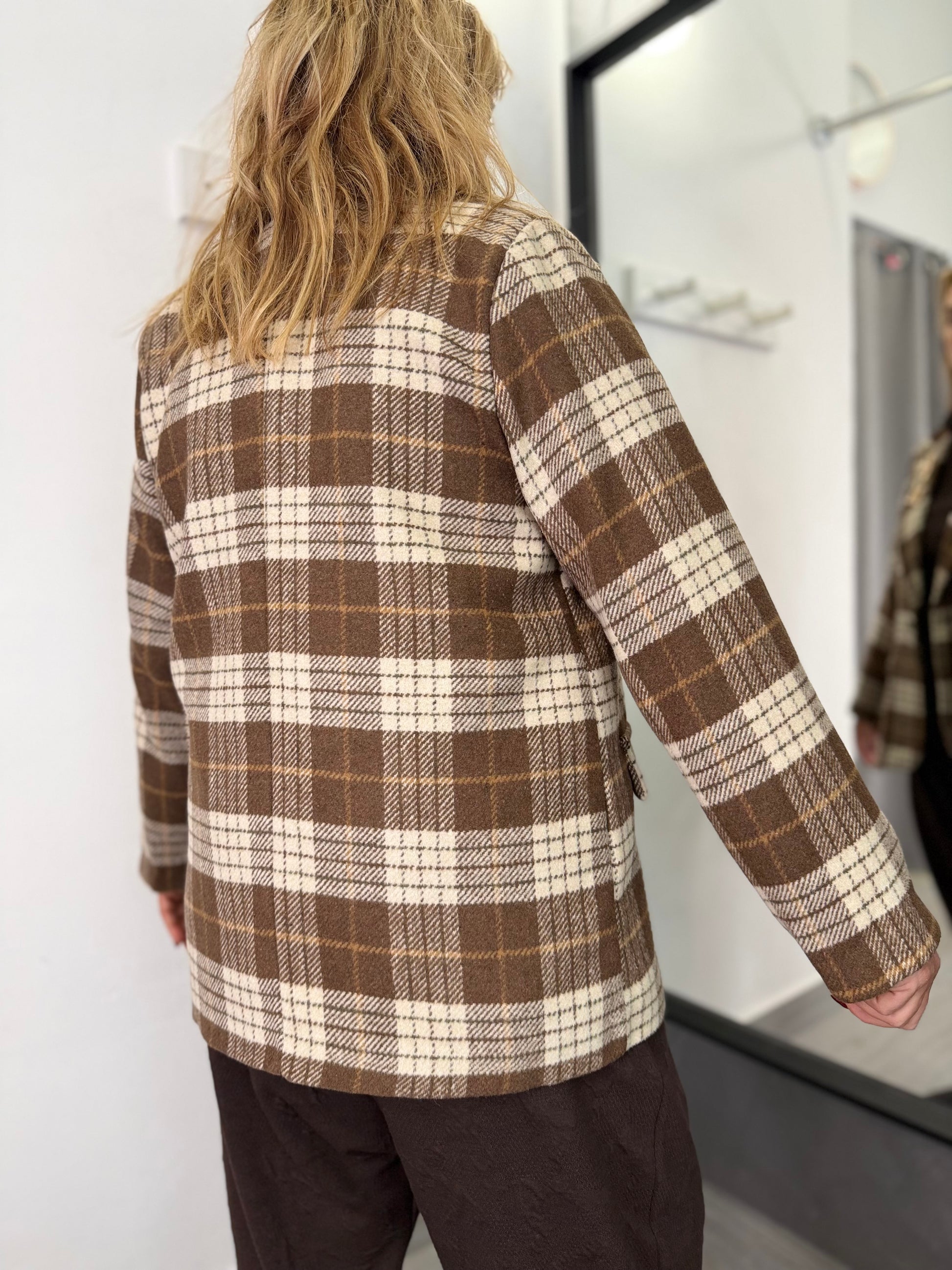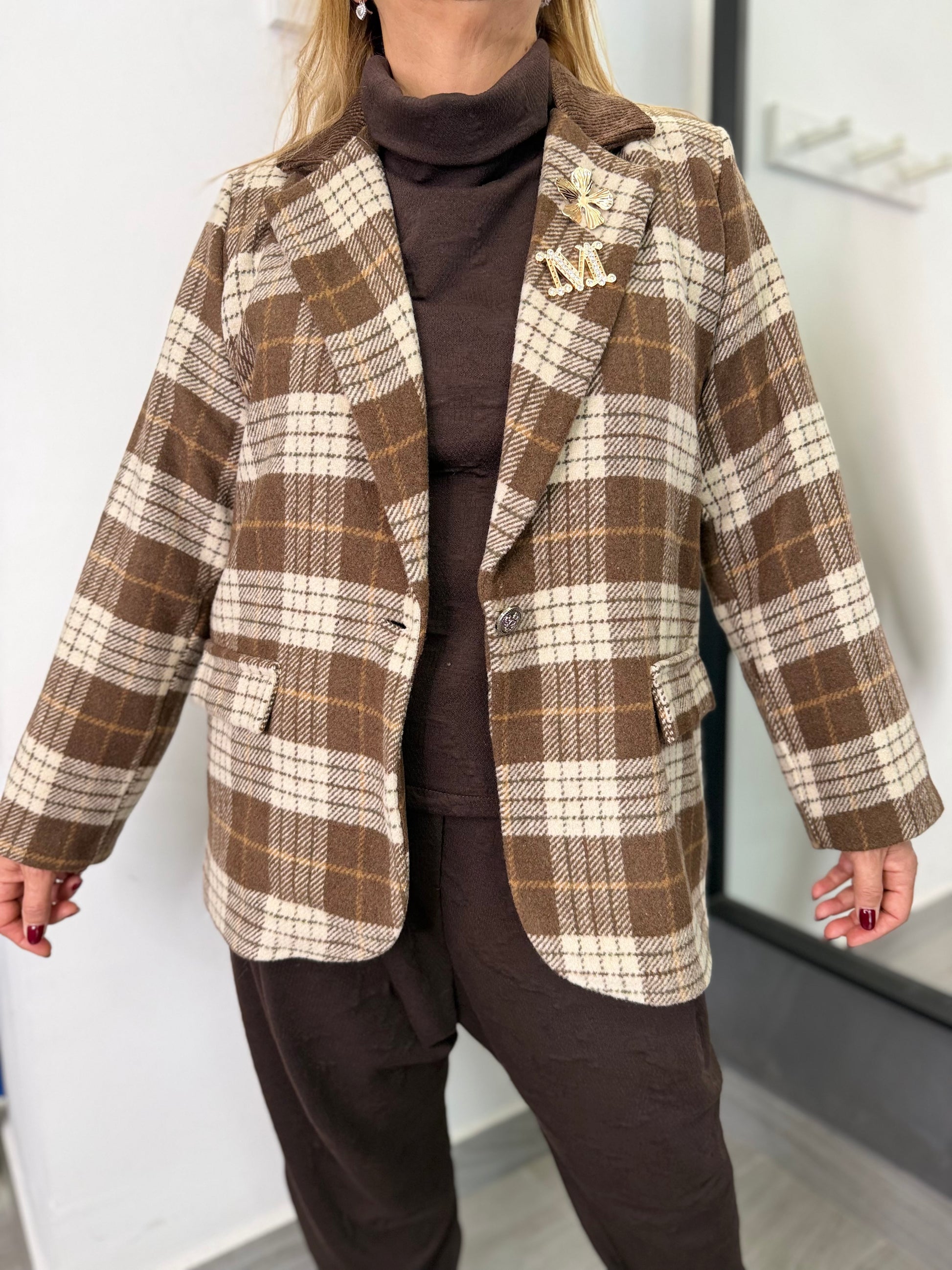 Giacca modello oversize, tessuto a quadri nei colori del beige, marrone e senape, finte tasche , colletto in velluto a costine e spille applicate sul reverse rimovibili. Taglia unica veste fino ad una 48. Composizione 100% poliestere