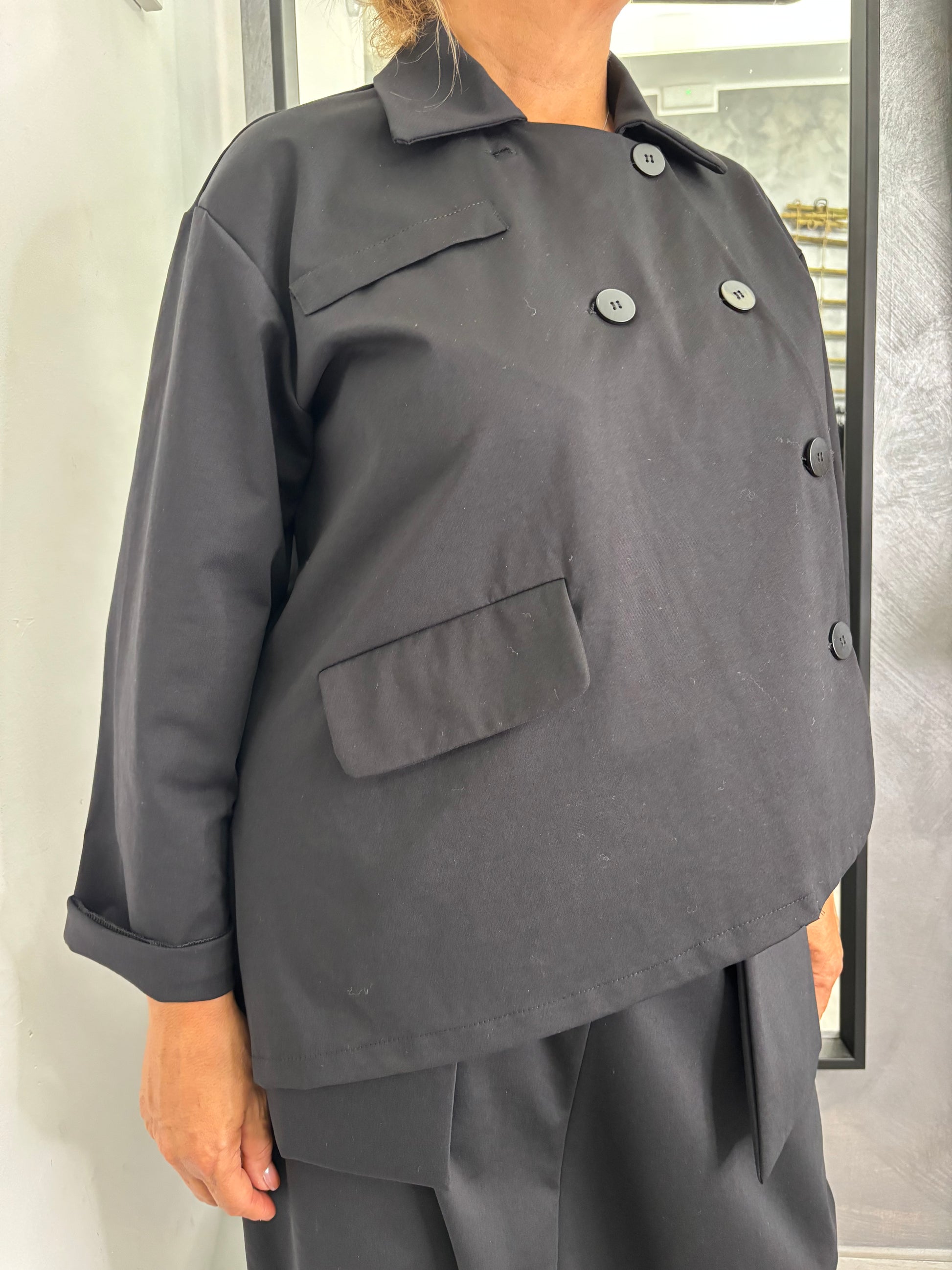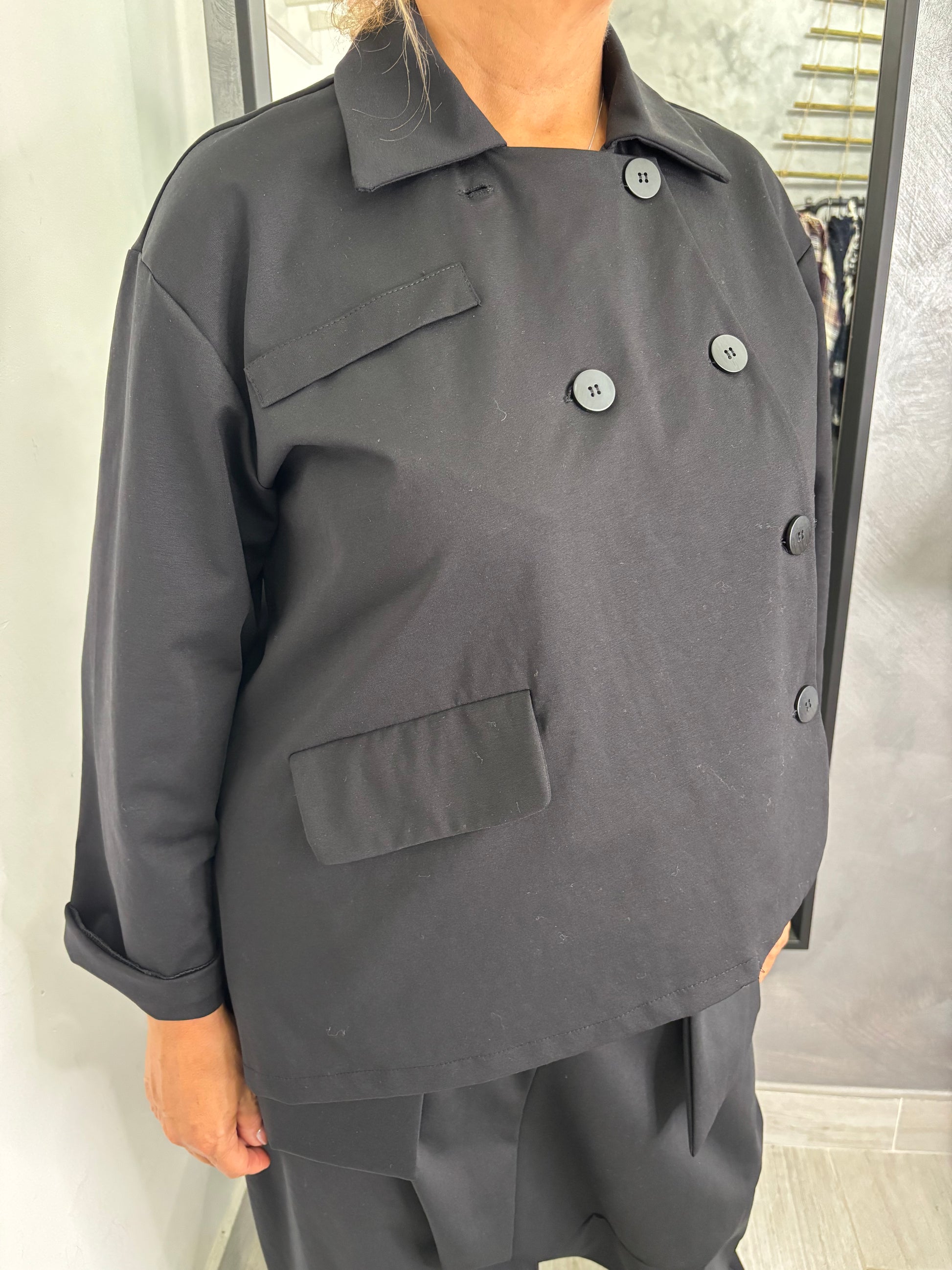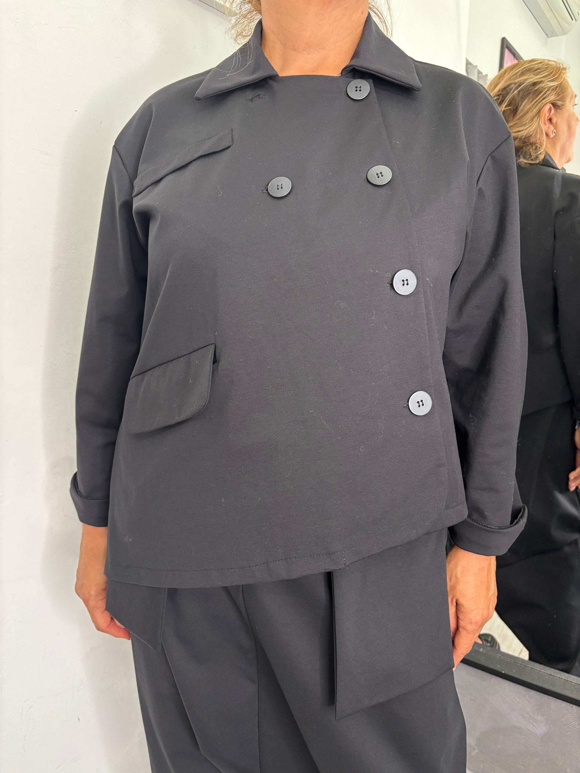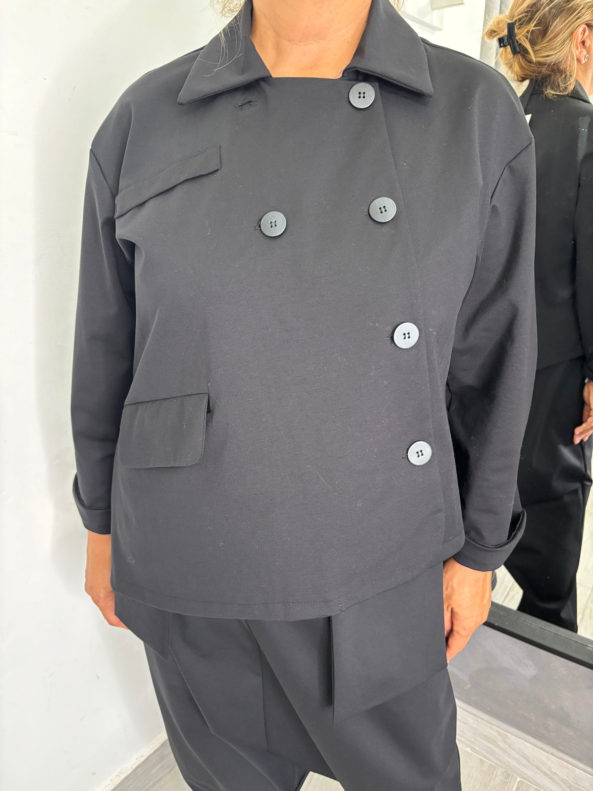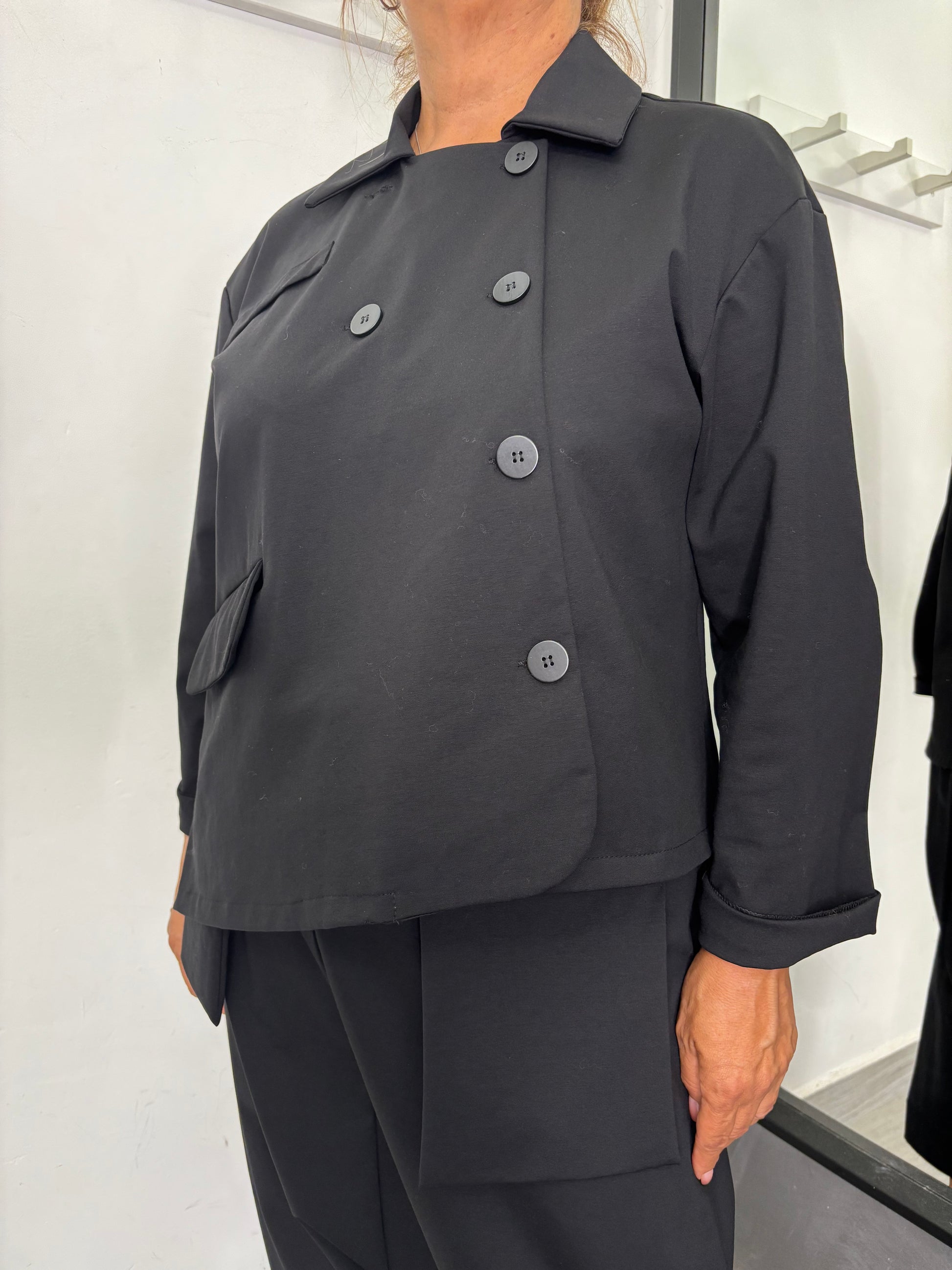 Giacca in tessuto punto Milano, collo a camicia, abbottonatura laterale a doppio petto, unica tasca a filetto con aletta. Taglia unica veste fino ad una 46. Composizione 53% cotone 38% poliammide 9% elastan.