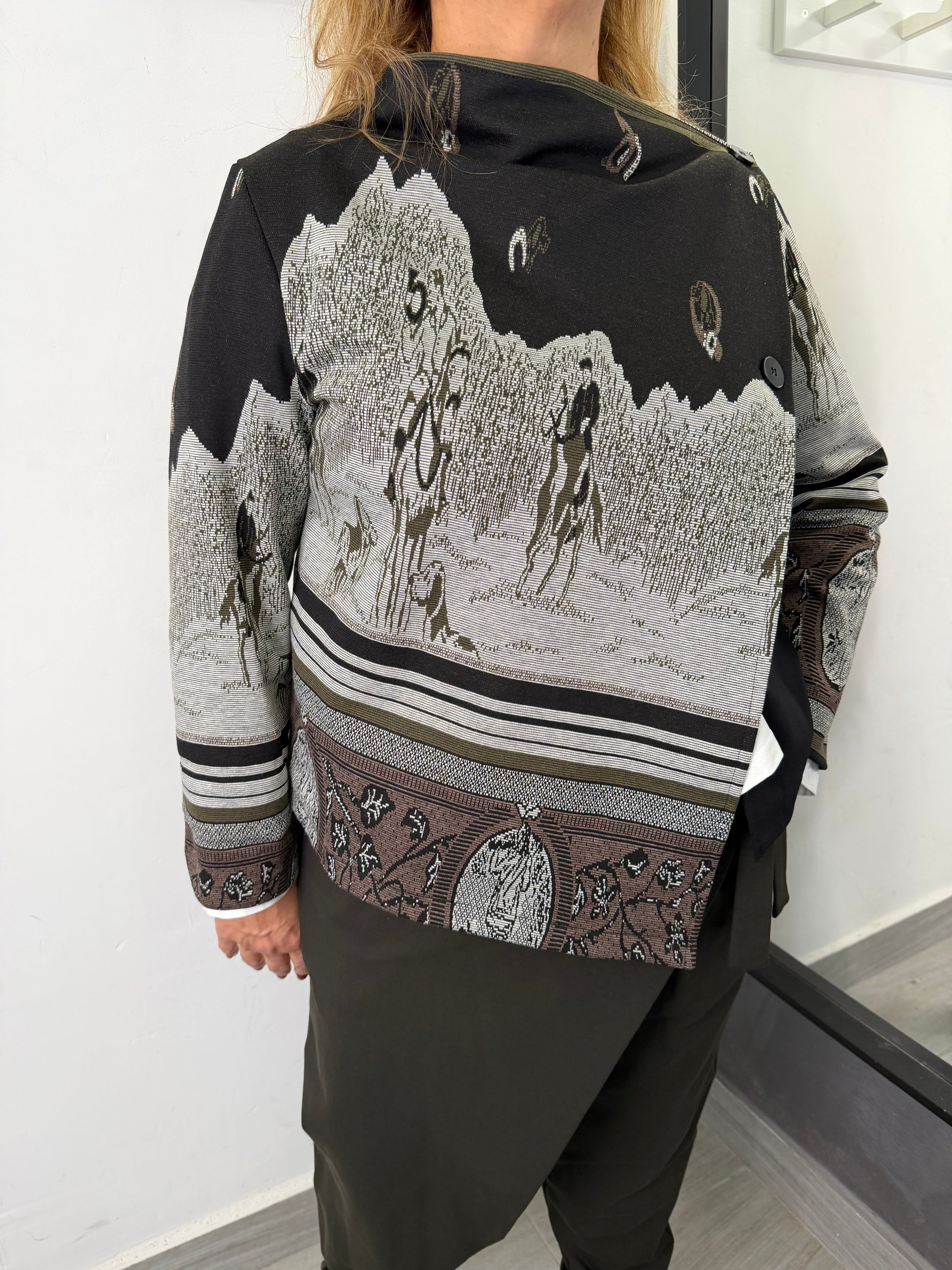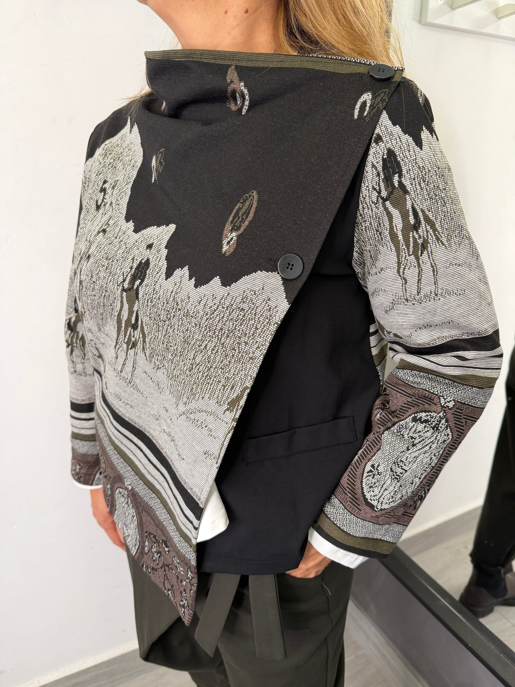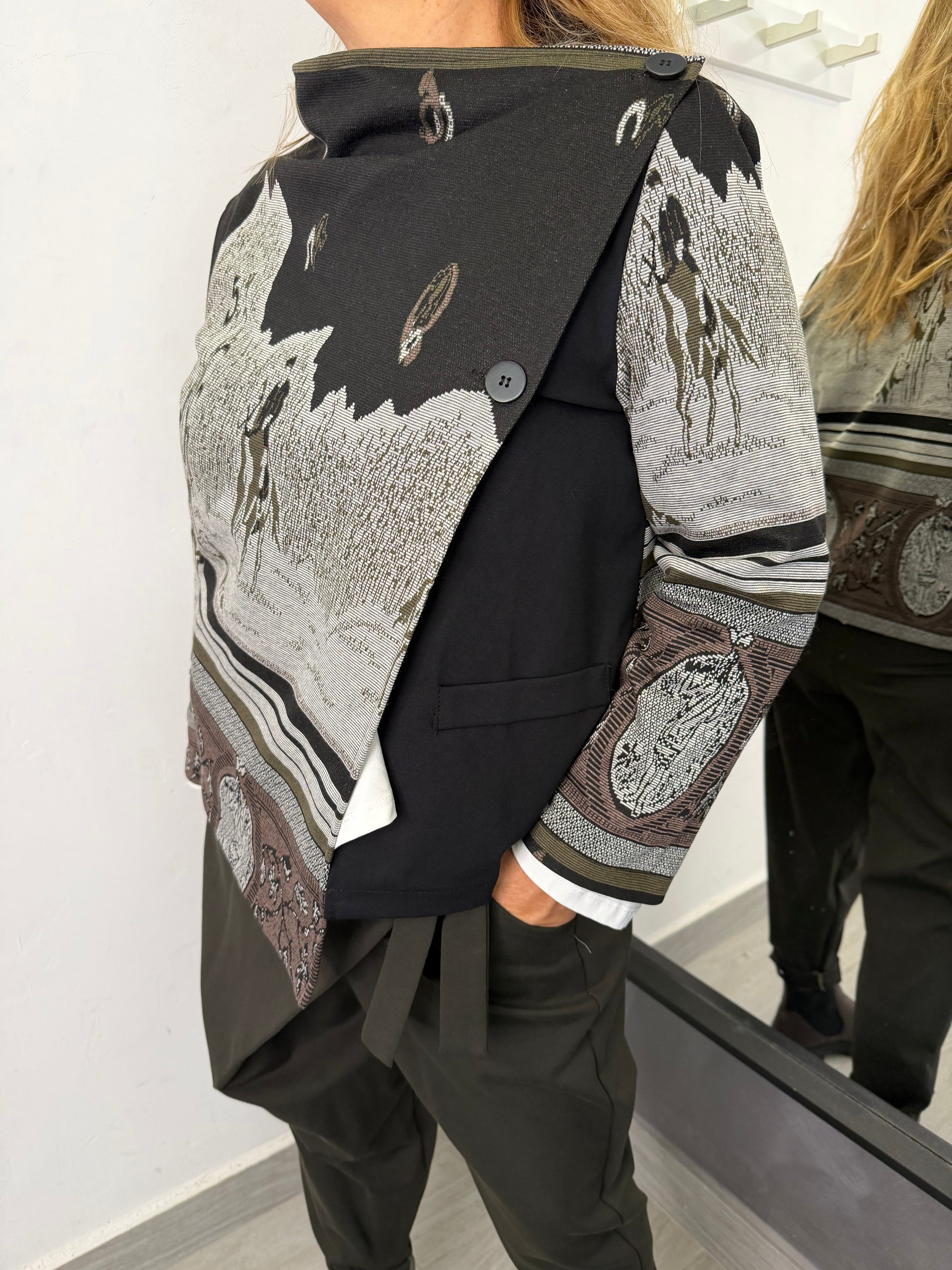 Giacca in fantasia nei colori del nero, marrone e grigio, abbottonatura laterale nella parte sinistra dove si trova una parte in tinta unita nera. Taglia unica veste fino ad una 46. Composizione 1 tessuto 60% poliestere 33% cotone 2% elastan 2 tessuto 53% cotone 38% poliammide 9% elastan.