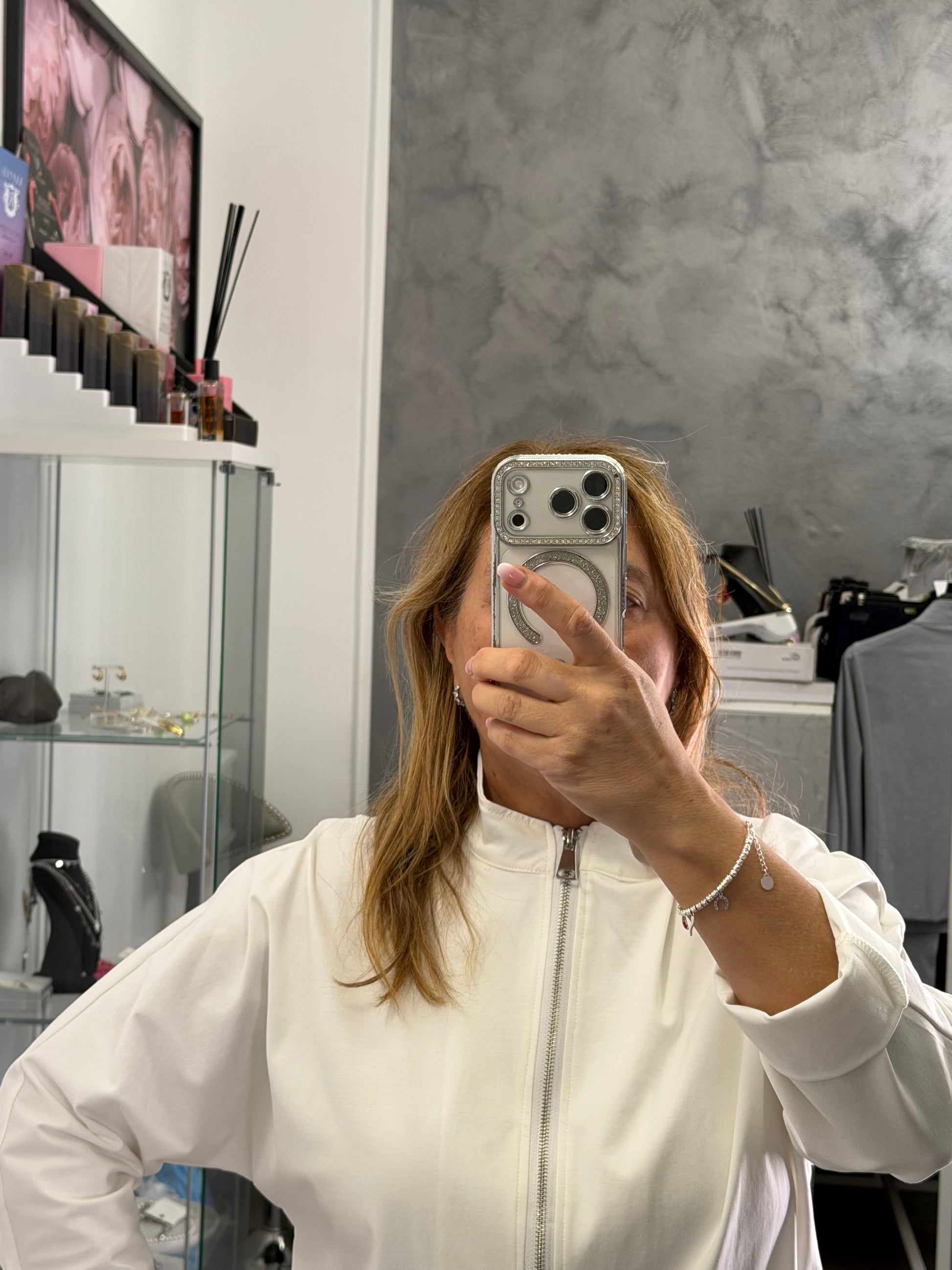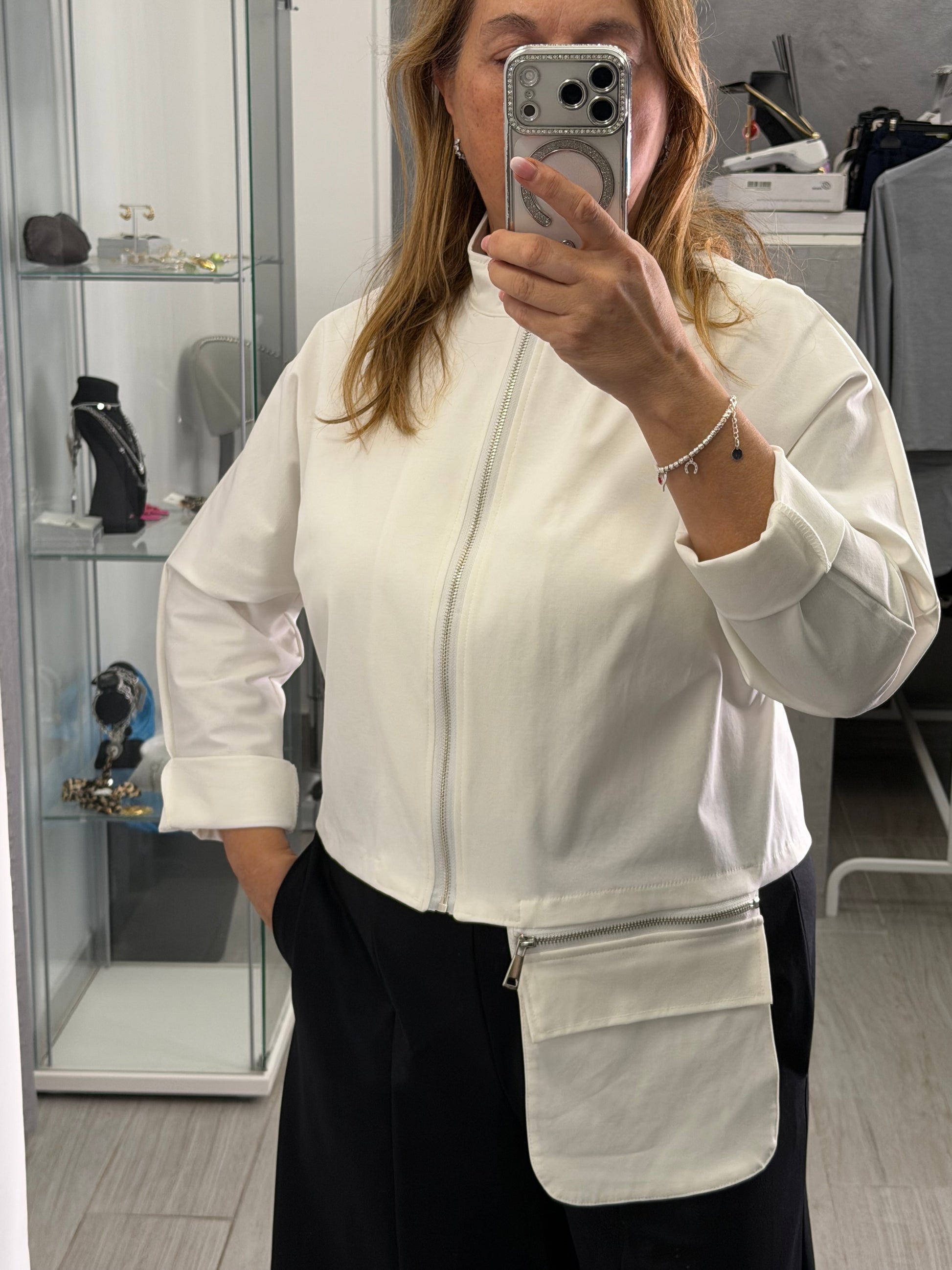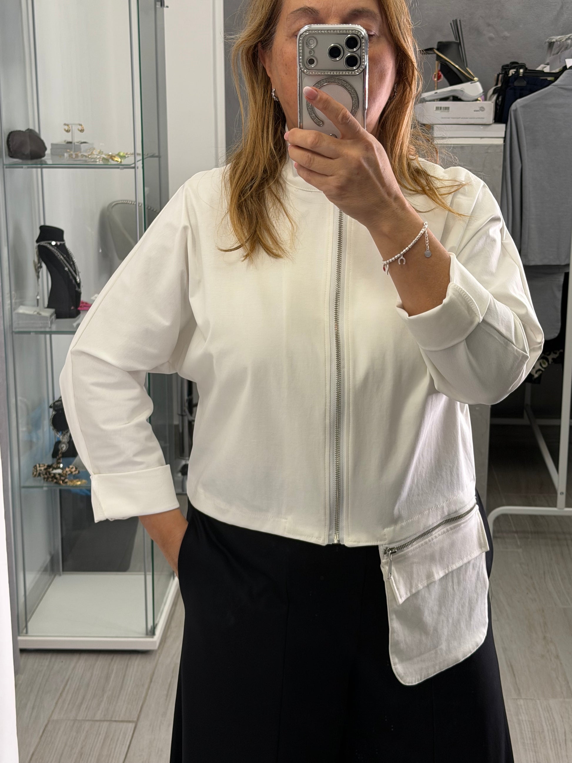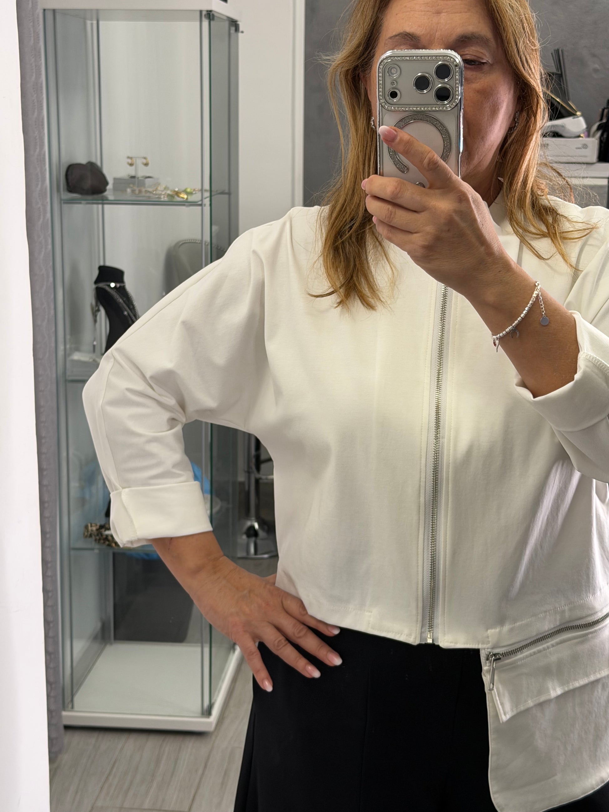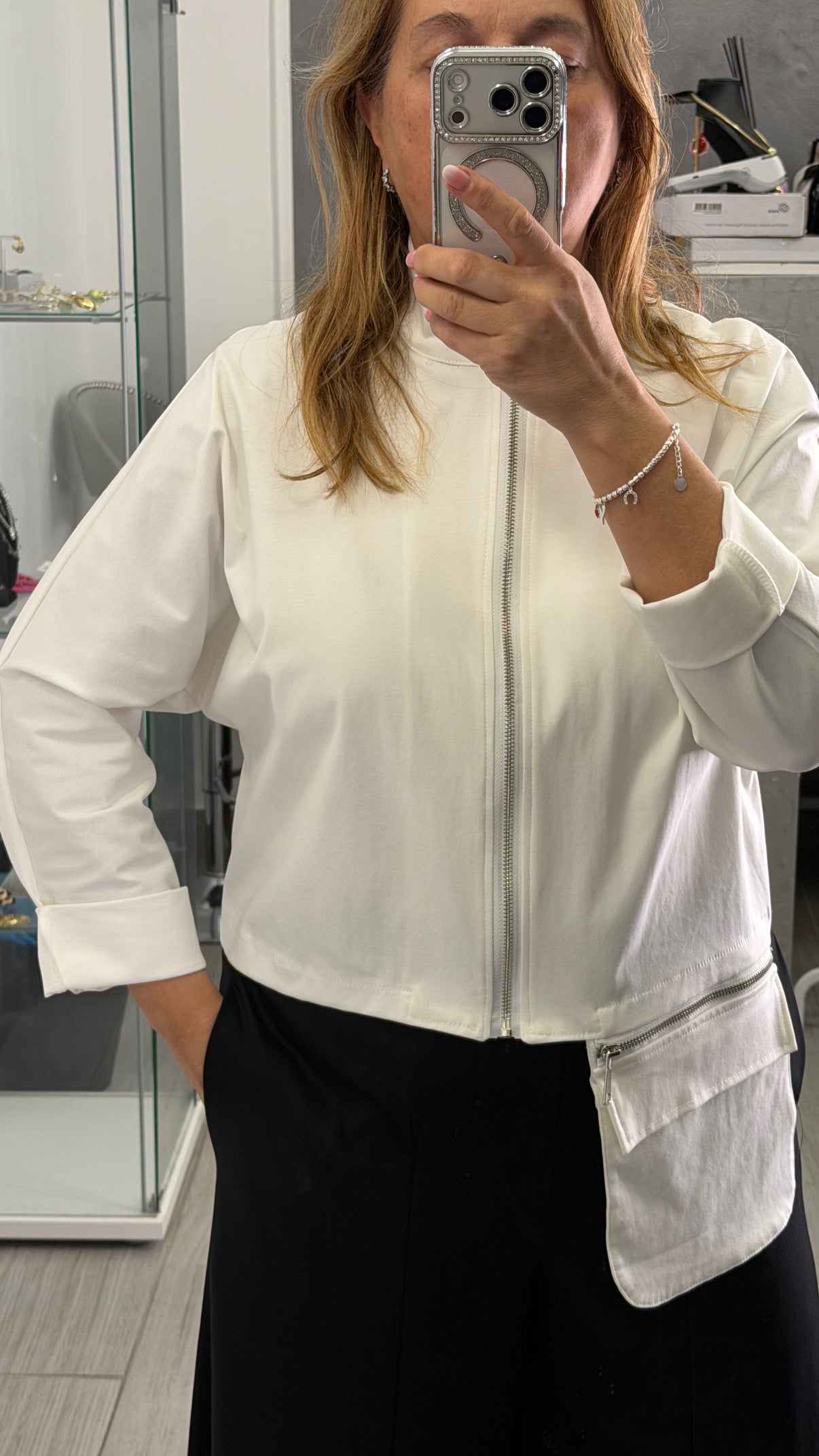 Giacca in tessuto punto Milano con collo alla coreana e abbottonatura con cerniera. Manica lunga modello raglan e dettaglio taschino sulla parte destra con cerniera. Taglia unica veste fino ad una 48. Composizione 53% cotone 38% poliammide 9% elastan.