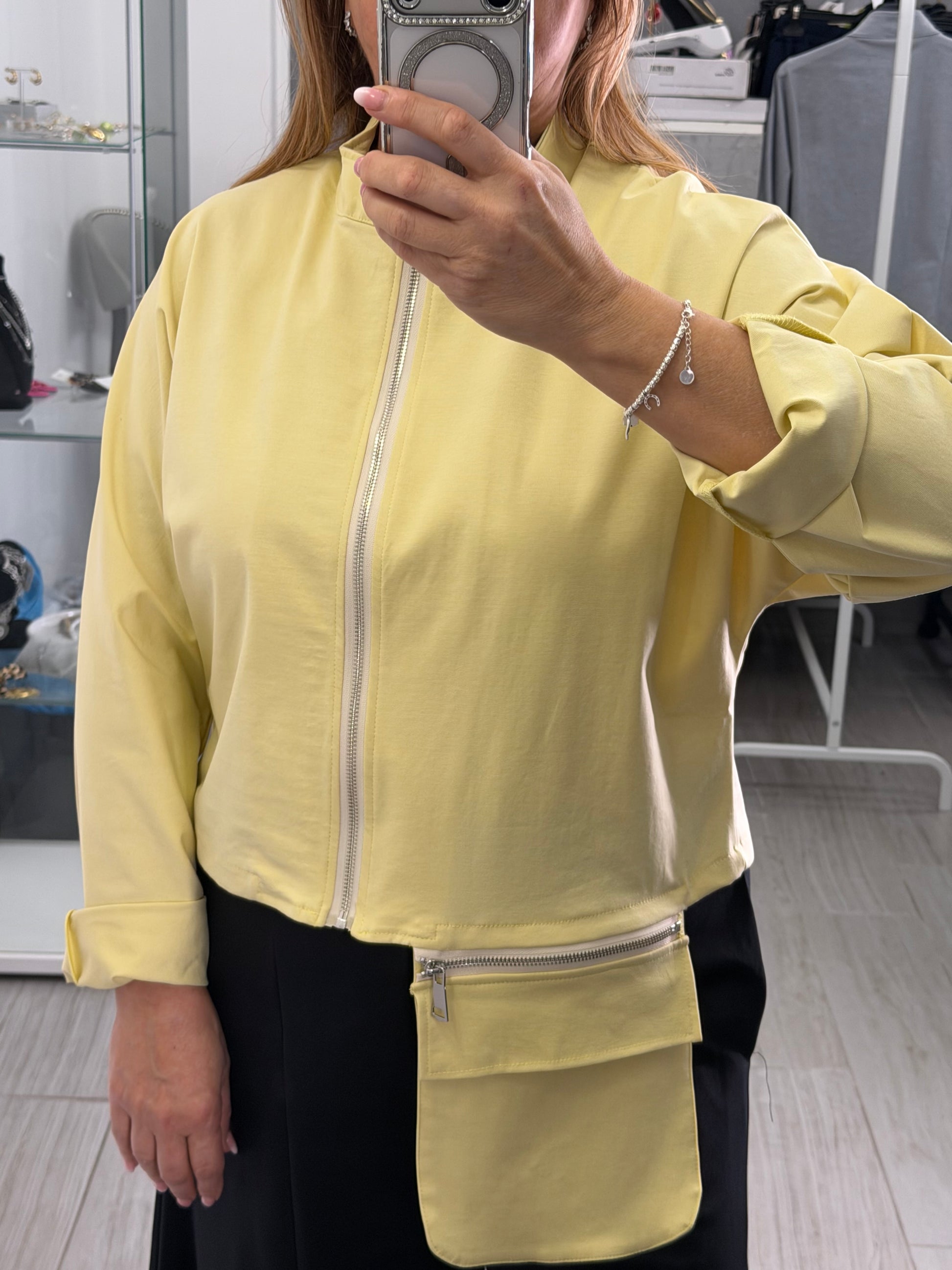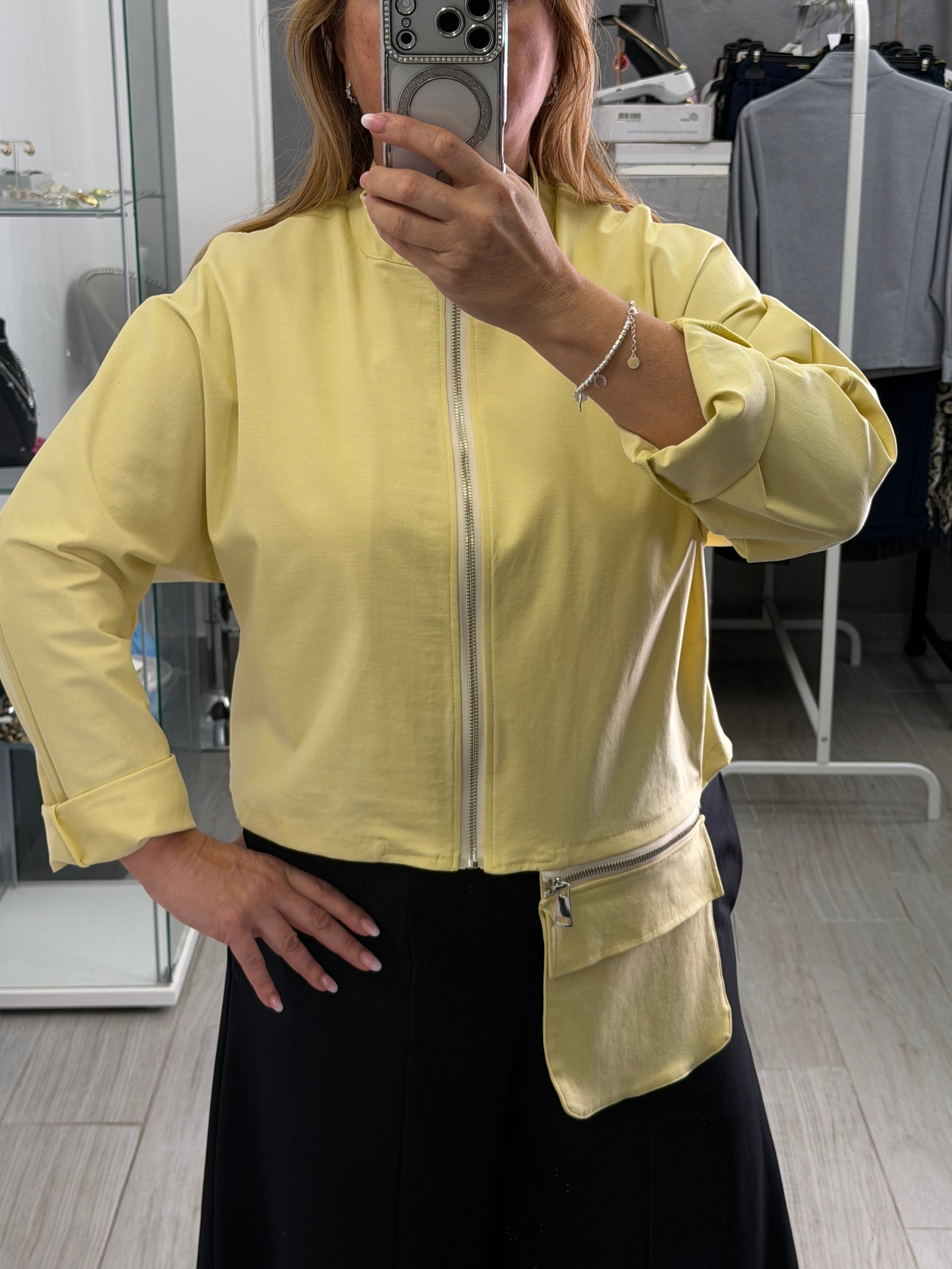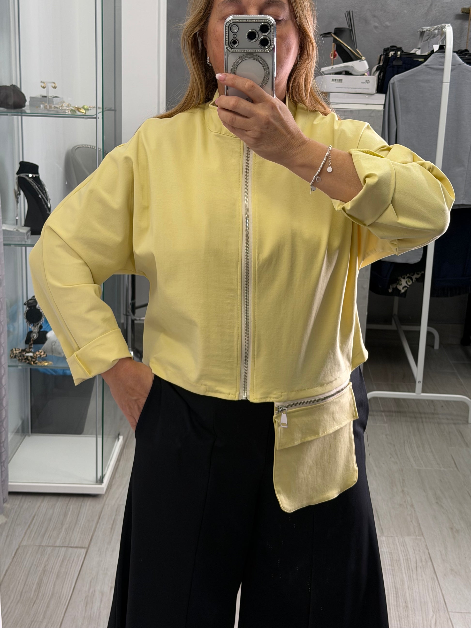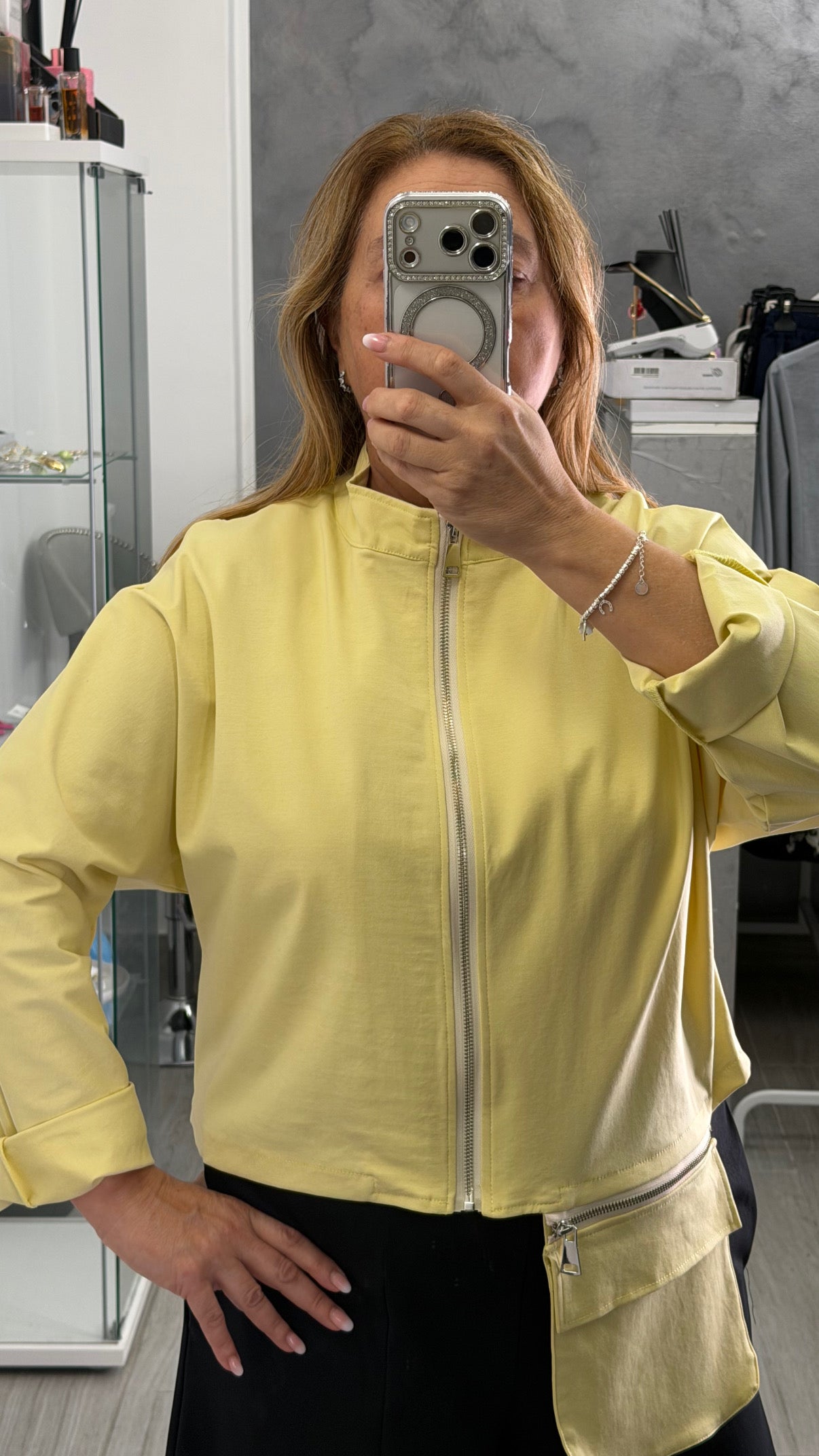 Giacca in tessuto punto Milano con collo alla coreana e abbottonatura con cerniera. Manica lunga modello raglan e dettaglio taschino sulla parte destra con cerniera. Taglia unica veste fino ad una 48. Composizione 53% cotone 38% poliammide 9% elastan.
