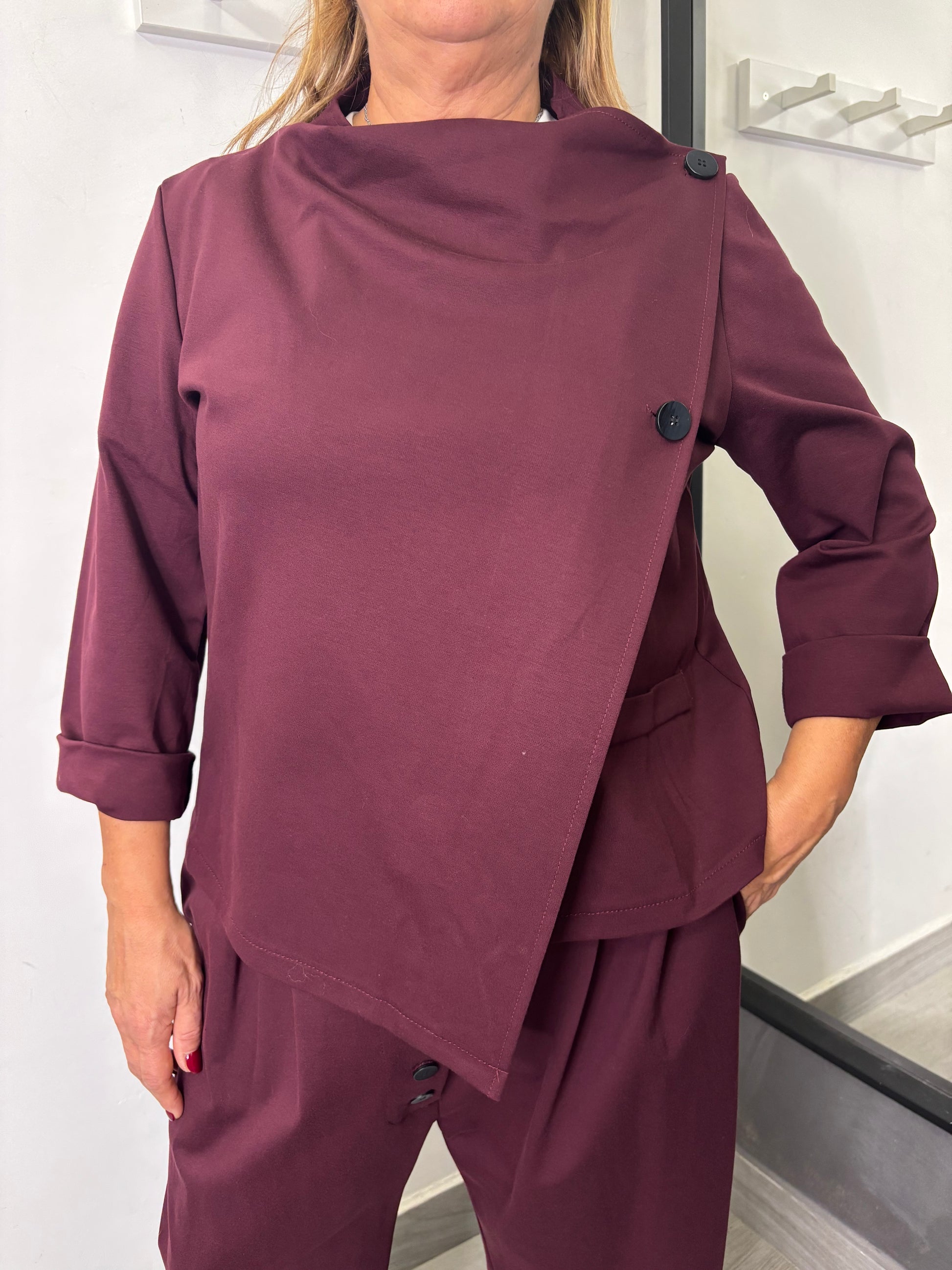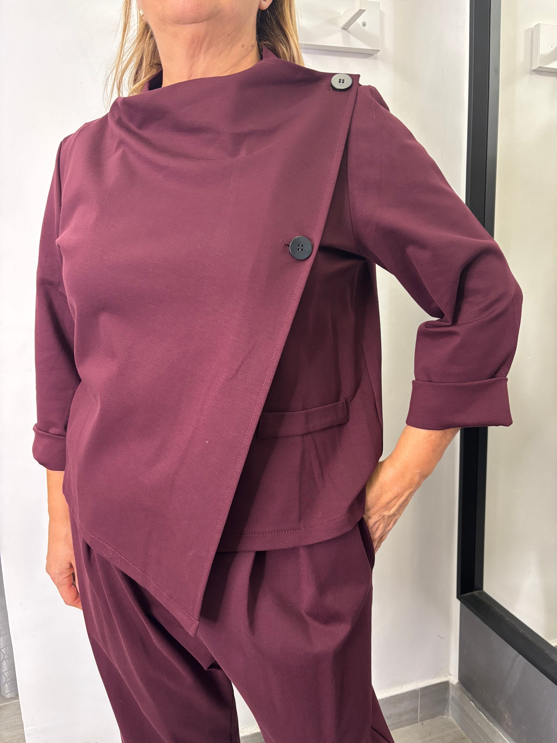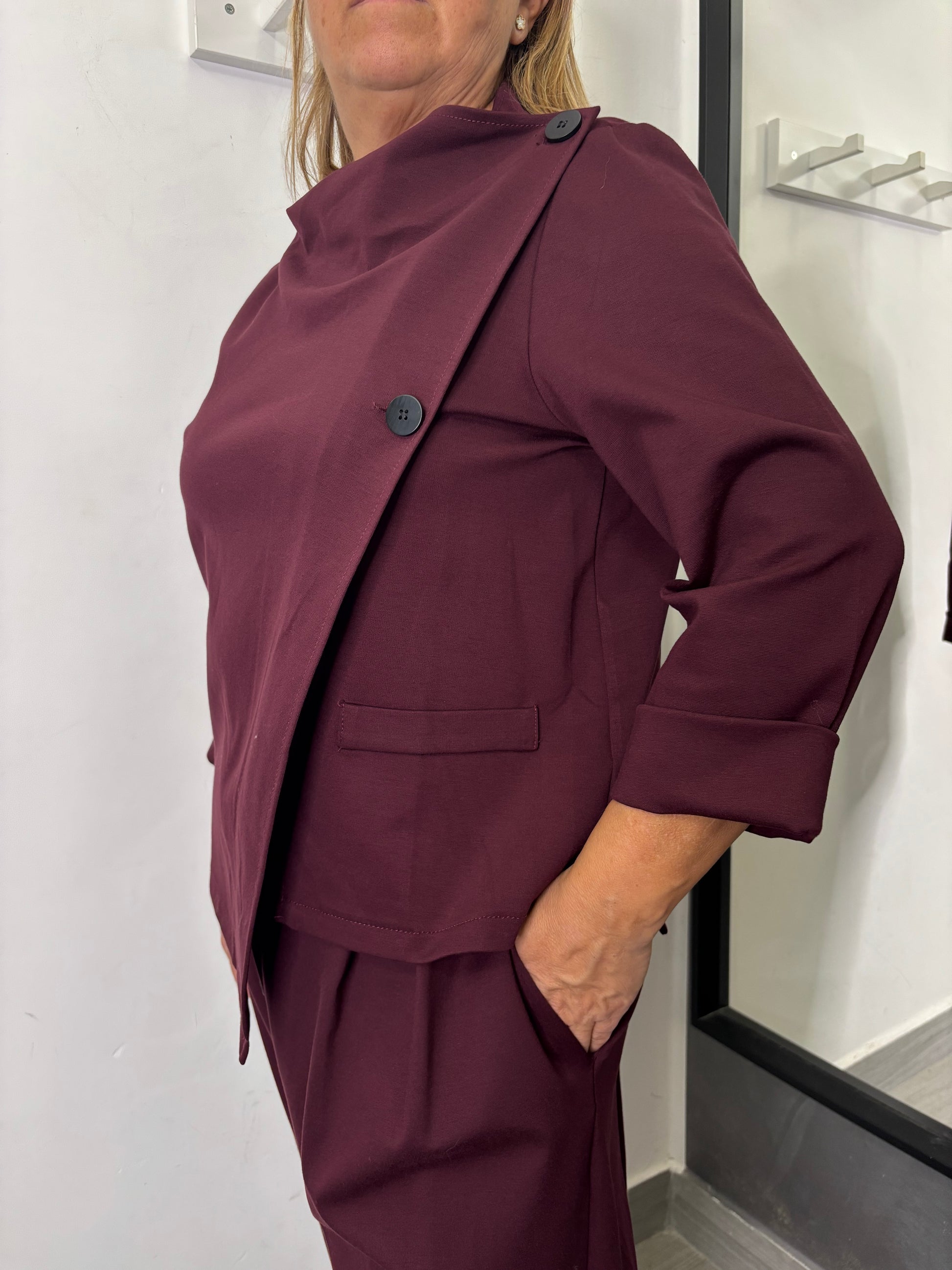 Giacca in tessuto punto Milano. Abbottonatura laterale, collo ad anello. Presenta una punta più lunga nella parte sinistra. Taglia unica veste fino ad una 46. Composizione 65% viscosa 30% poliammide 5% elastan