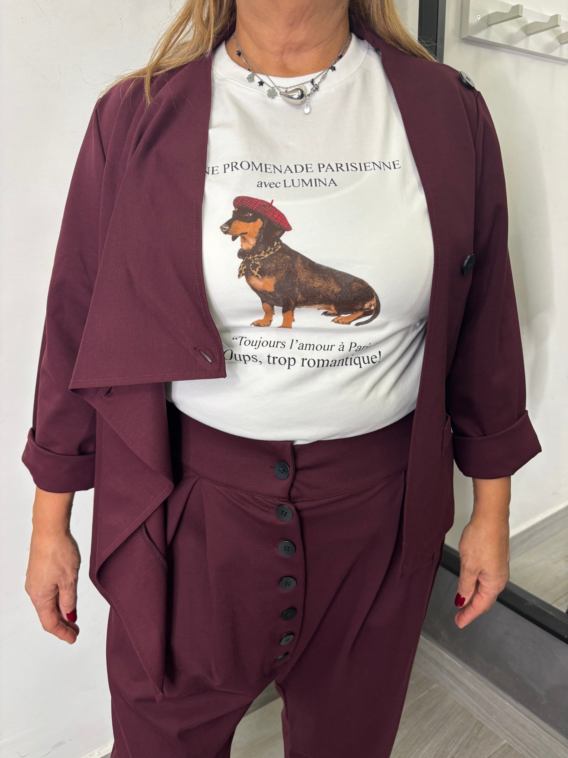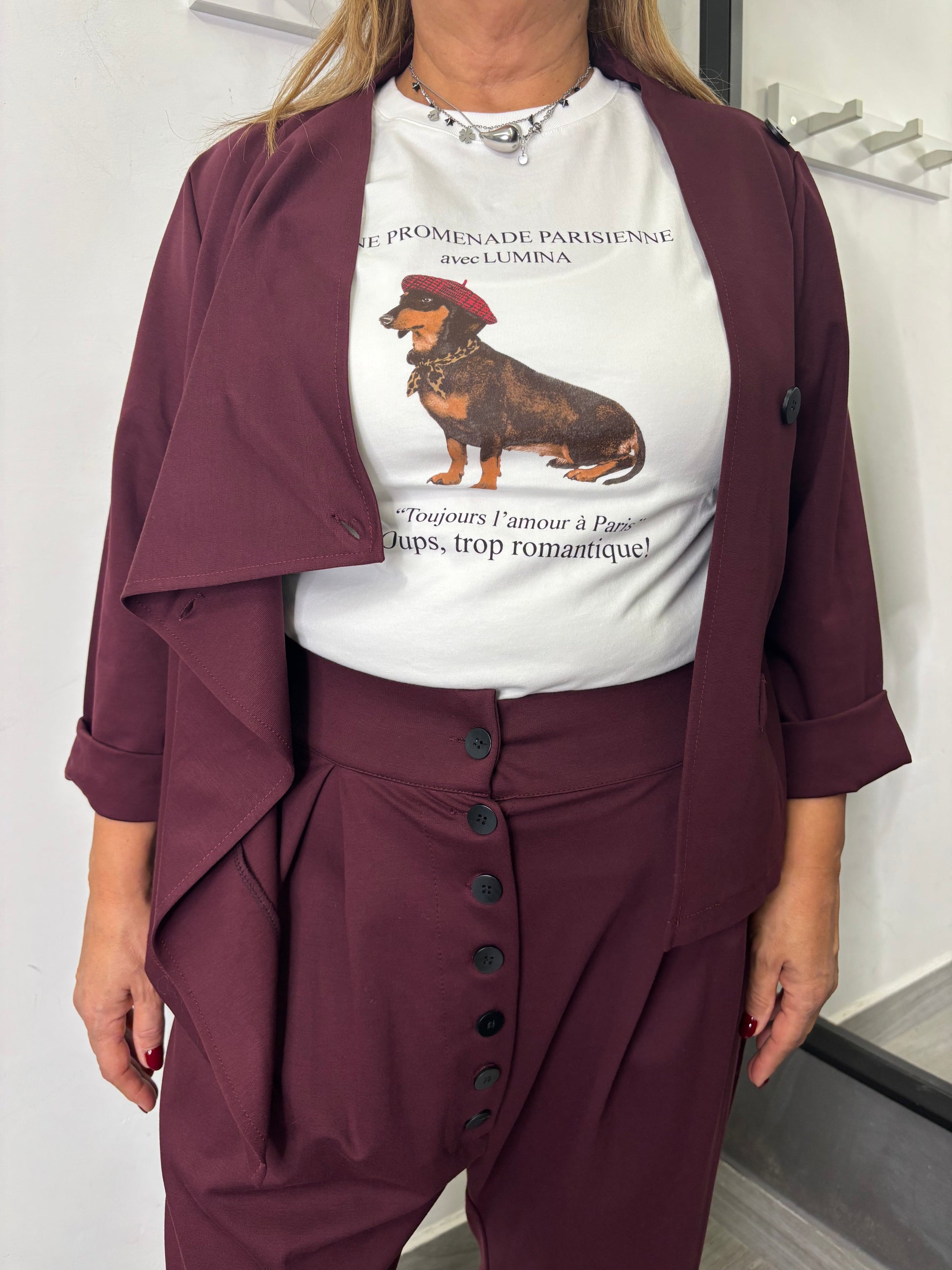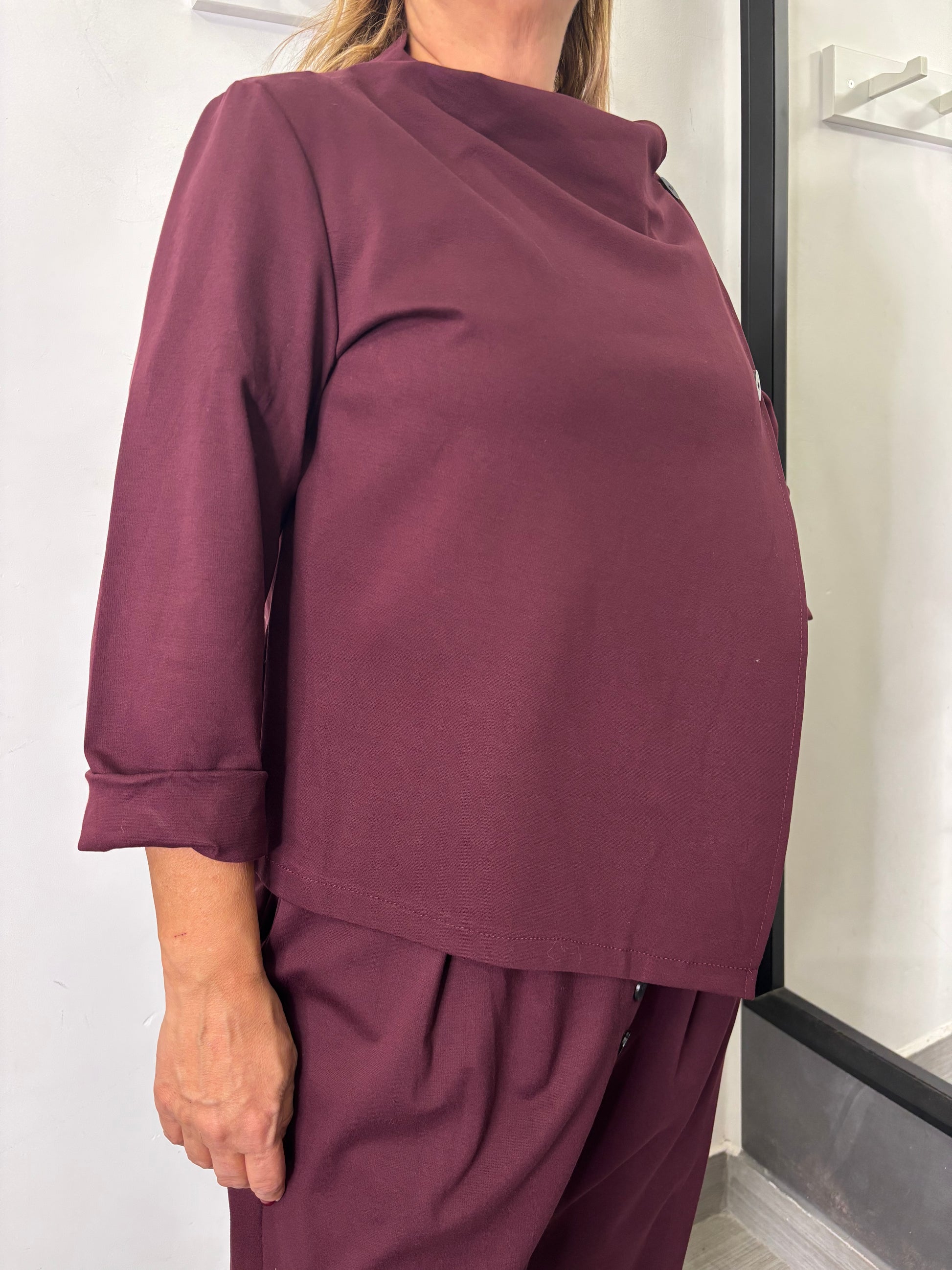 Giacca in tessuto punto Milano. Abbottonatura laterale, collo ad anello. Presenta una punta più lunga nella parte sinistra. Taglia unica veste fino ad una 46. Composizione 65% viscosa 30% poliammide 5% elastan