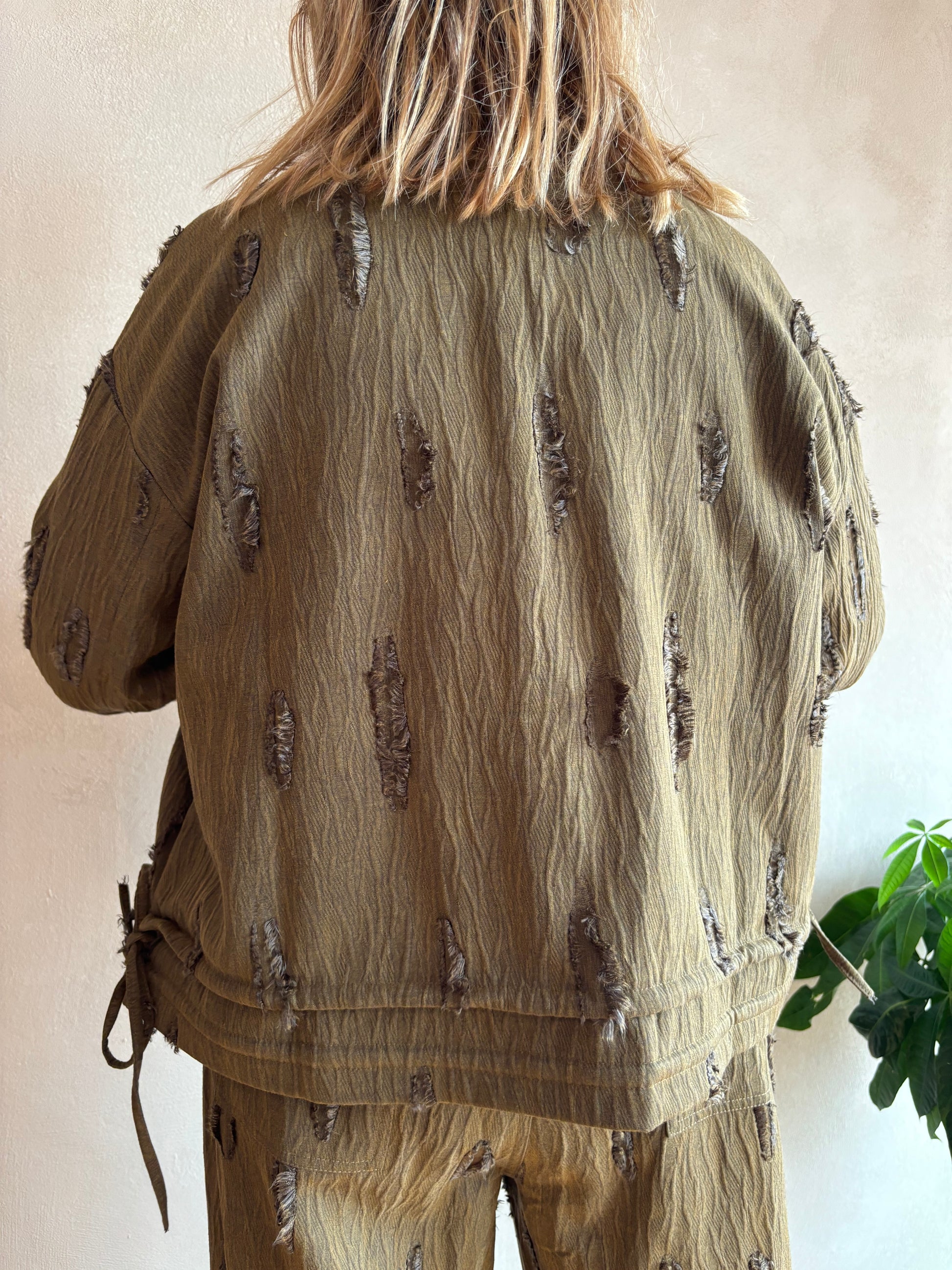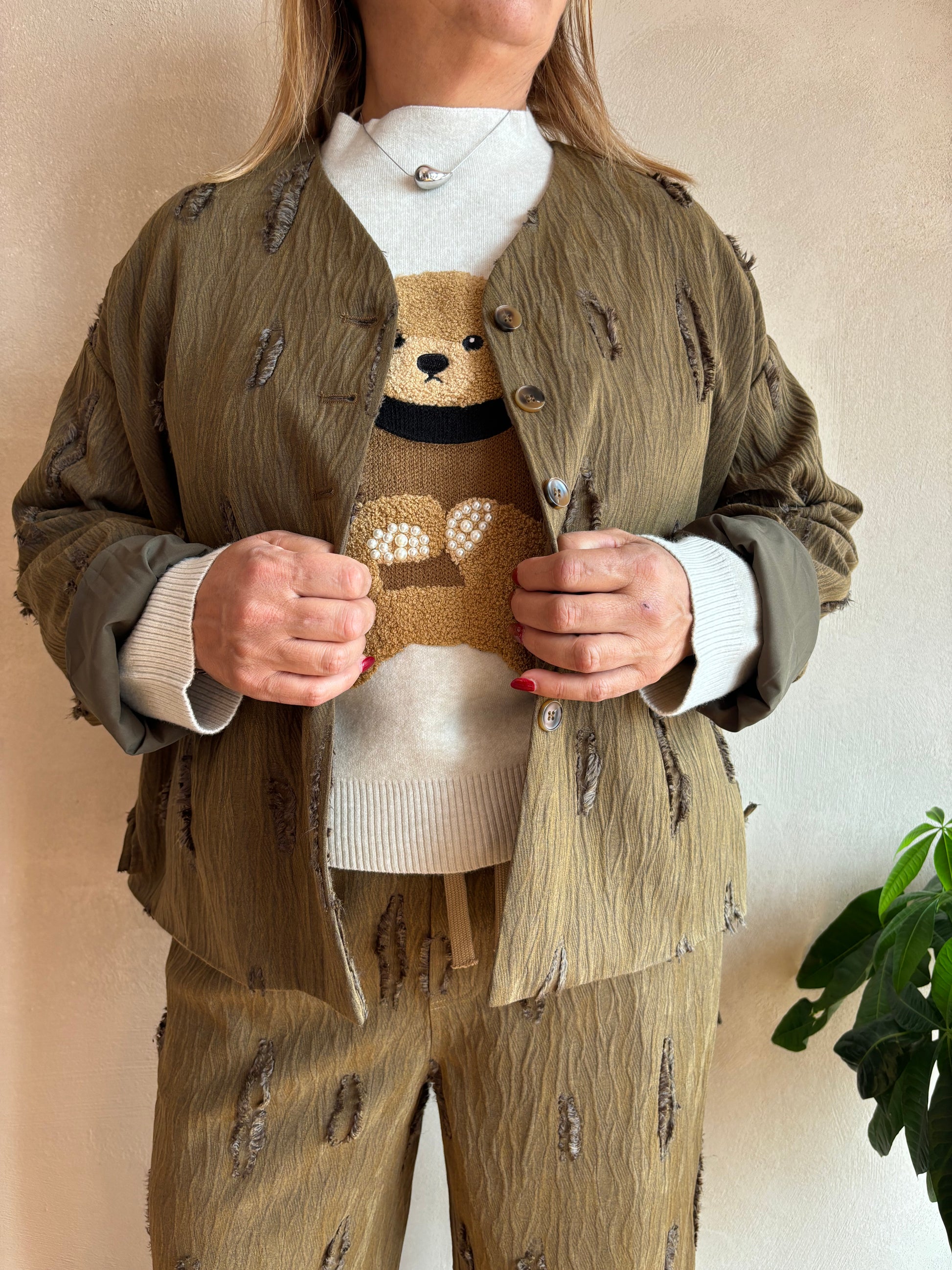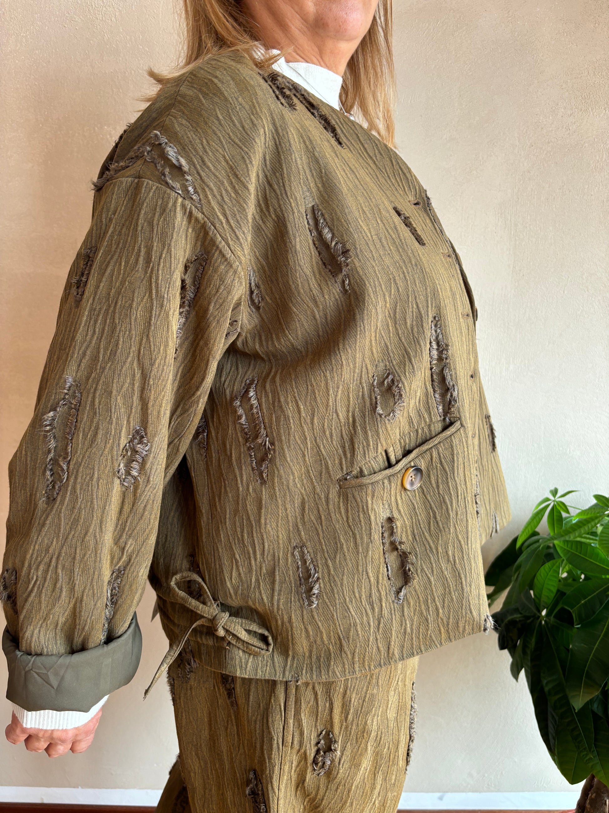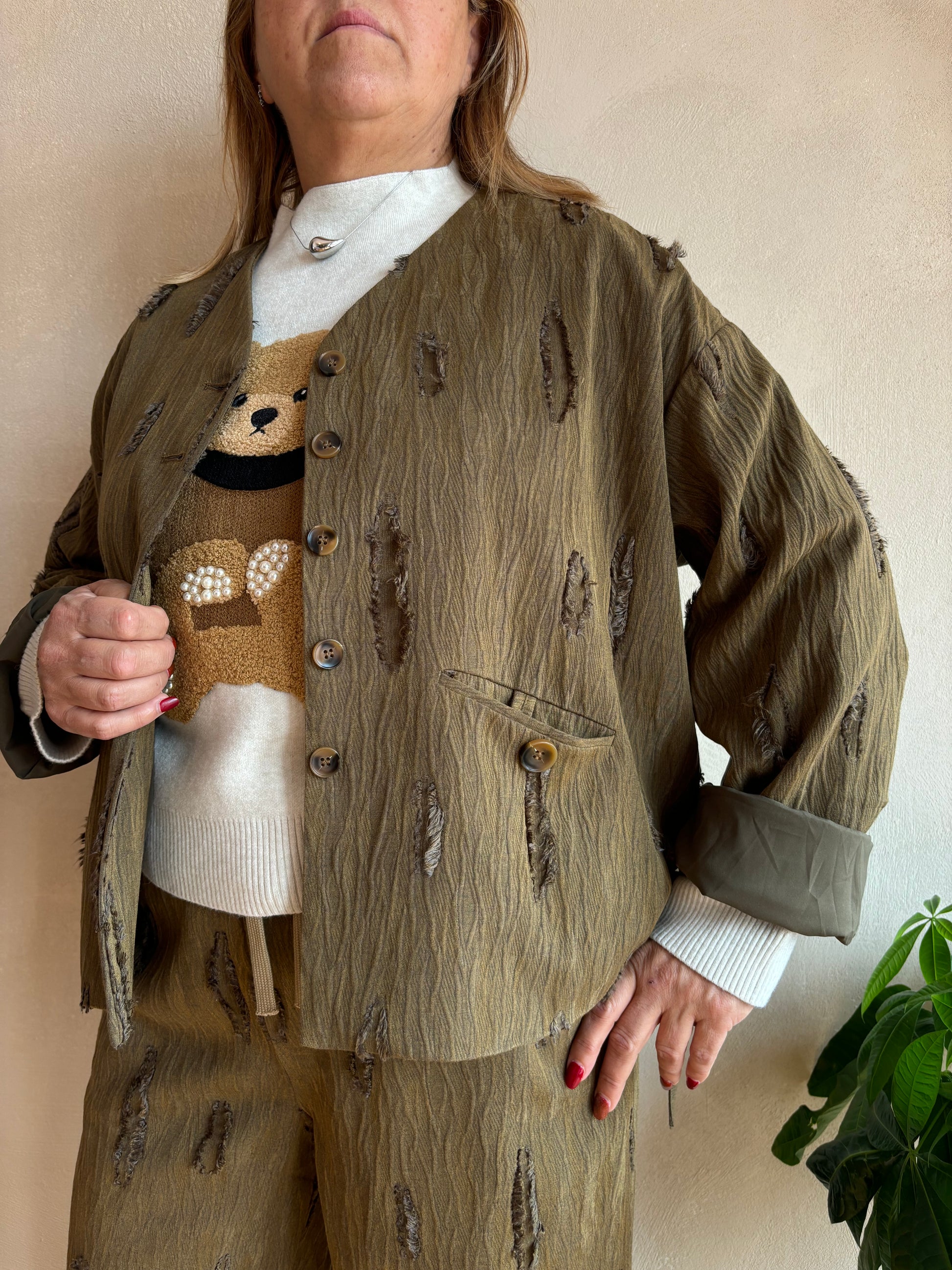 Giacca modello over, foderata, scollo a V, abbottonatura frontale, manica lunga. Tasche frontali con bottoncino e occhiello, laccetti laterali sul fondo. Taglia unica veste fino ad una 48