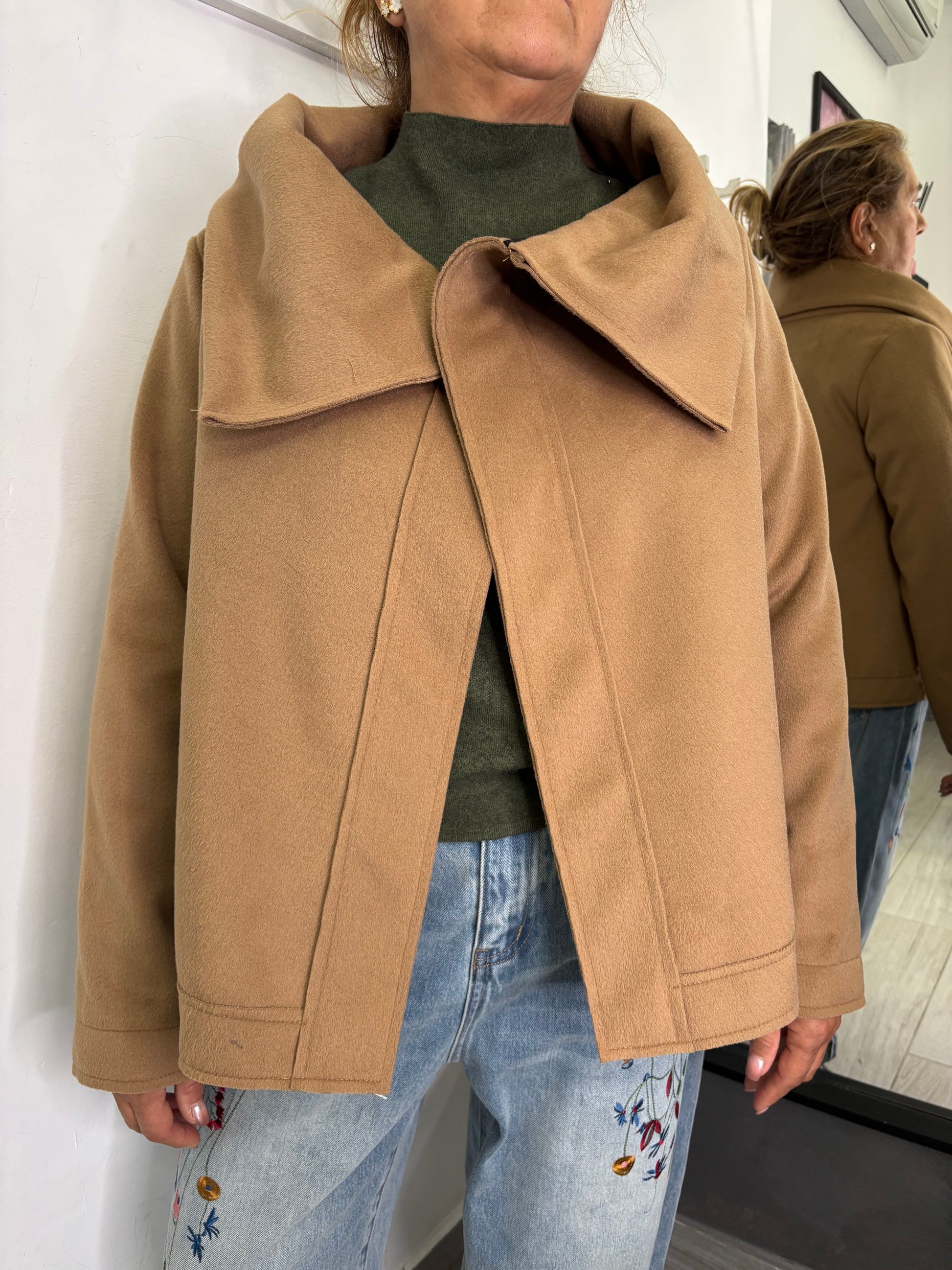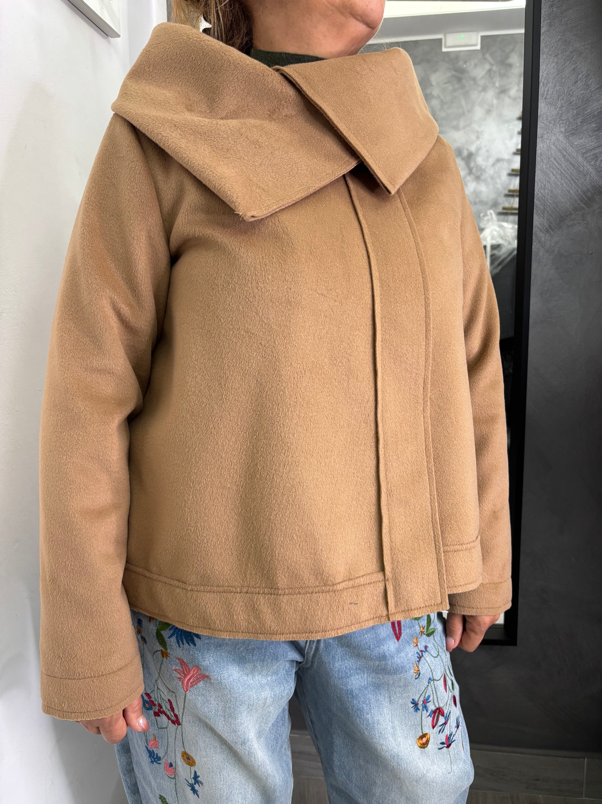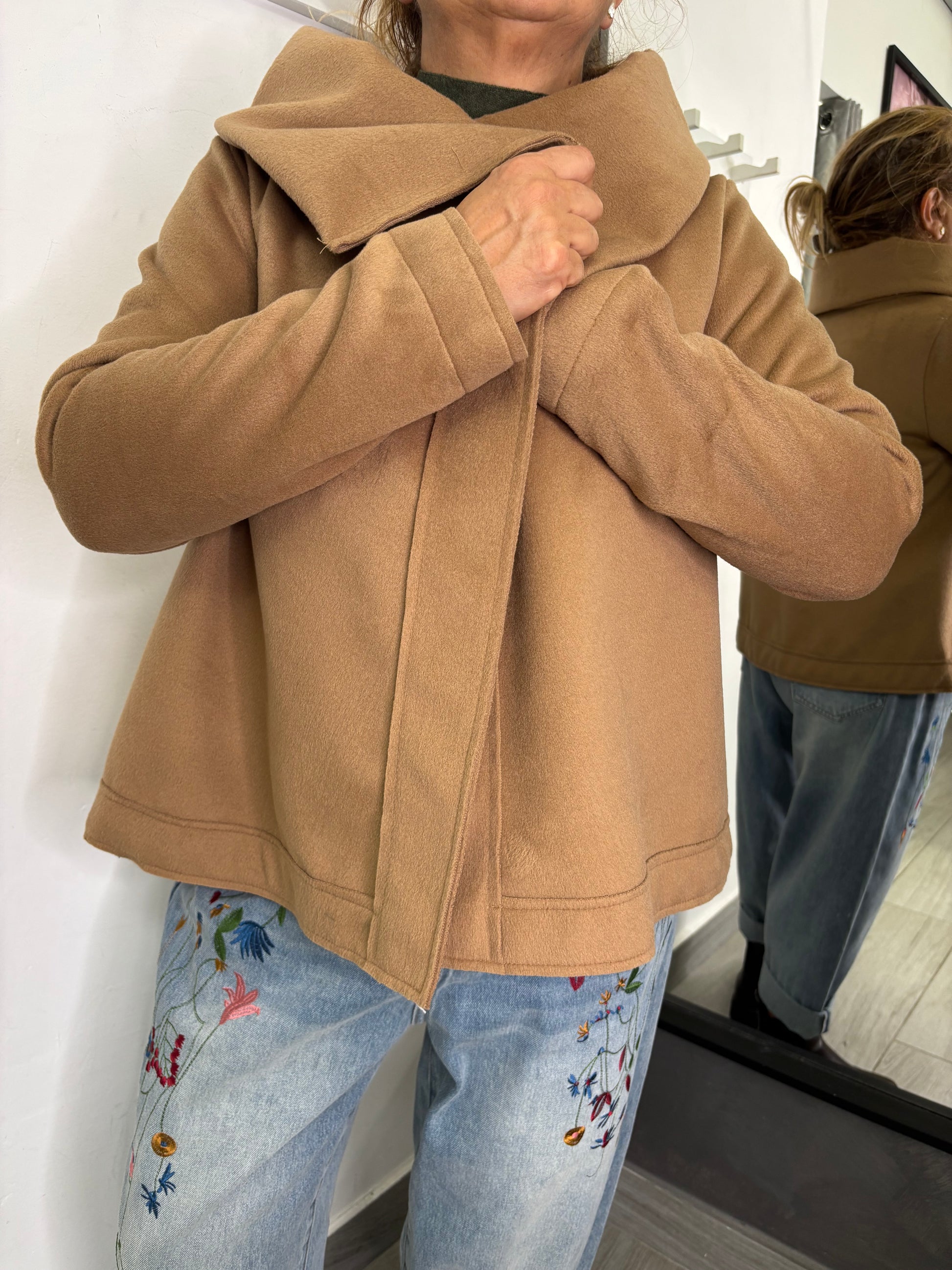 Giacca in simil panno con collo ad anello, abbottonatura a doppio petto, leggermente svasata sul fondo. Taglia unica veste fino ad una 46. Composizione 100% poliestere