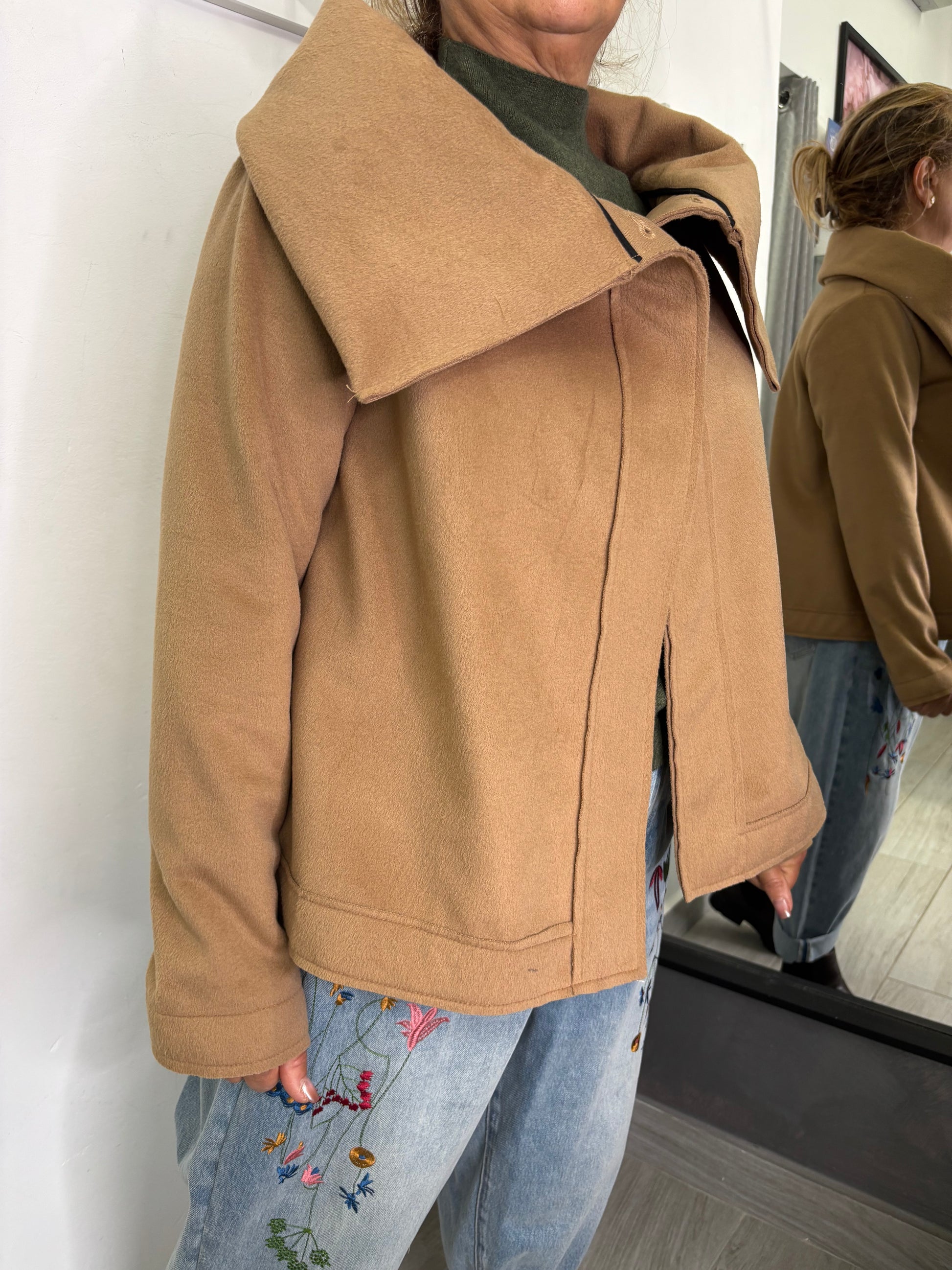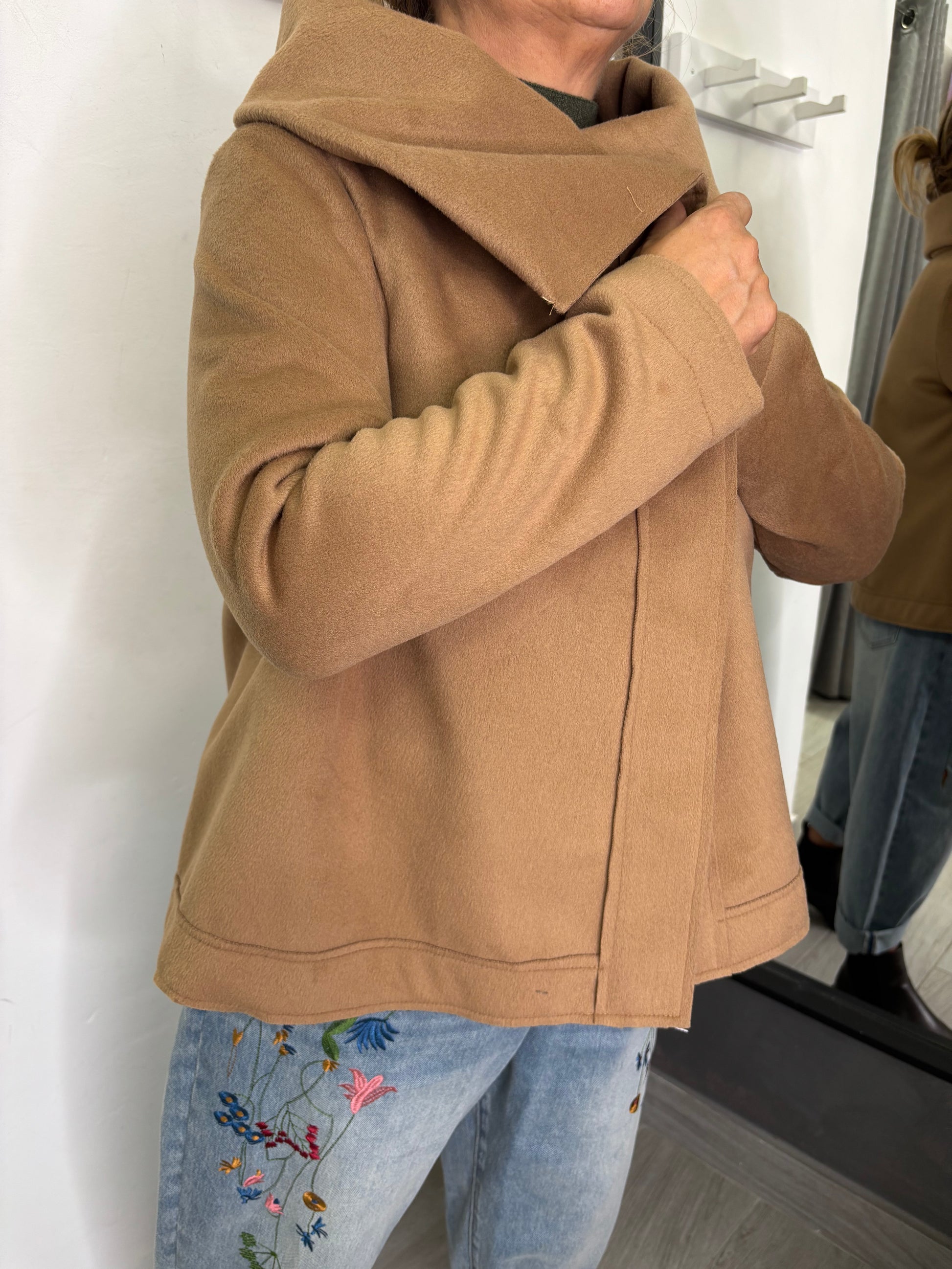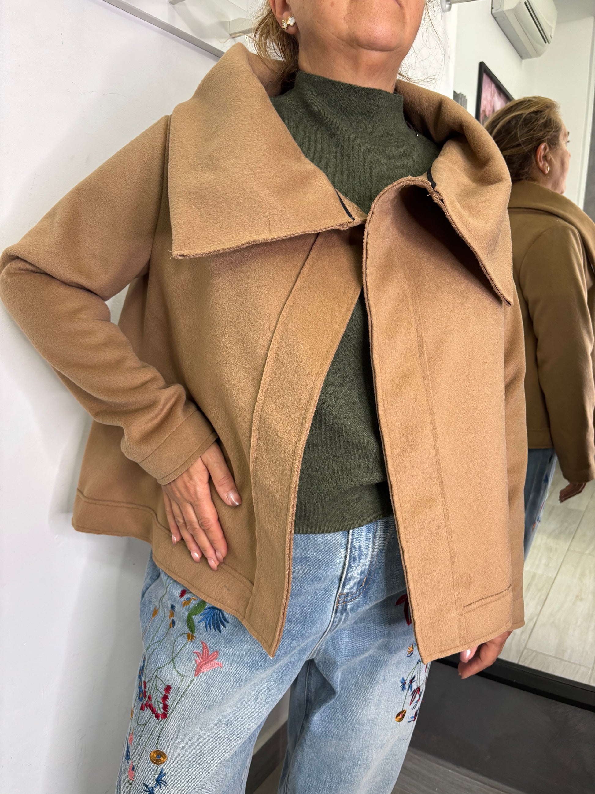 Giacca in simil panno con collo ad anello, abbottonatura a doppio petto, leggermente svasata sul fondo. Taglia unica veste fino ad una 46. Composizione 100% poliestere