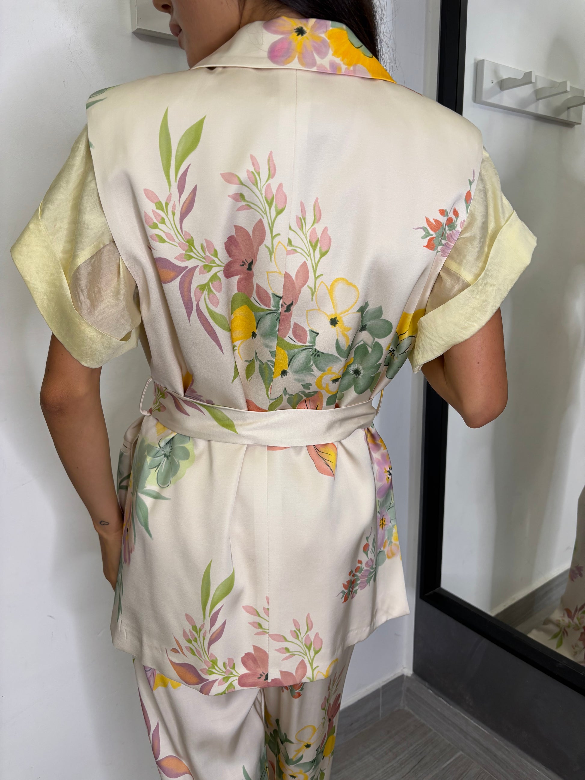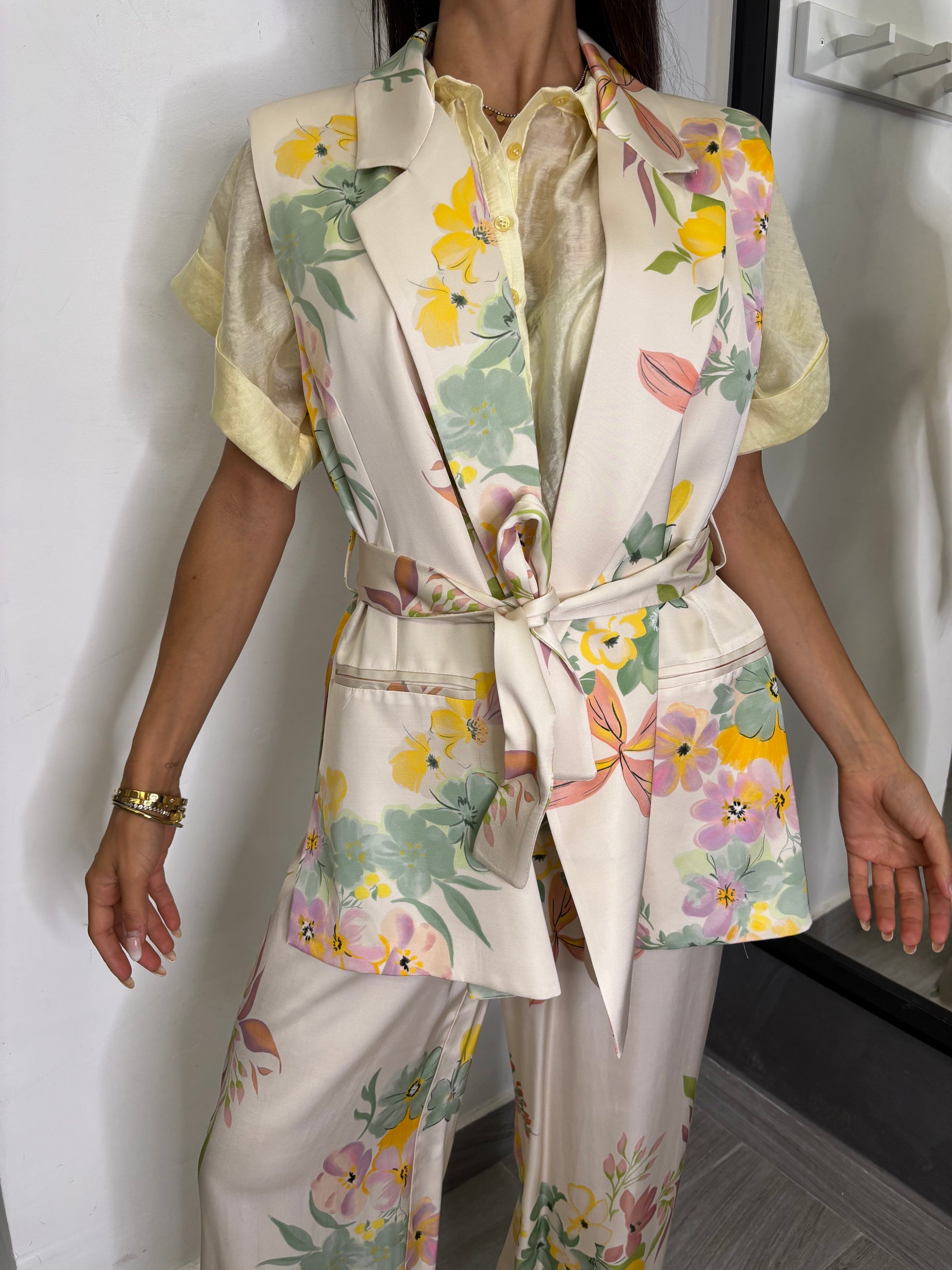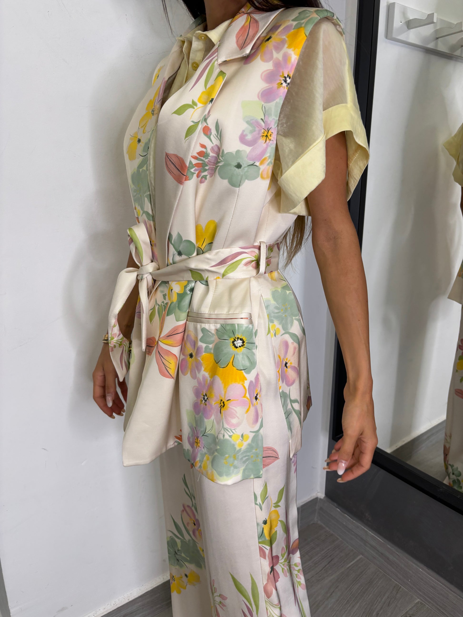Gilet a fuori foderato, collo con reverse e abbottonatura con cintura e spacchi sui fianchi . Composizione 100% viscosa