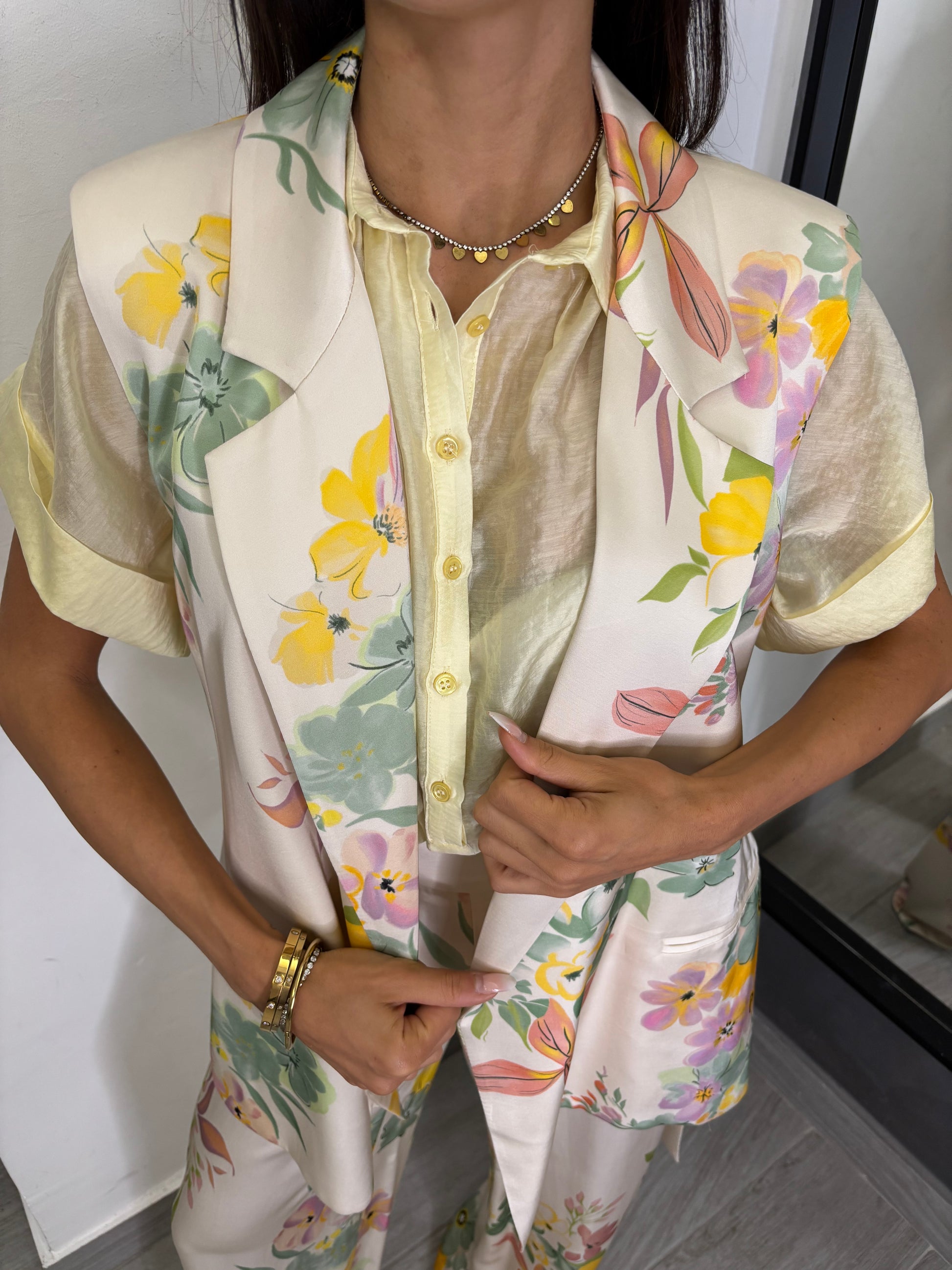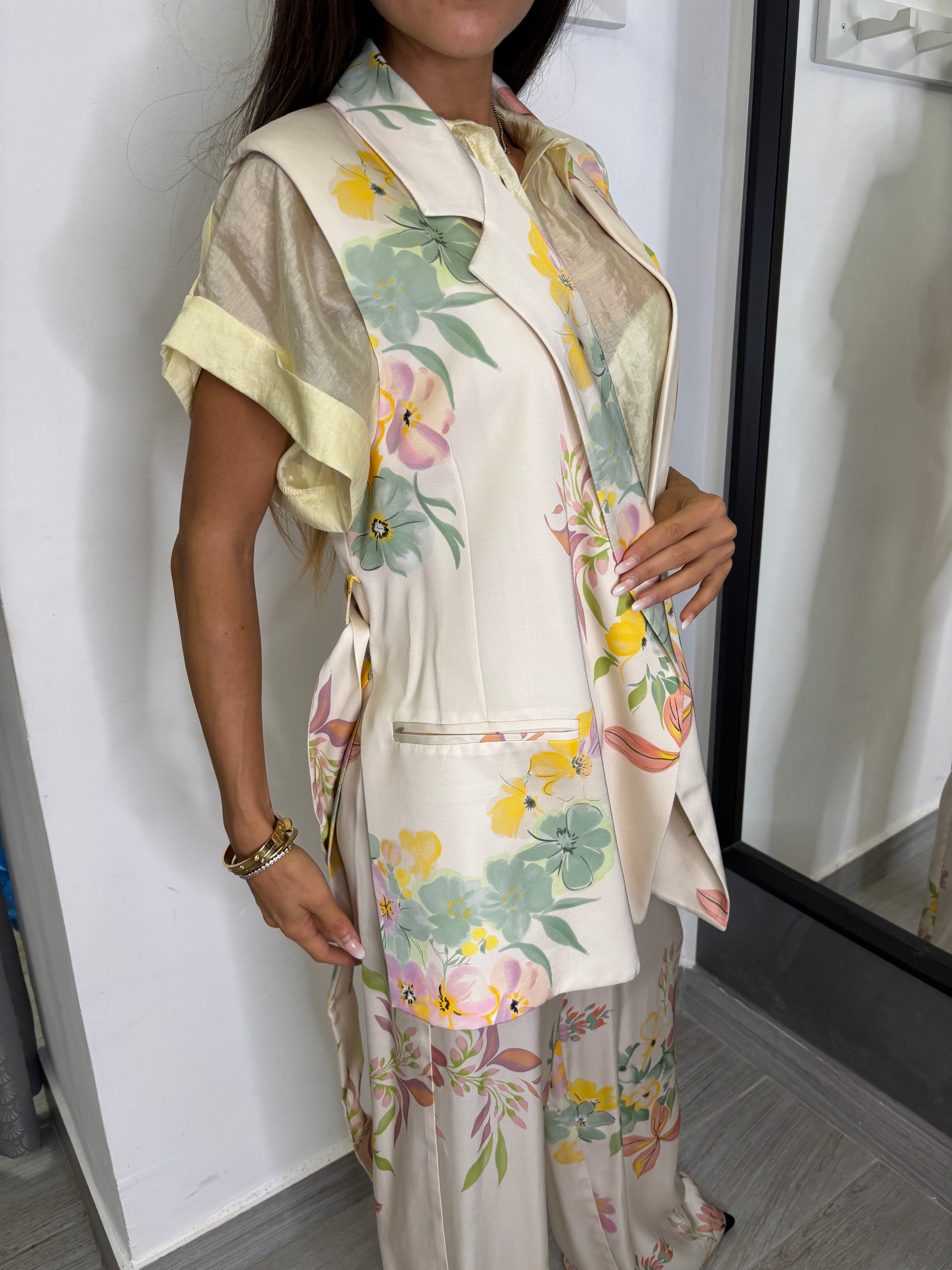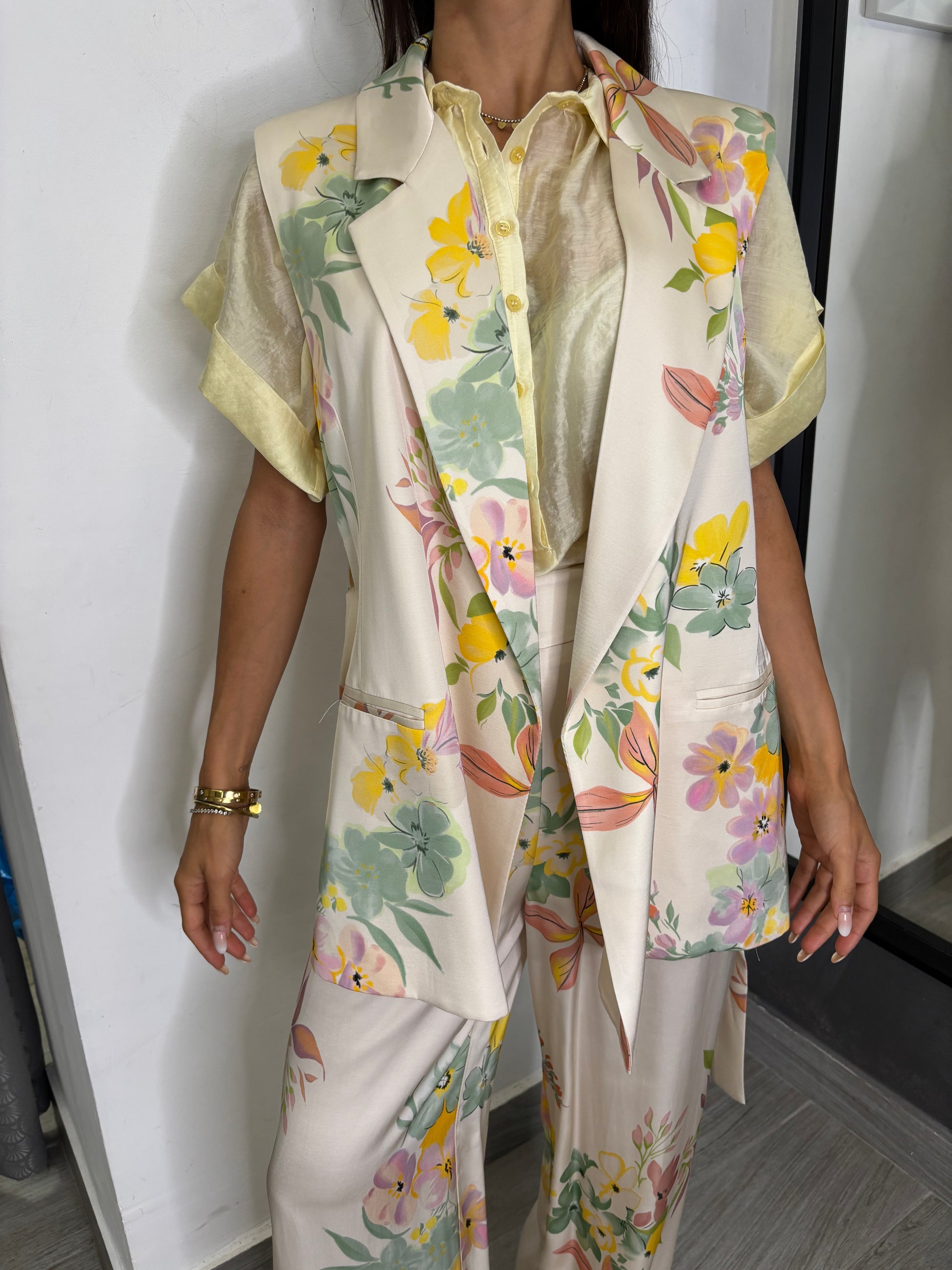 Gilet a fuori foderato, collo con reverse e abbottonatura con cintura e spacchi sui fianchi . Composizione 100% viscosa