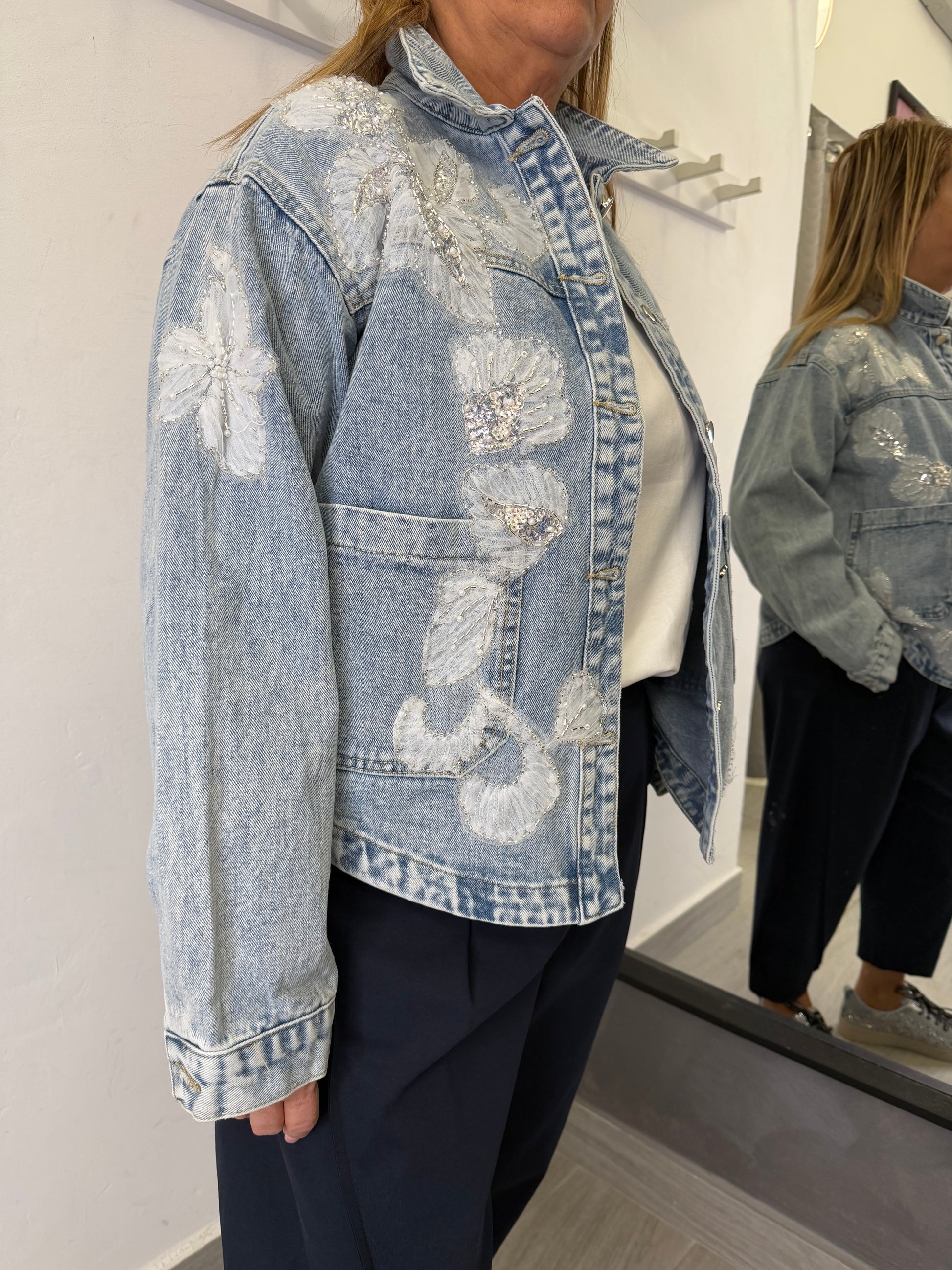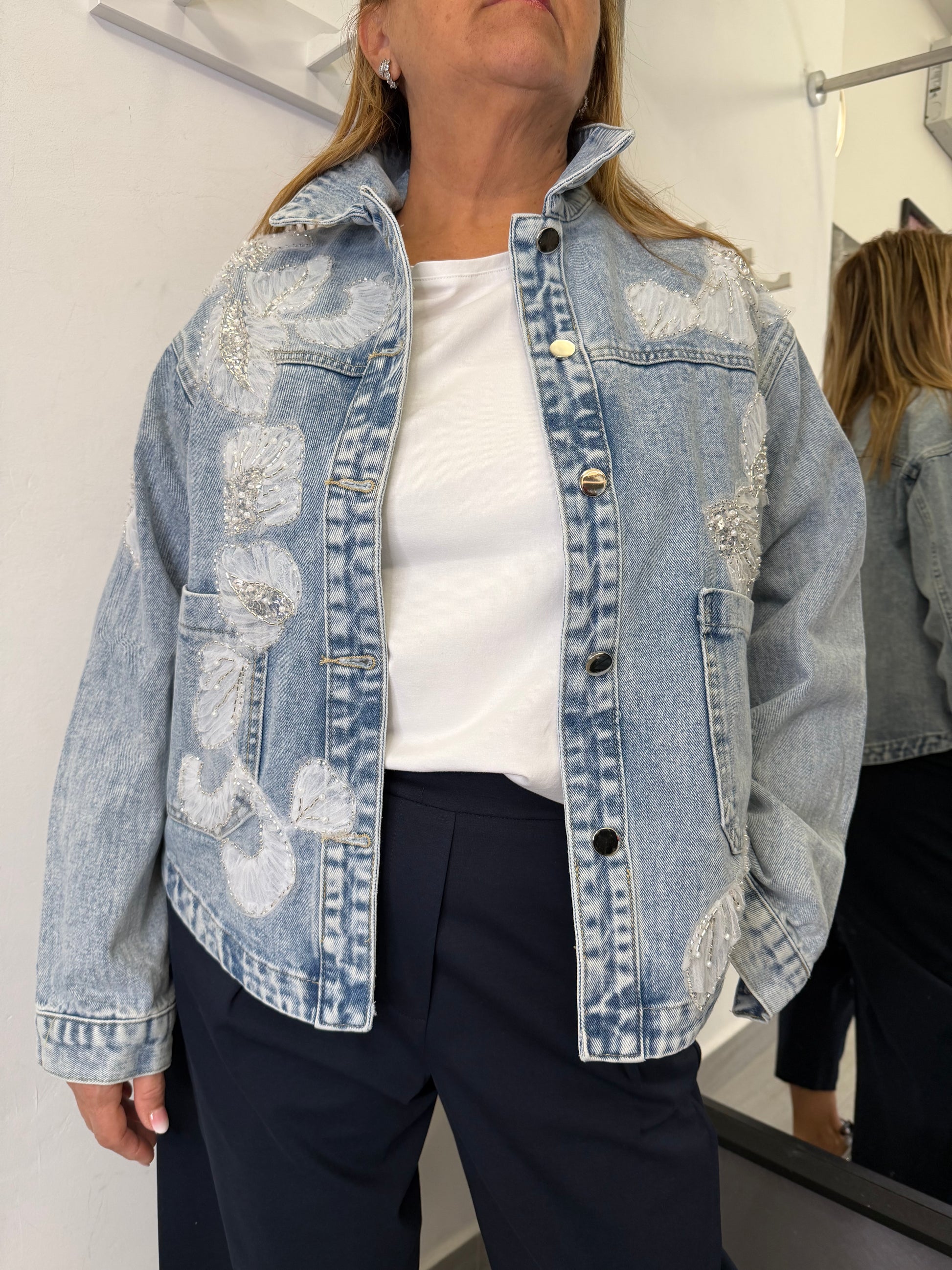 Giubbotto in tessuto di jeans, applicazioni in tulle e perline, abbottonatura frontale con tasche applicate, stondata sui fianchi.Composizione 95% cotone 5% elastan