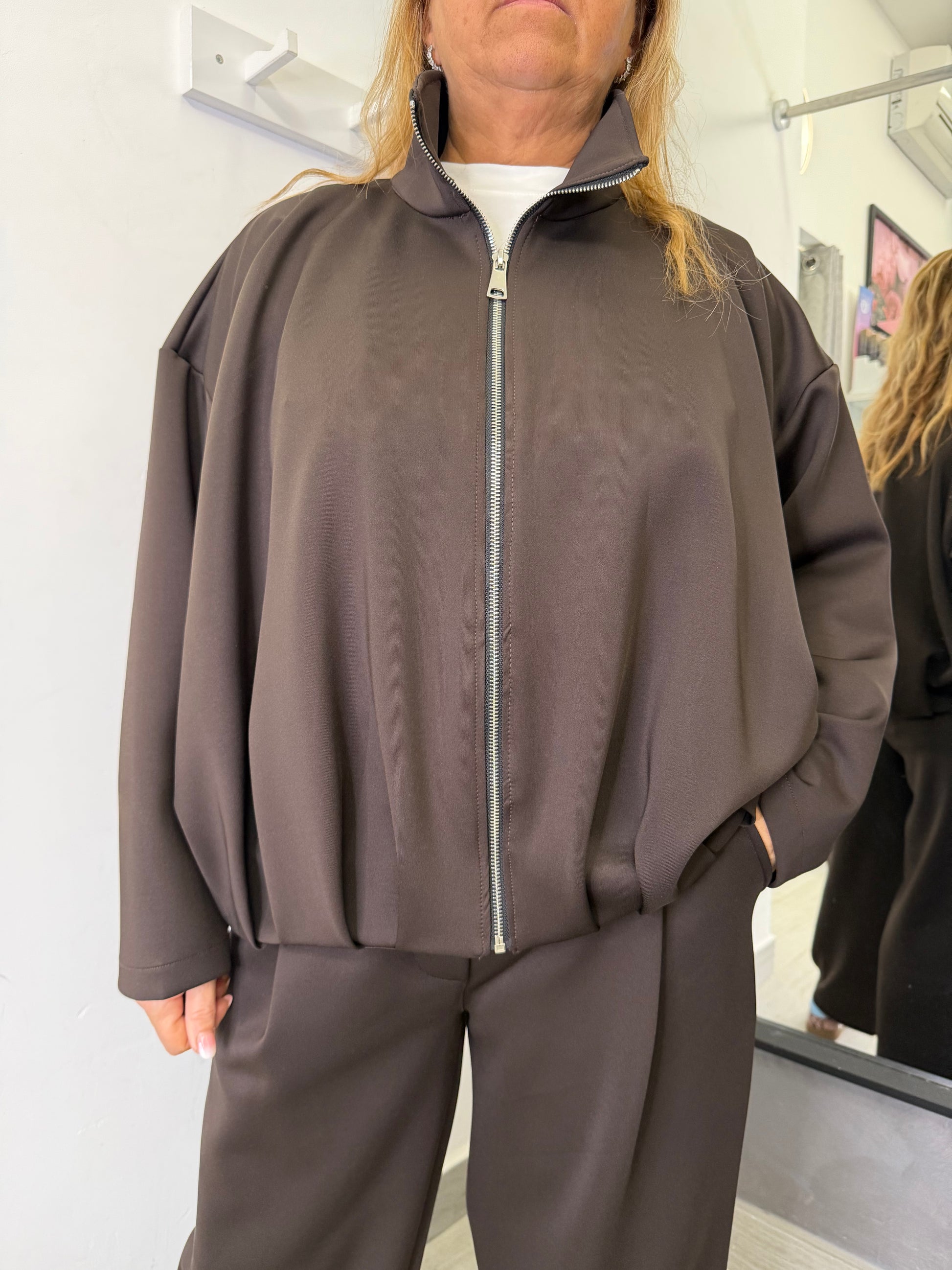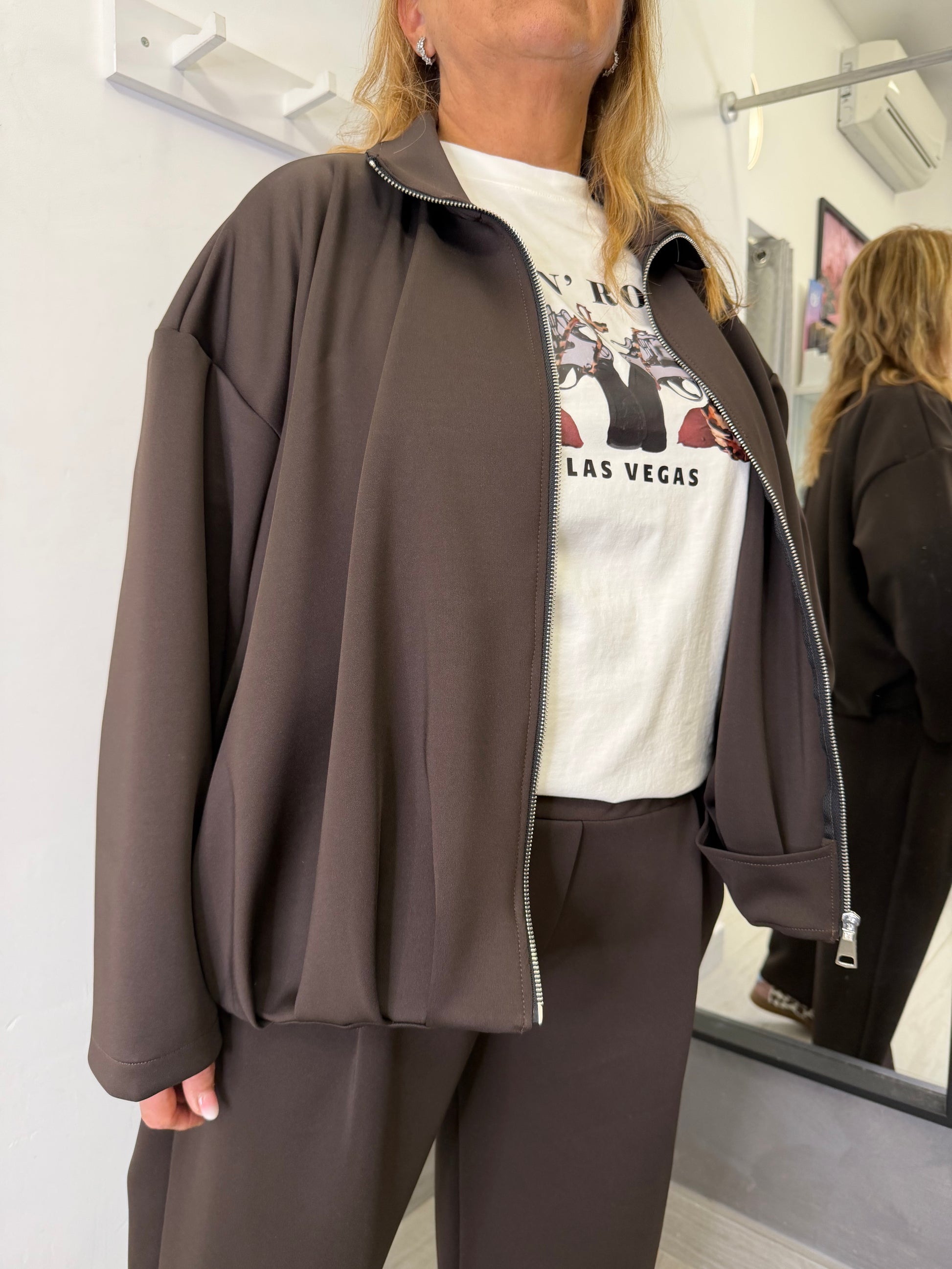 Giubbotto modello oversize con spalla che scende, chiusura con cerniera e pieghe cucite nella parte finale. Taglia unica veste fino ad una 48. Composizione 89% poliestere 11% elastan
