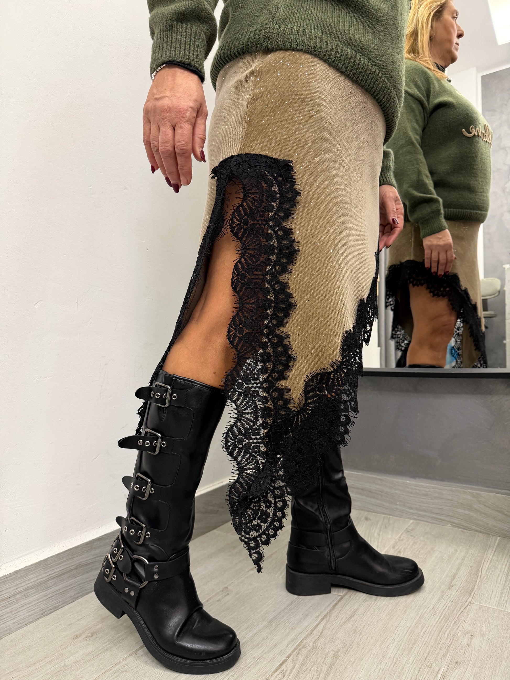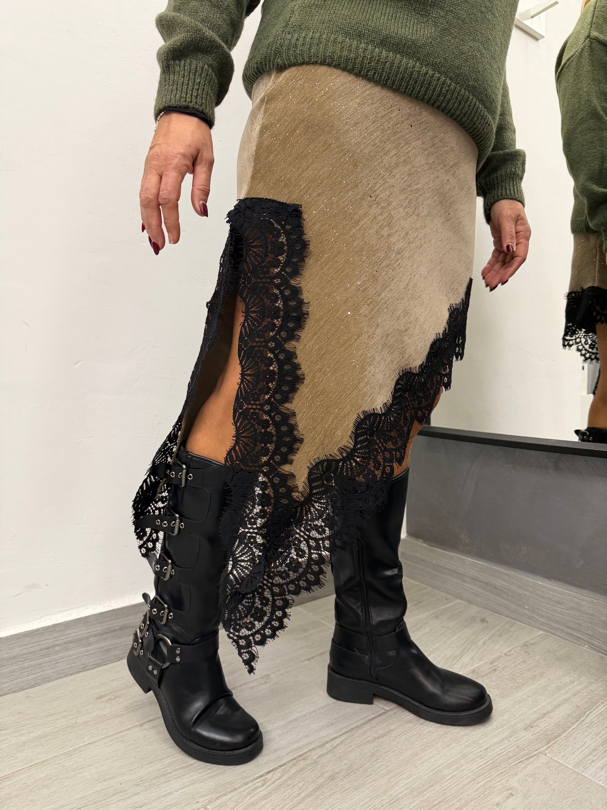 Gonna in tessuto con micro paillettes, punta laterale rifinita con pizzo nero. Taglia unica veste fino ad una 46. Composizione 93% poliestere 7% elastan