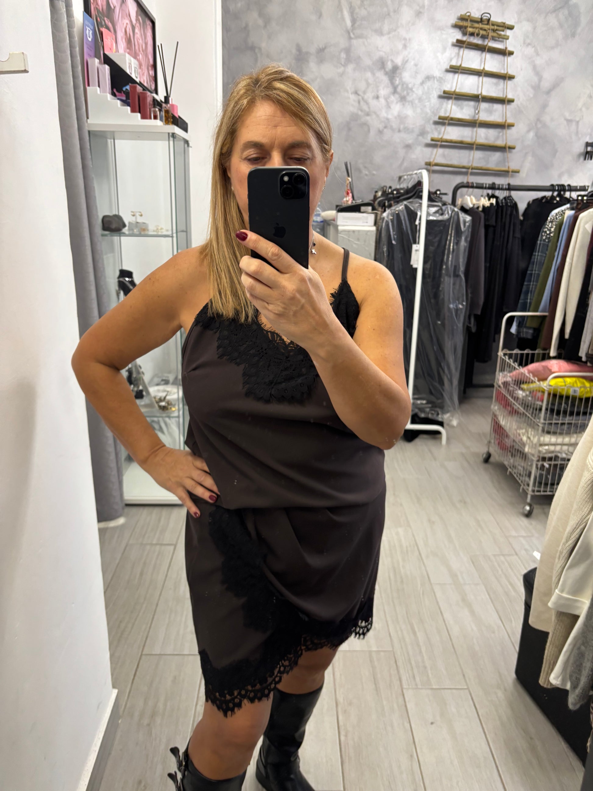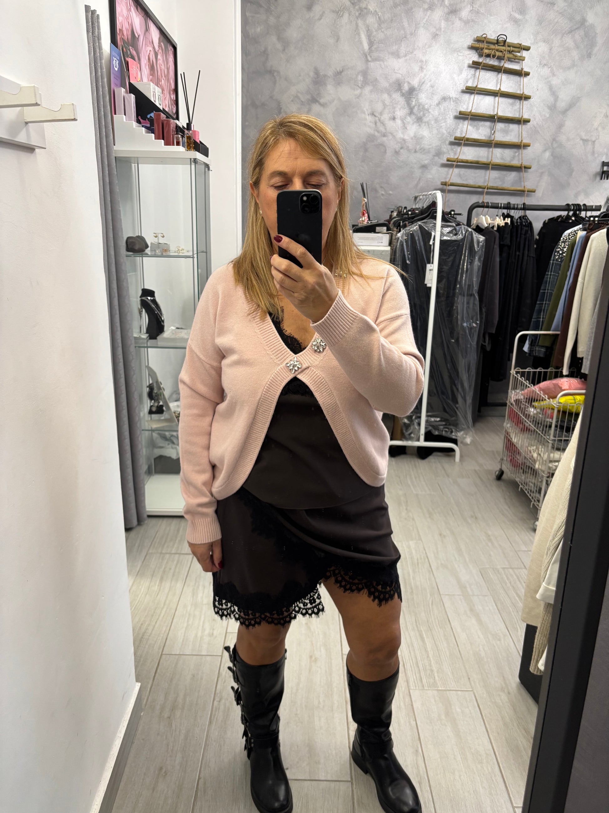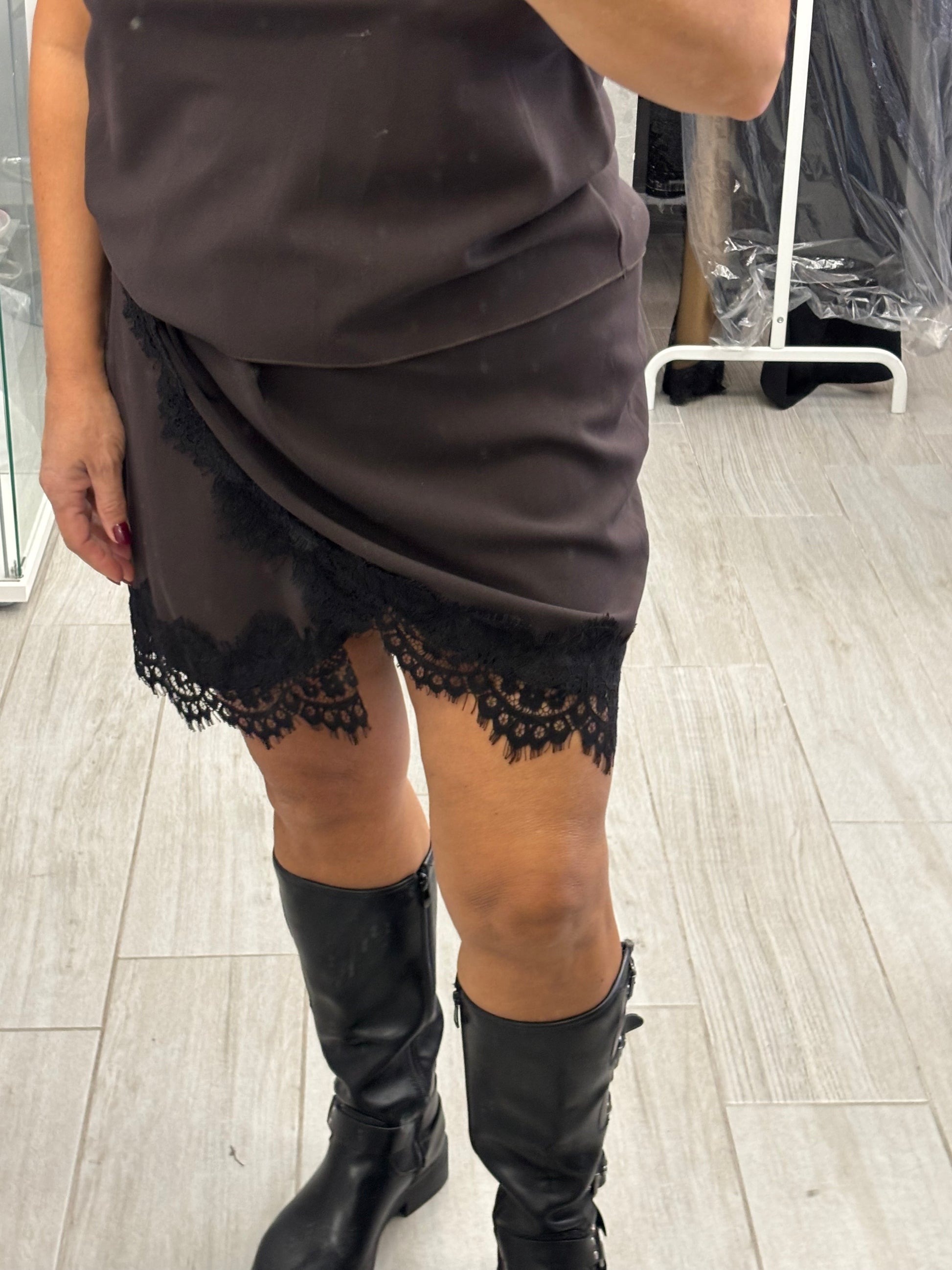 Gonna modello a portafoglio con elastico in vita nella parte posteriore e davanti pieghe cucine. Dettaglio bordatura in pizzo a contrasto nel colore nero. Taglia unica veste fino ad una 46. Composizione 63% poliestere 34% viscosa 3% elastan