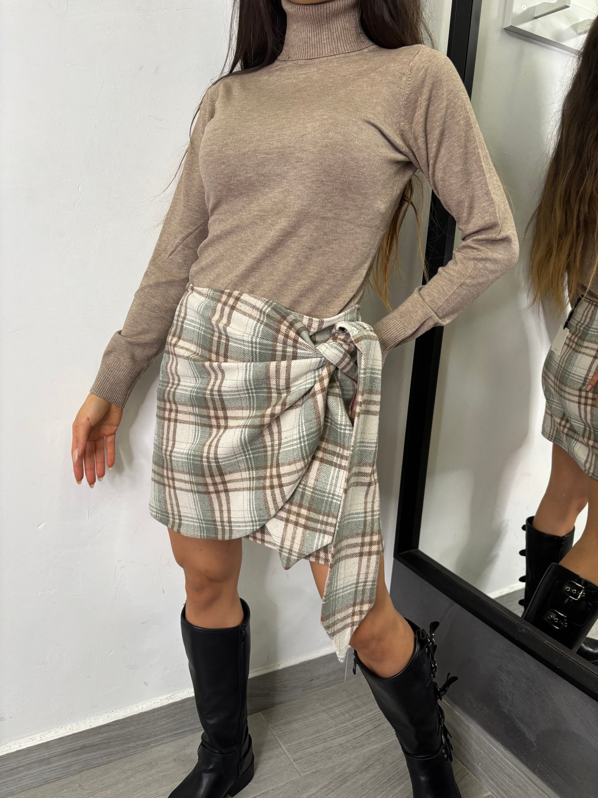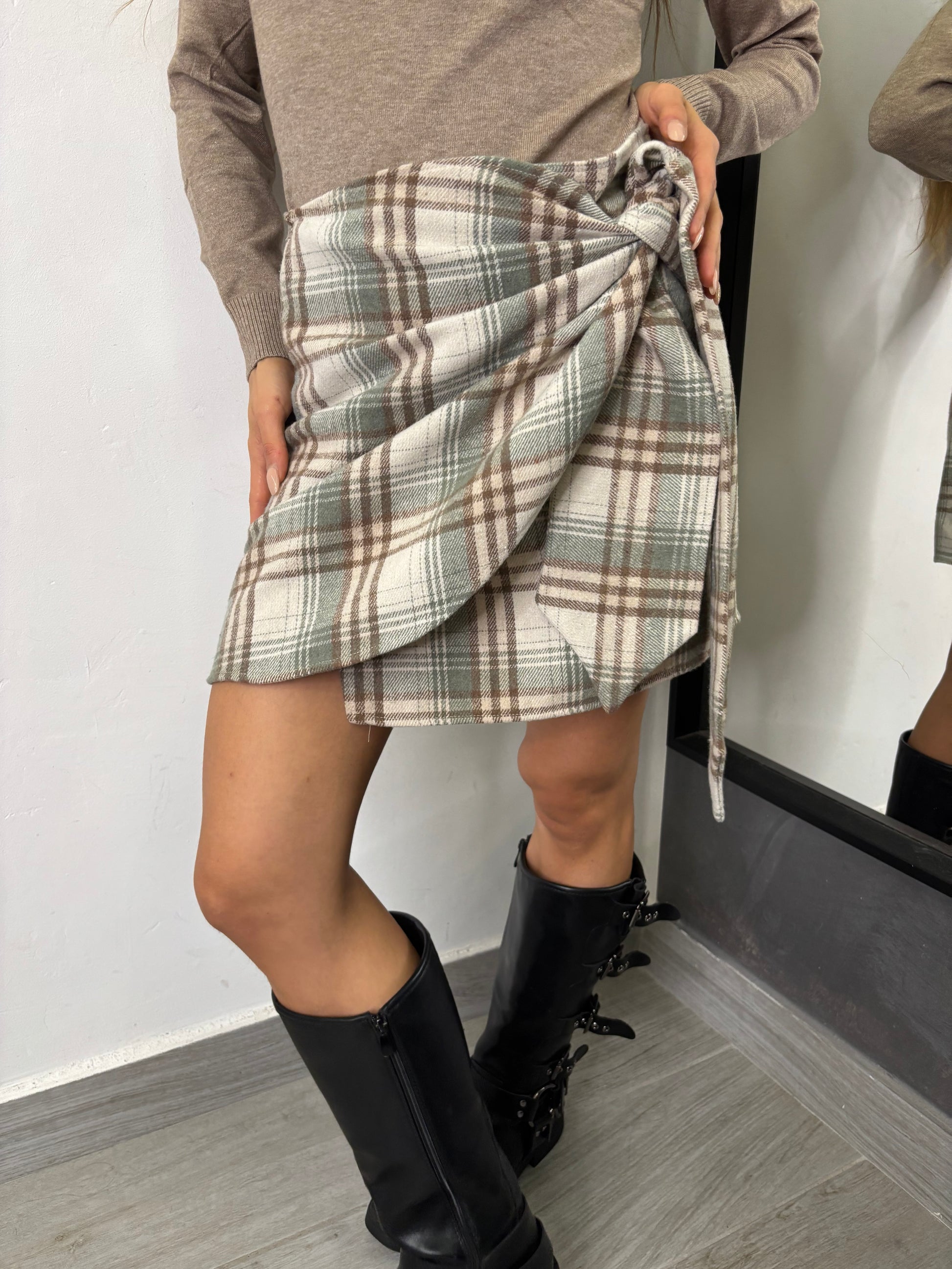 Gonna in tessuto pesante a quadri nei colori del burro, verde bosco e tortora. Modello a portafoglio. Composizione 64% poliestere 20% cotone 12% viscosa 4% elastan.
