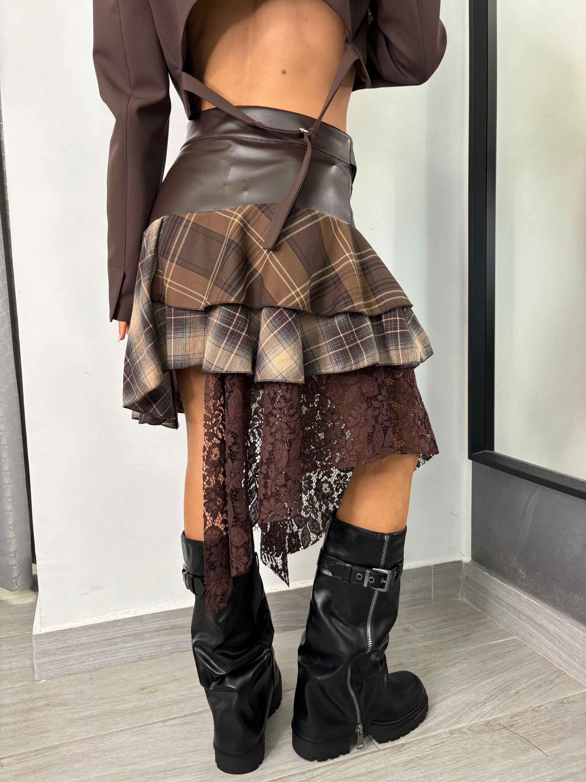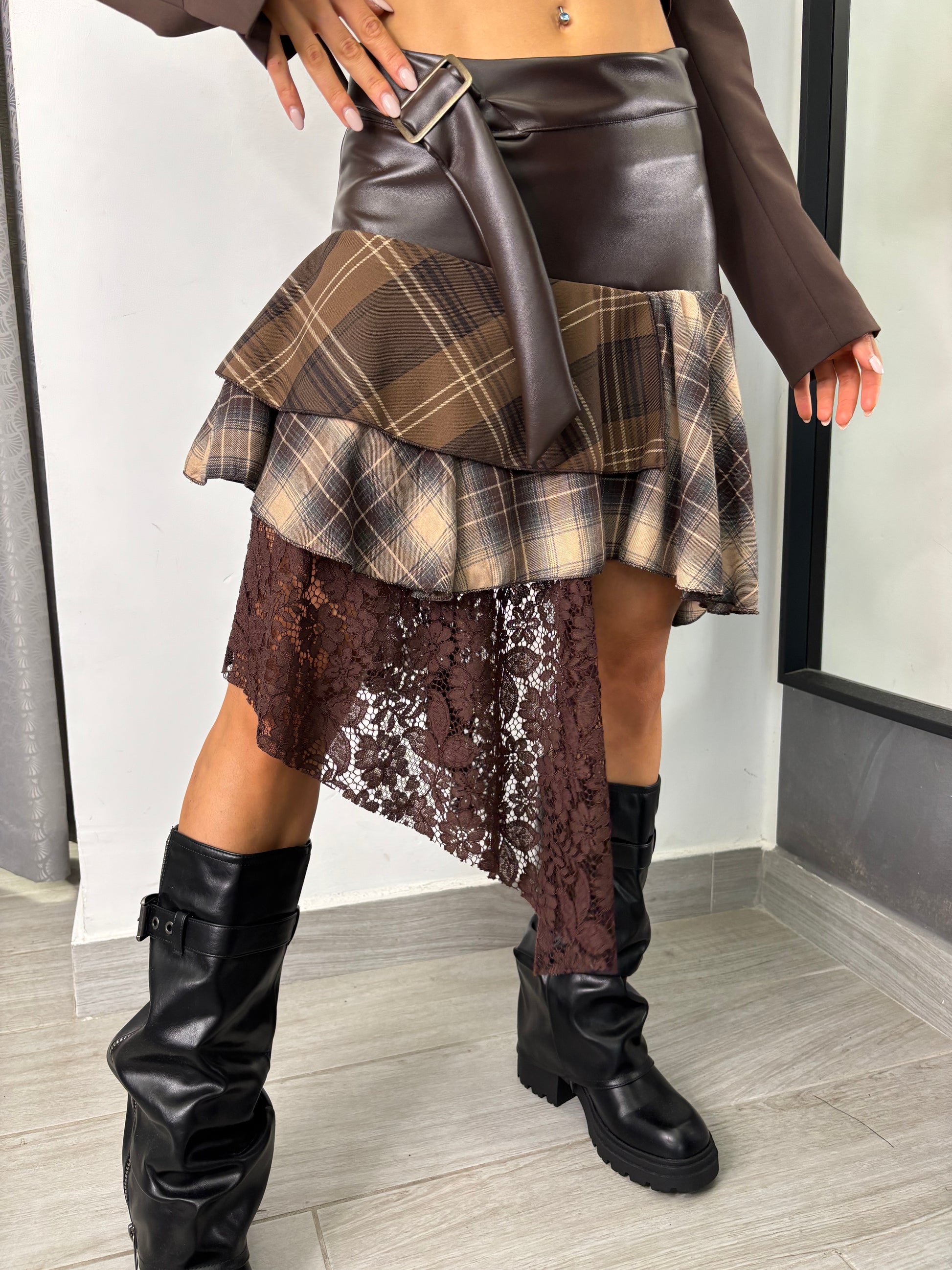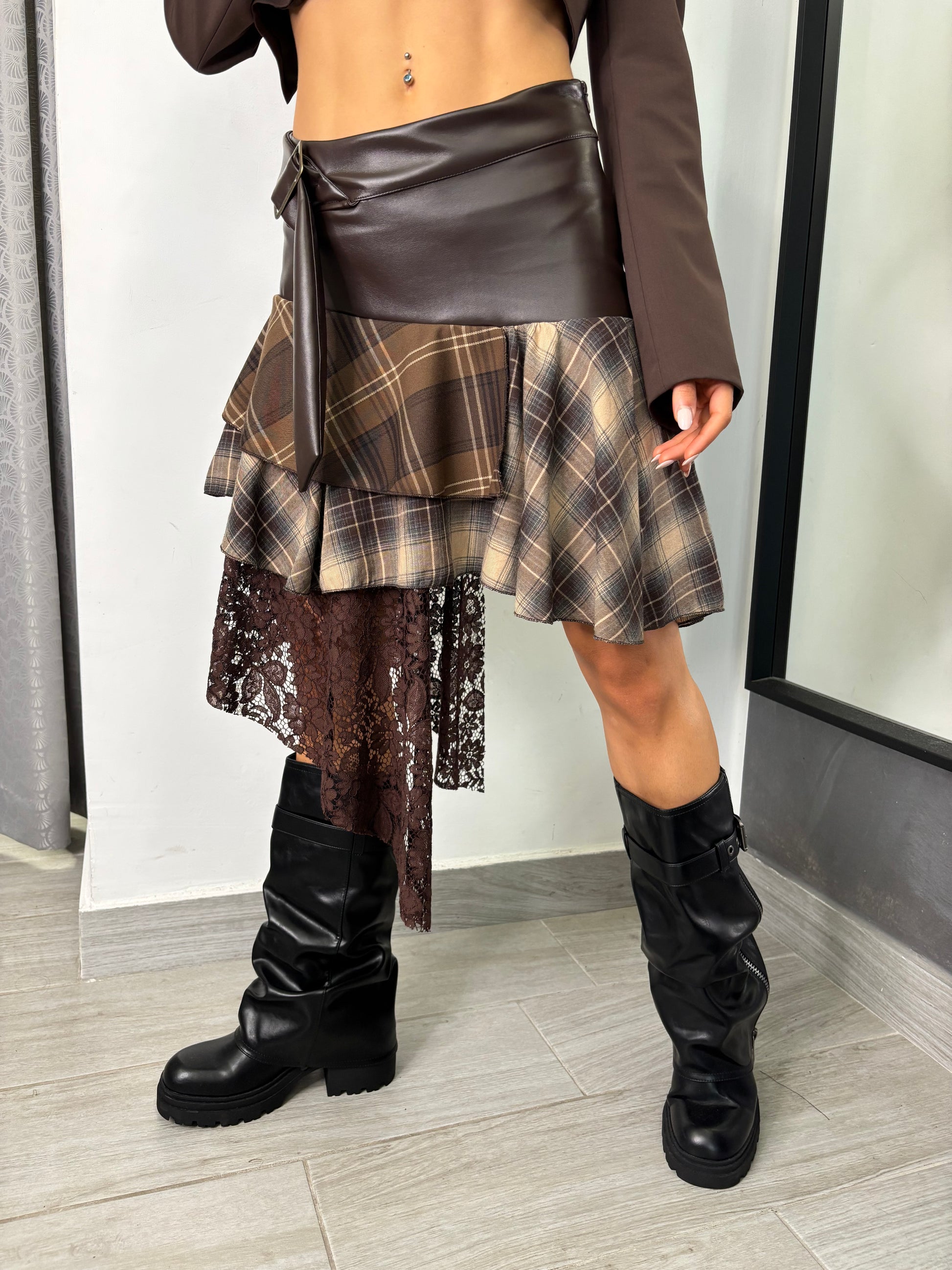 Gonna in tessuto a quadri con inserto in ecopelle e pizzo.