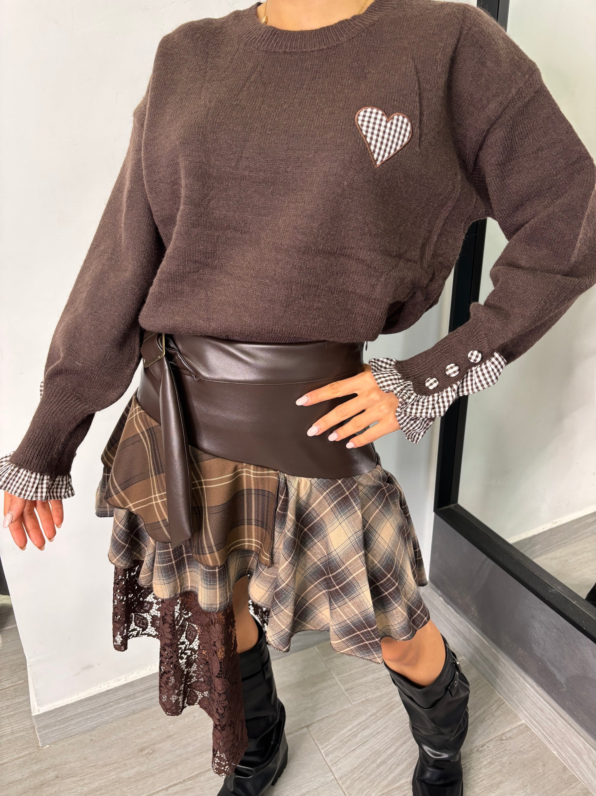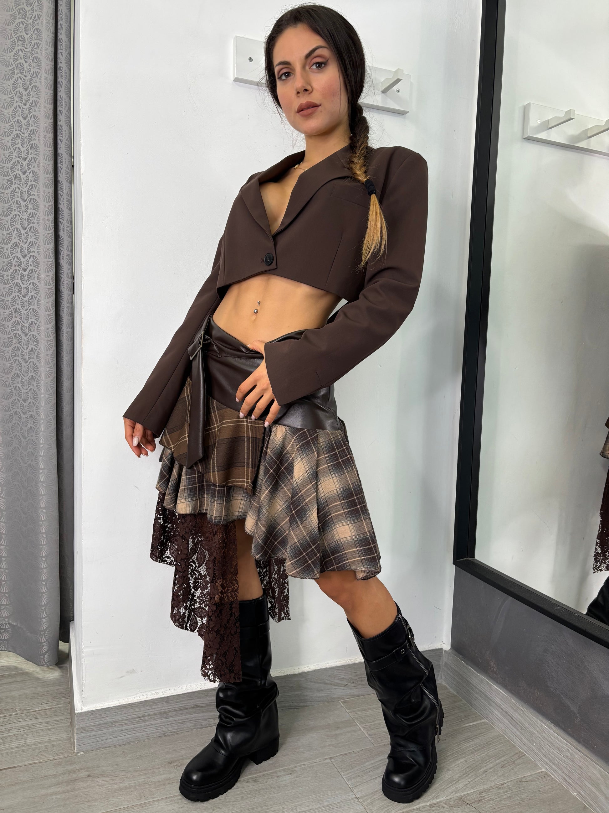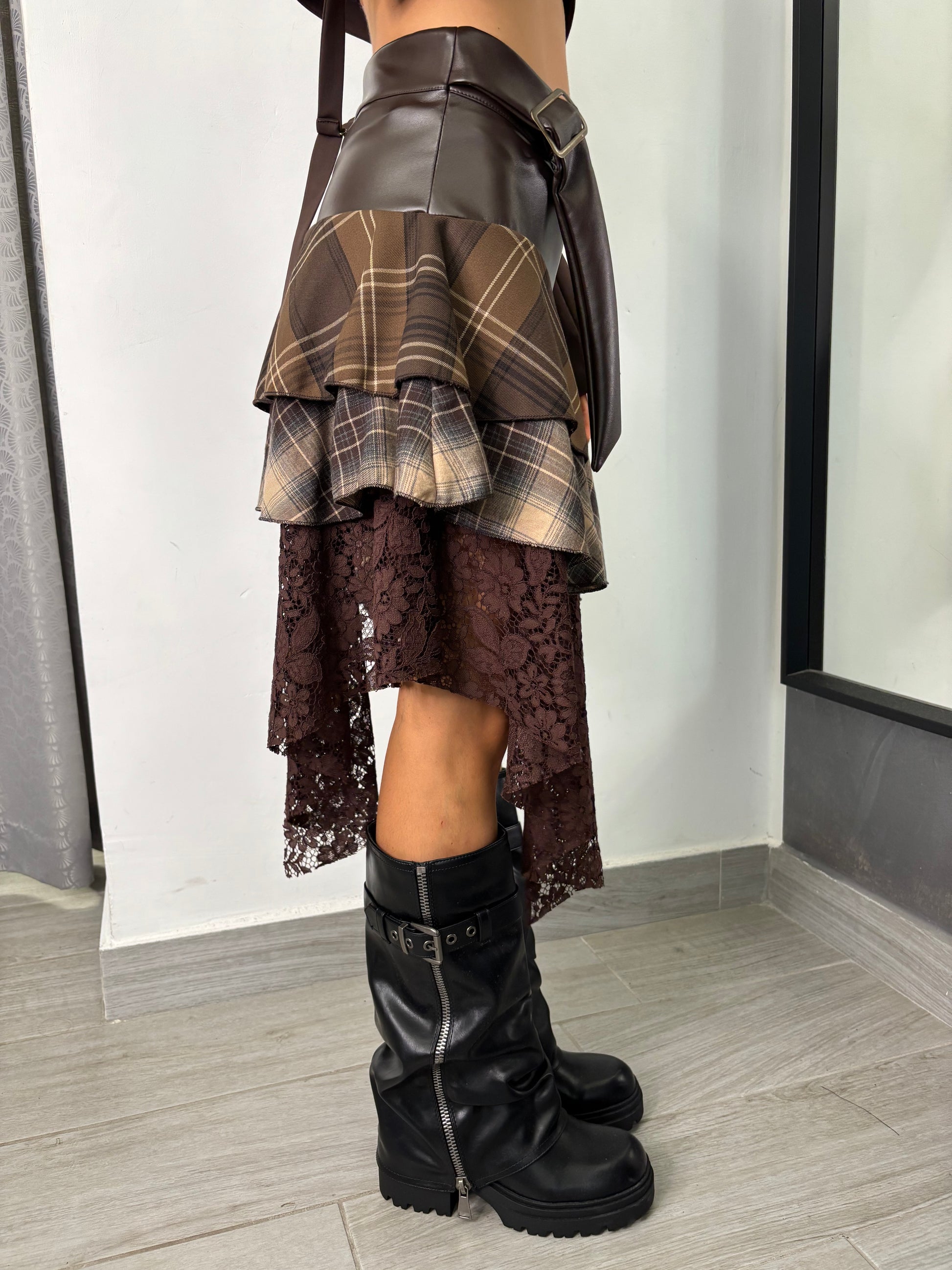 Gonna in tessuto a quadri con inserto in ecopelle e pizzo.