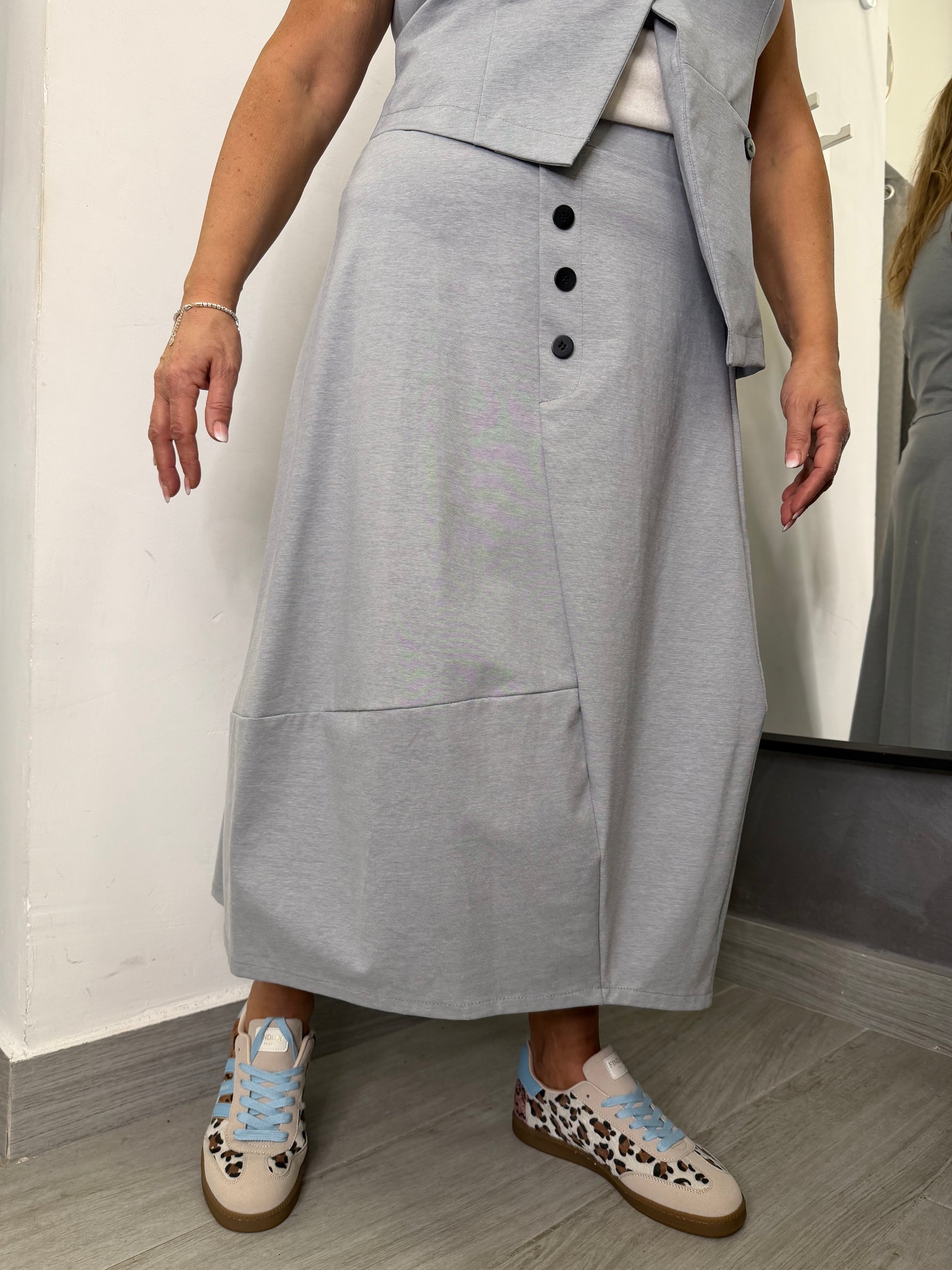 Gonna in tessuto punto Milano, modello a palloncino con elastico su tutta la circonferenza della vita, bottoni applicati sulla parte destra. Taglia unica veste fino ad una 46. Composizione 53% cotone 38% poliammide 9% elastan