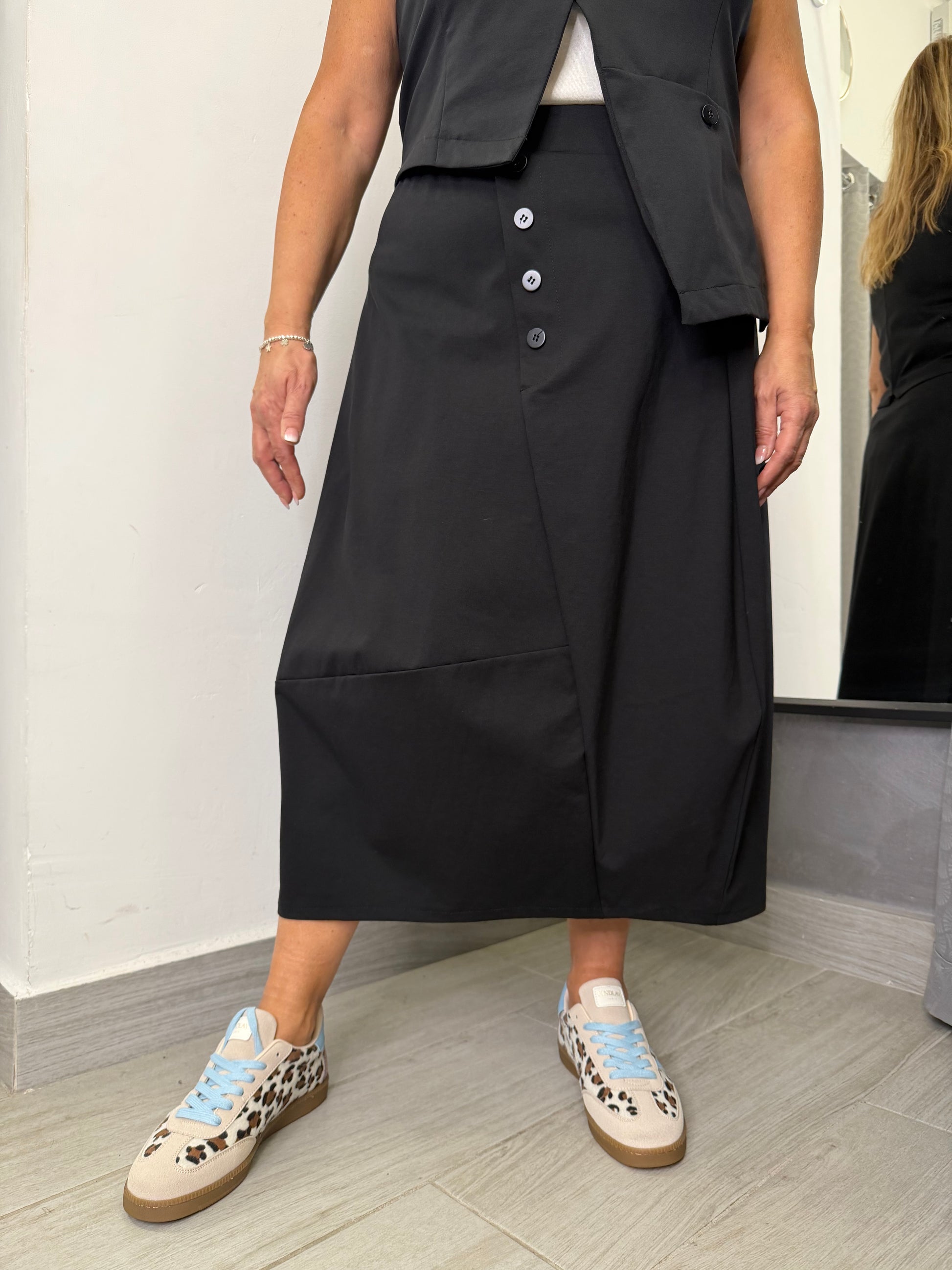Gonna in tessuto punto Milano, modello a palloncino con elastico su tutta la circonferenza della vita, bottoni applicati sulla parte destra. Taglia unica veste fino ad una 46. Composizione 53% cotone 38% poliammide 9% elastan