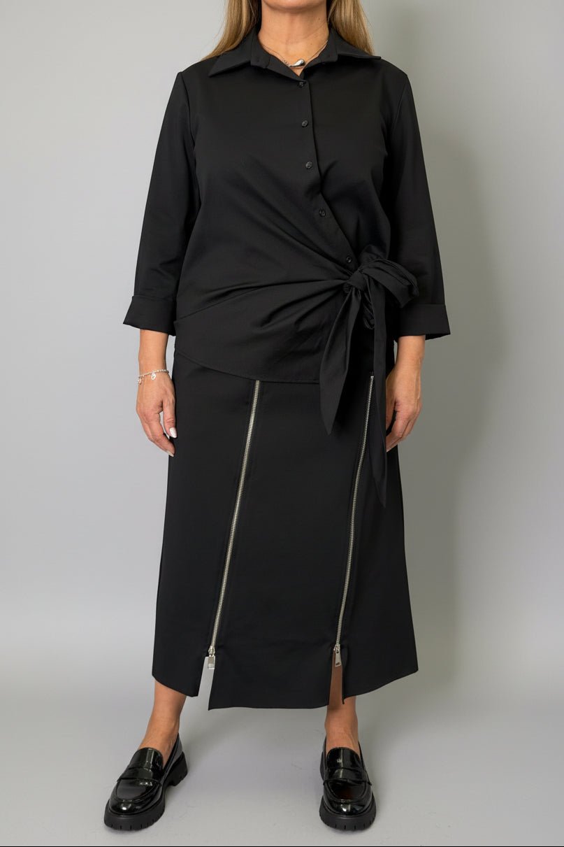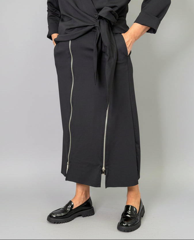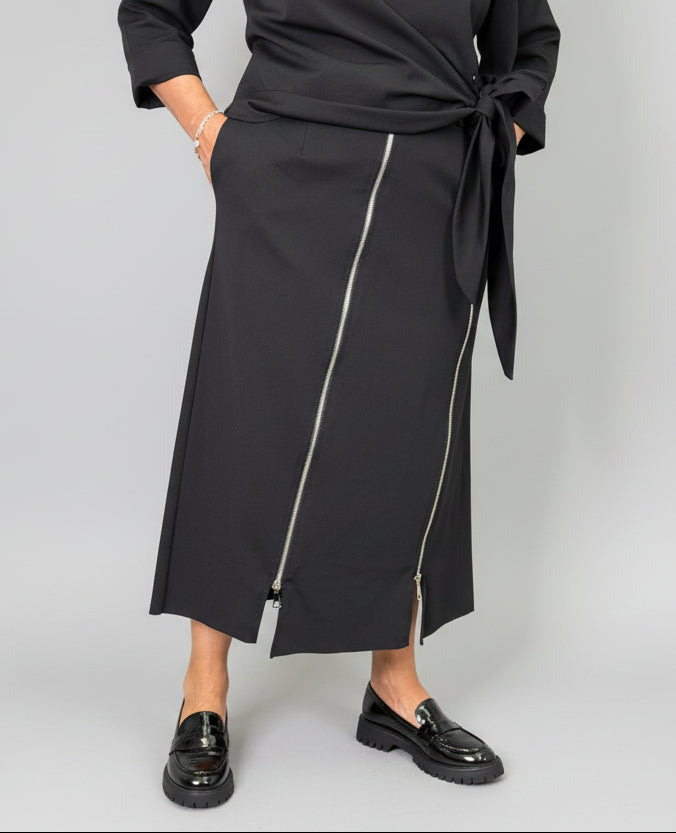 Gonna lunga in tessuto punto Milano con due cerniere sul davanti, tasche inserite nei fianchi. Taglia unica veste fino ad una 46. Composizione 53% cotone 38% nylon 9% elastan