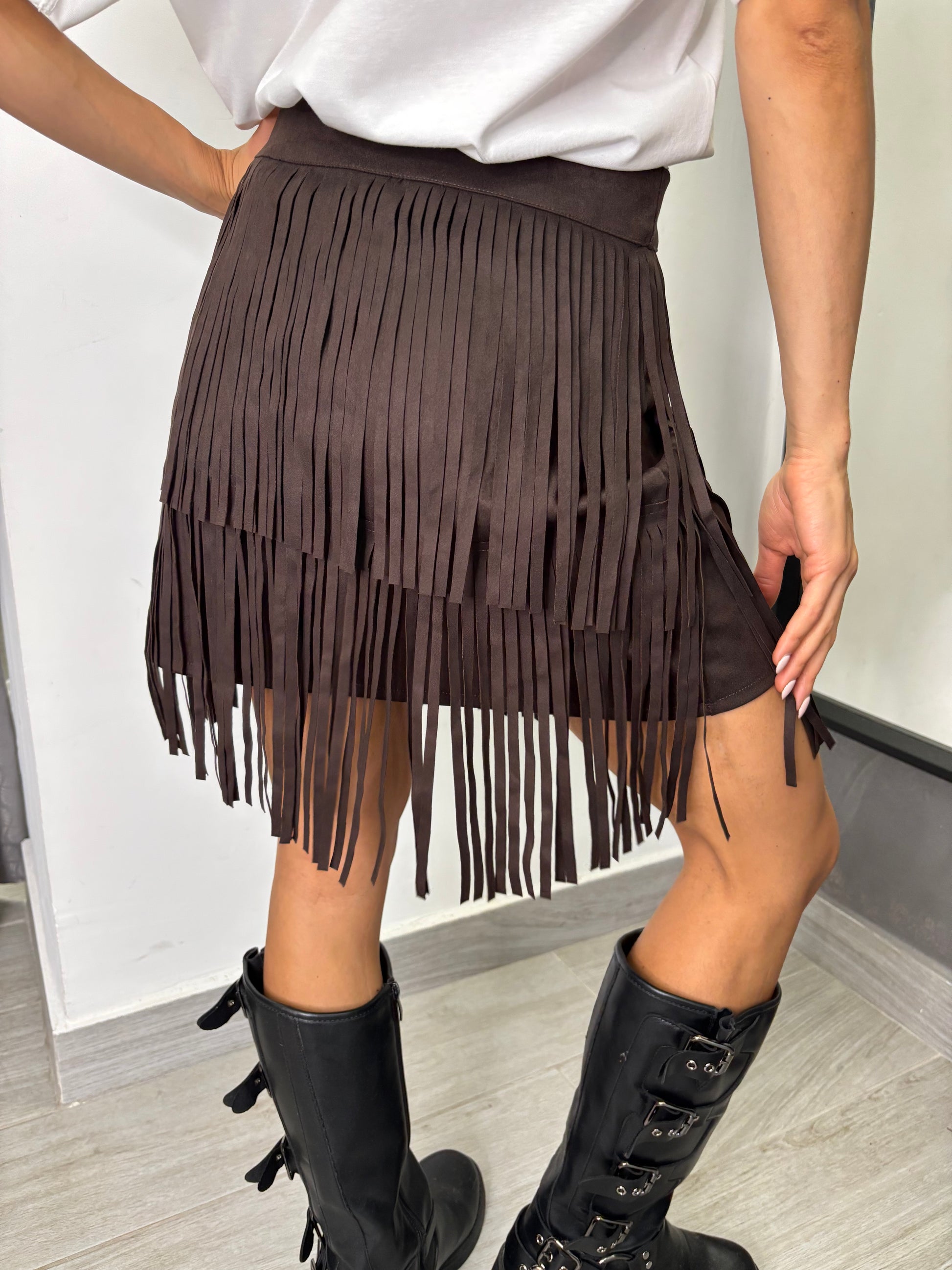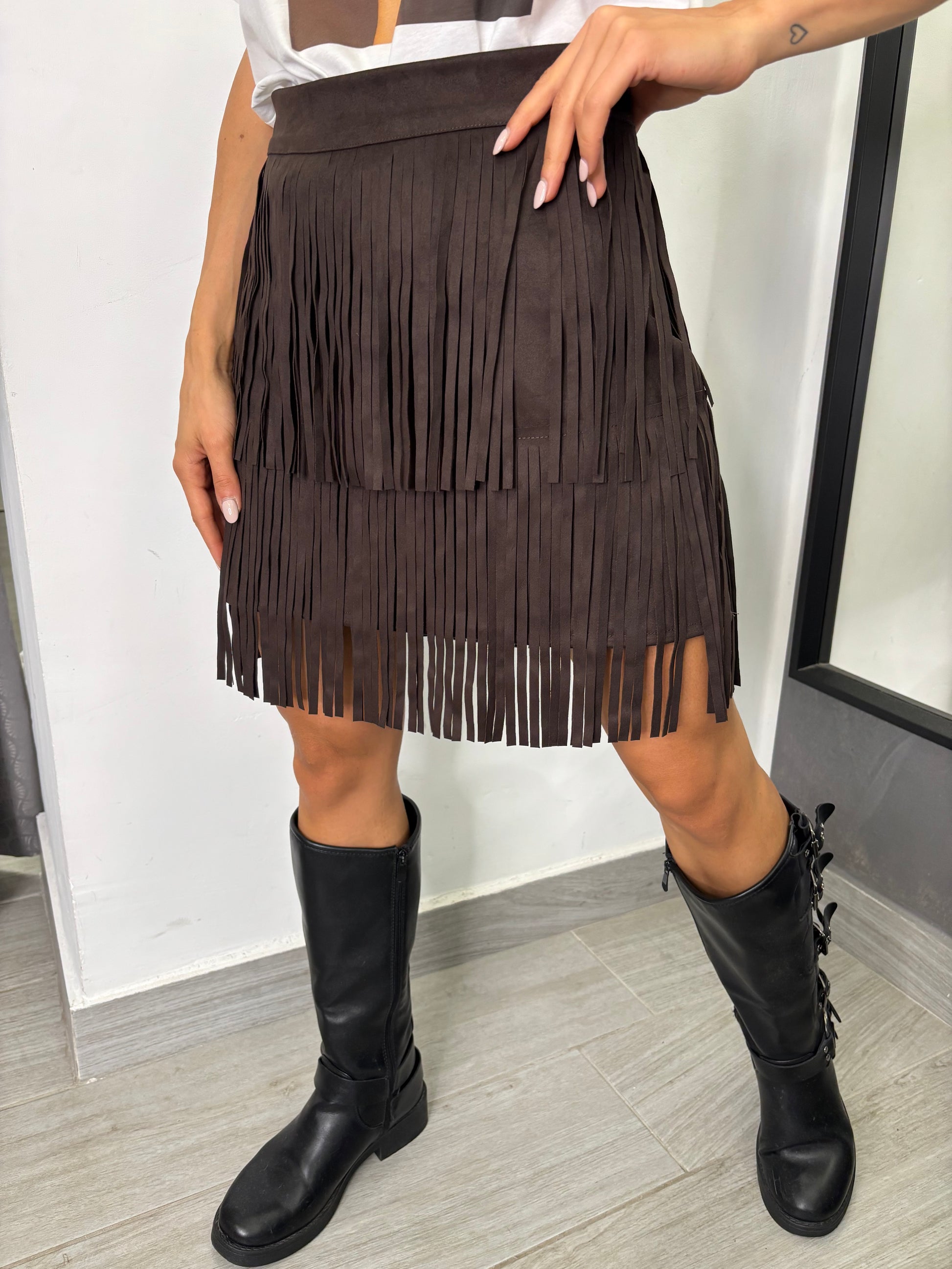 Gonna in simil renna con frange, cerniera sul fianco. Composizione 79% poliestere 19% viscosa 2% elastan