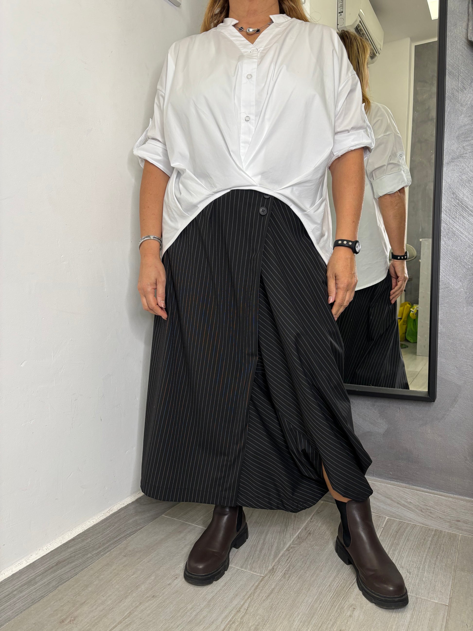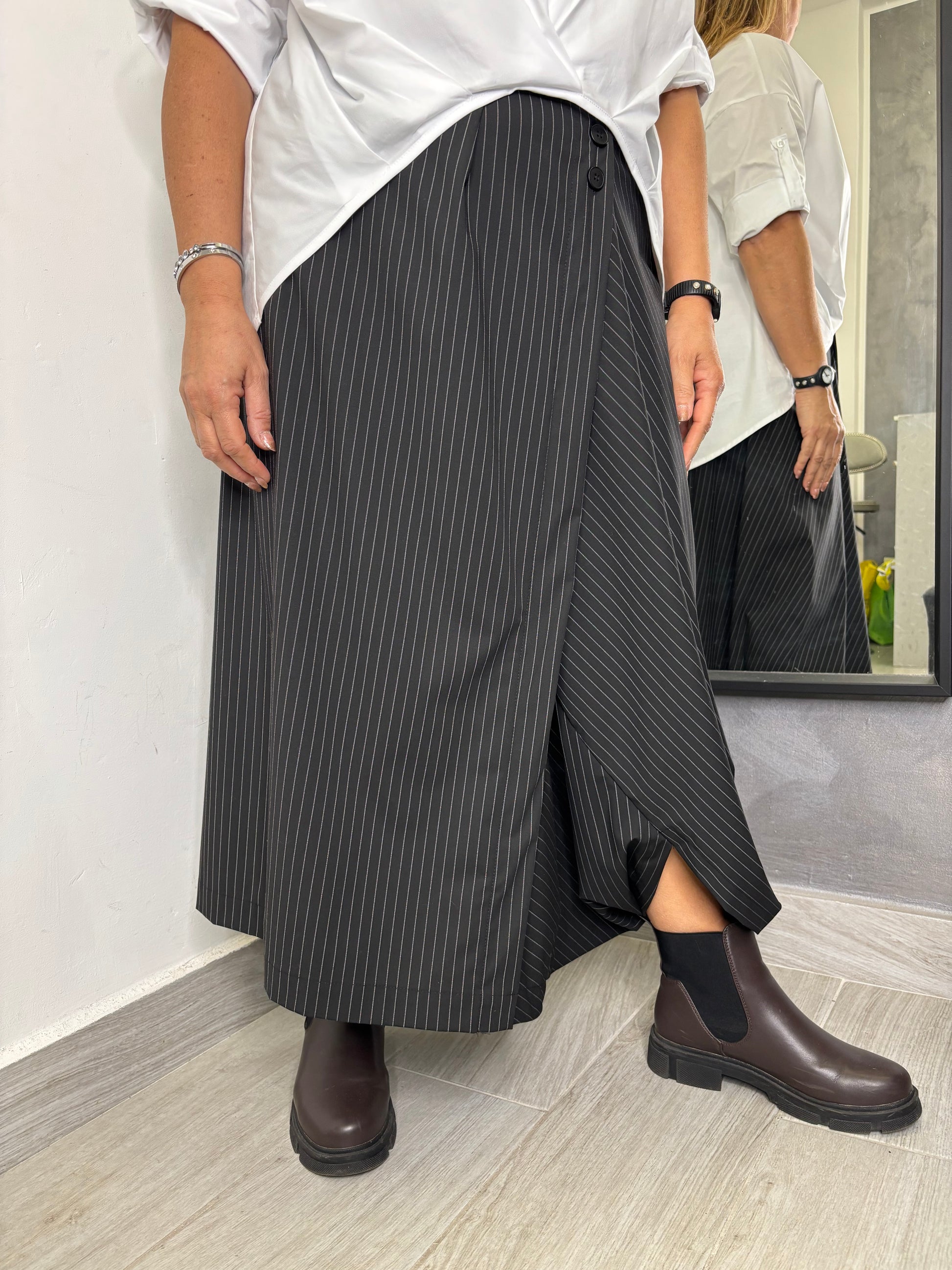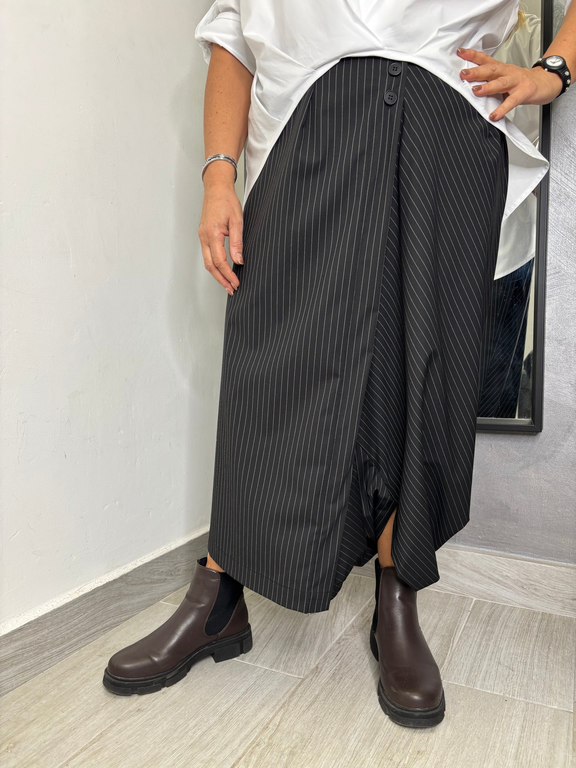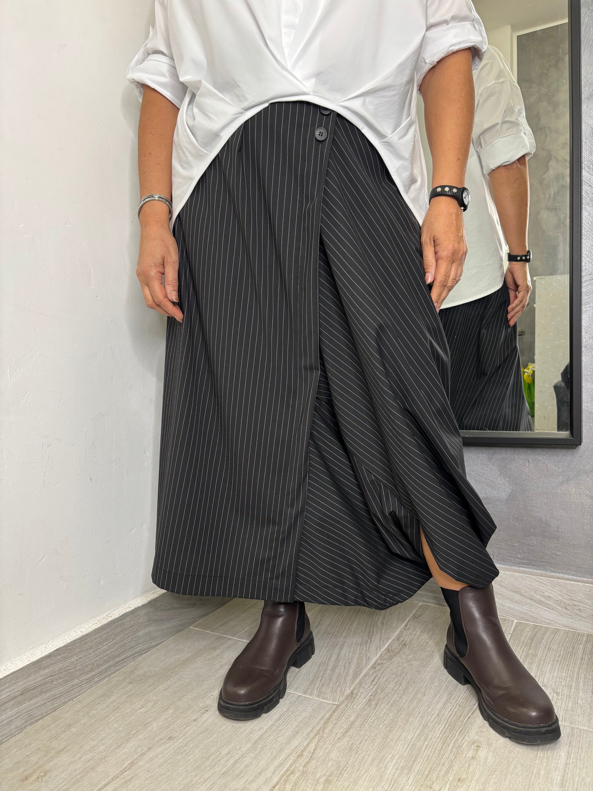 Gonna a pantalone in misto viscosa con un solo gambale in tessuto gessato e abbottonatura con bottoni. Taglia unica veste fino ad una 48.