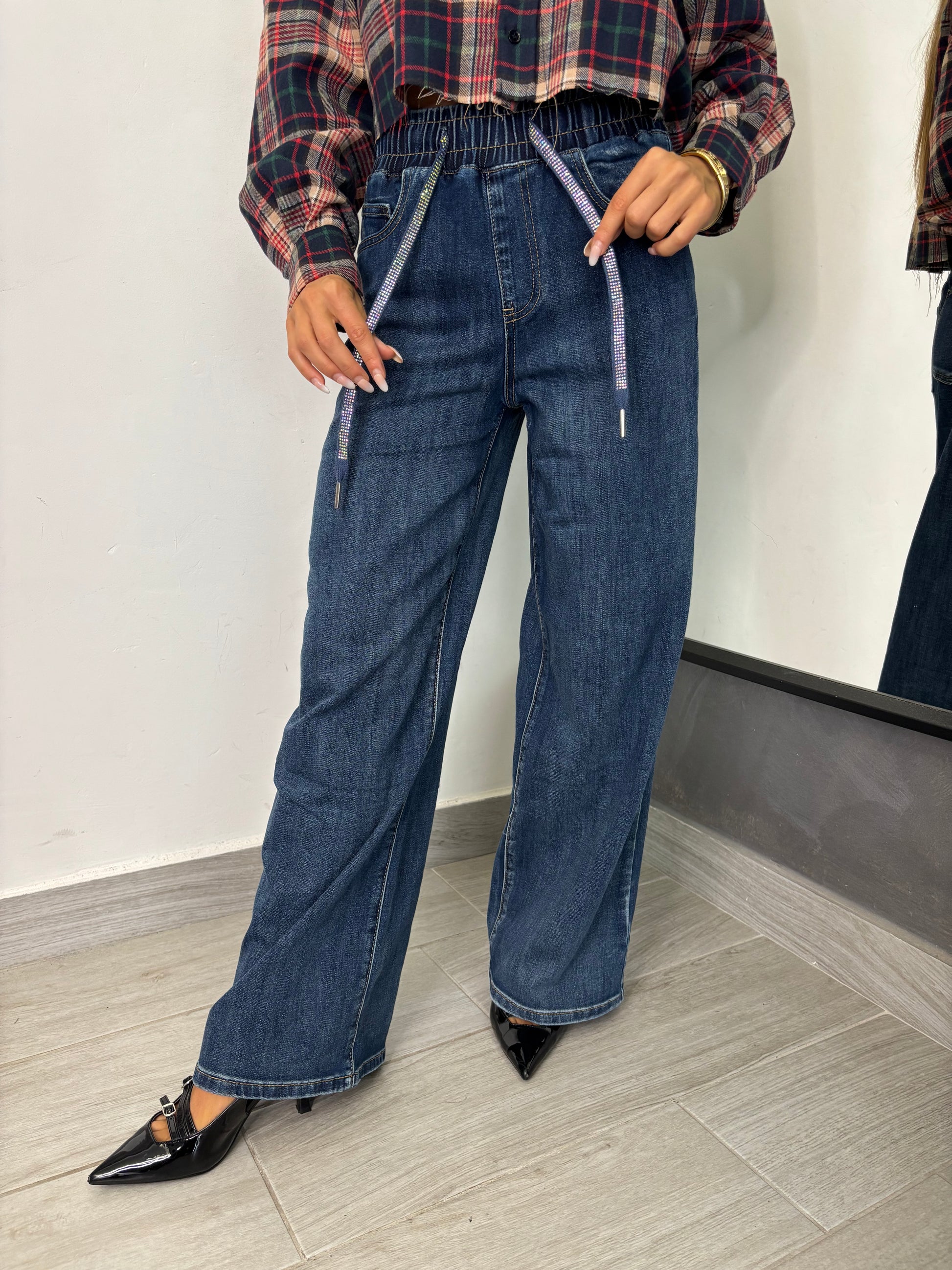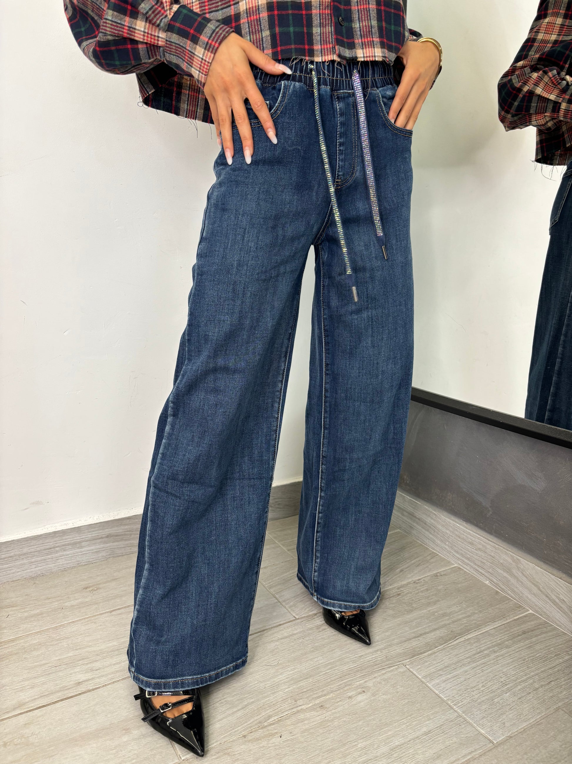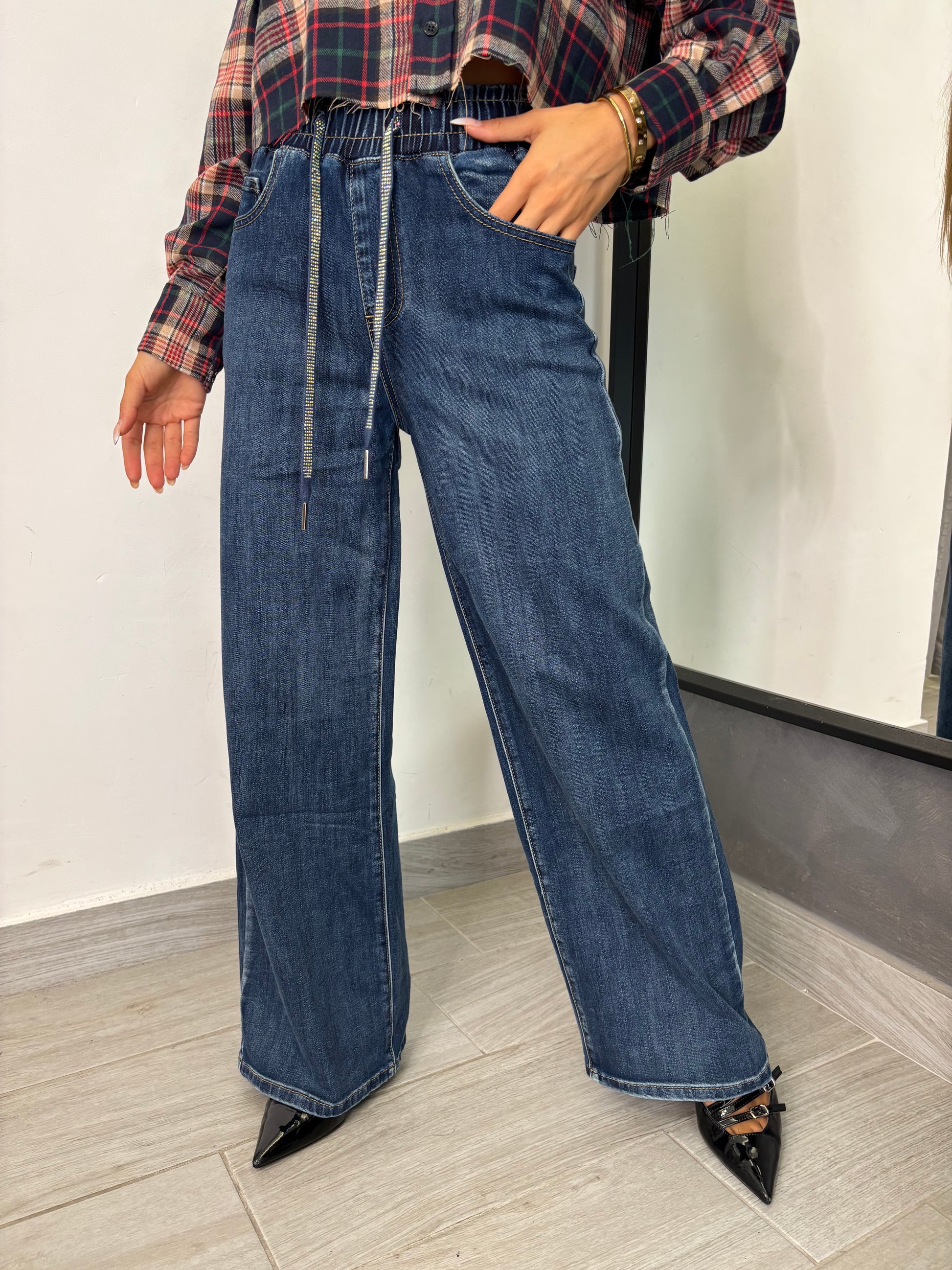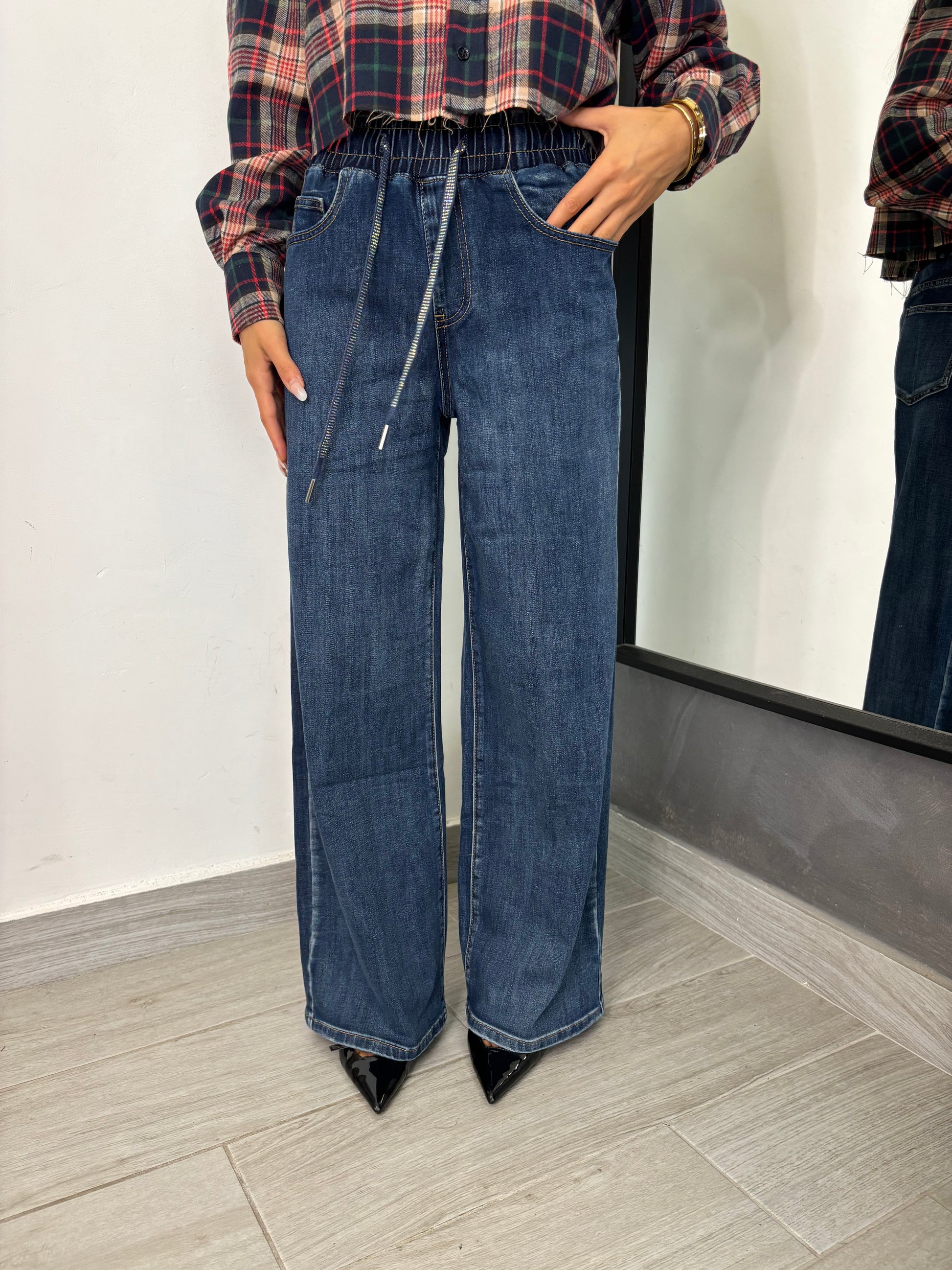 Pantalone a gamba larga in tessuto Denim con elastico su tutta la circonferenza della vita.