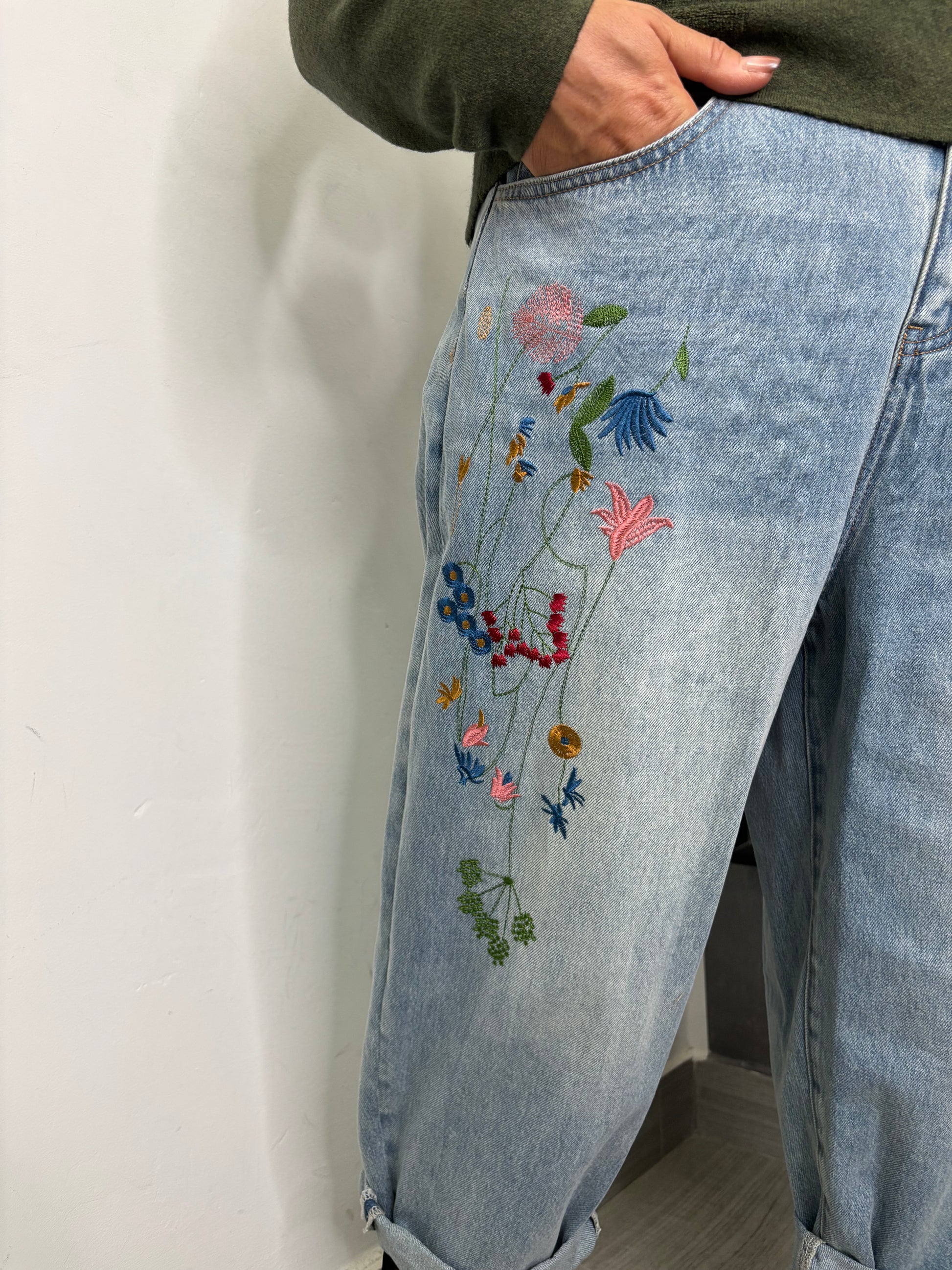 Pantalone in tessuto Denim, modello baggy, ricamo di fiori sulla gamba , abbottonatura con cerniera e bottoni , elastico su tutta la circonferenza della vita. Taglia unica veste fino ad una 48.