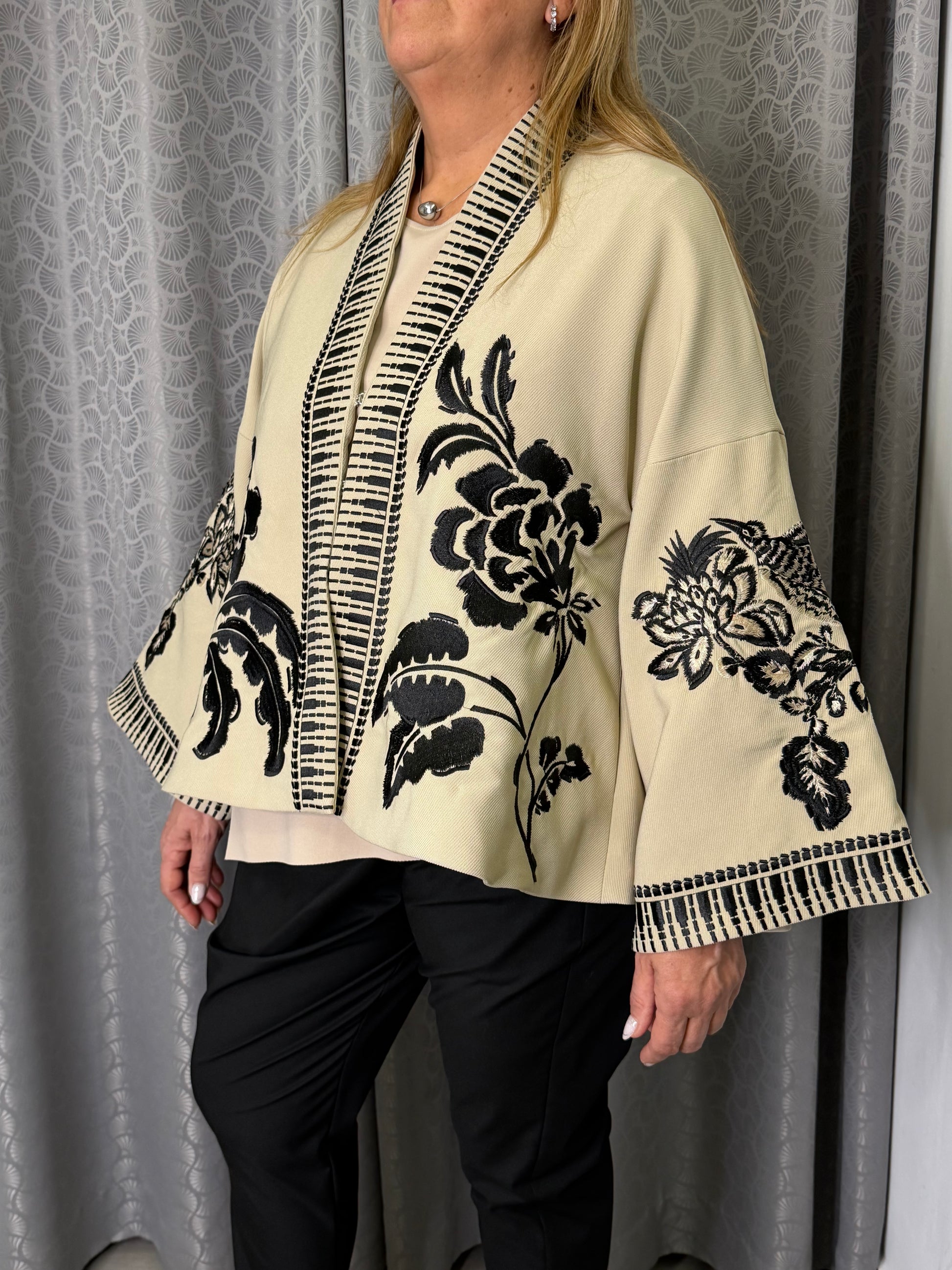 Giacca modello a kimono foderata, scollo a V, abbottonatura con ganci, tutta ricamata, manica lunga svasata nel fondo e tasche inserite nei fianchi. Taglia unica veste fino ad una 48. Composizione 98% poliestere 2% spandex