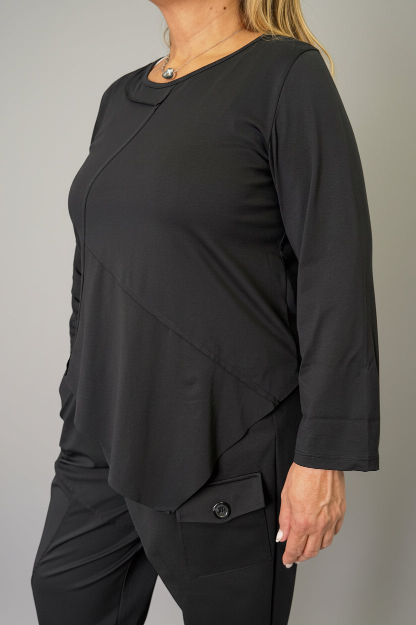 Maglia in cotone elasticizzato, cuciture a taglio vivo, giro collo e manica lunga. Taglia unica veste fino ad una 46.