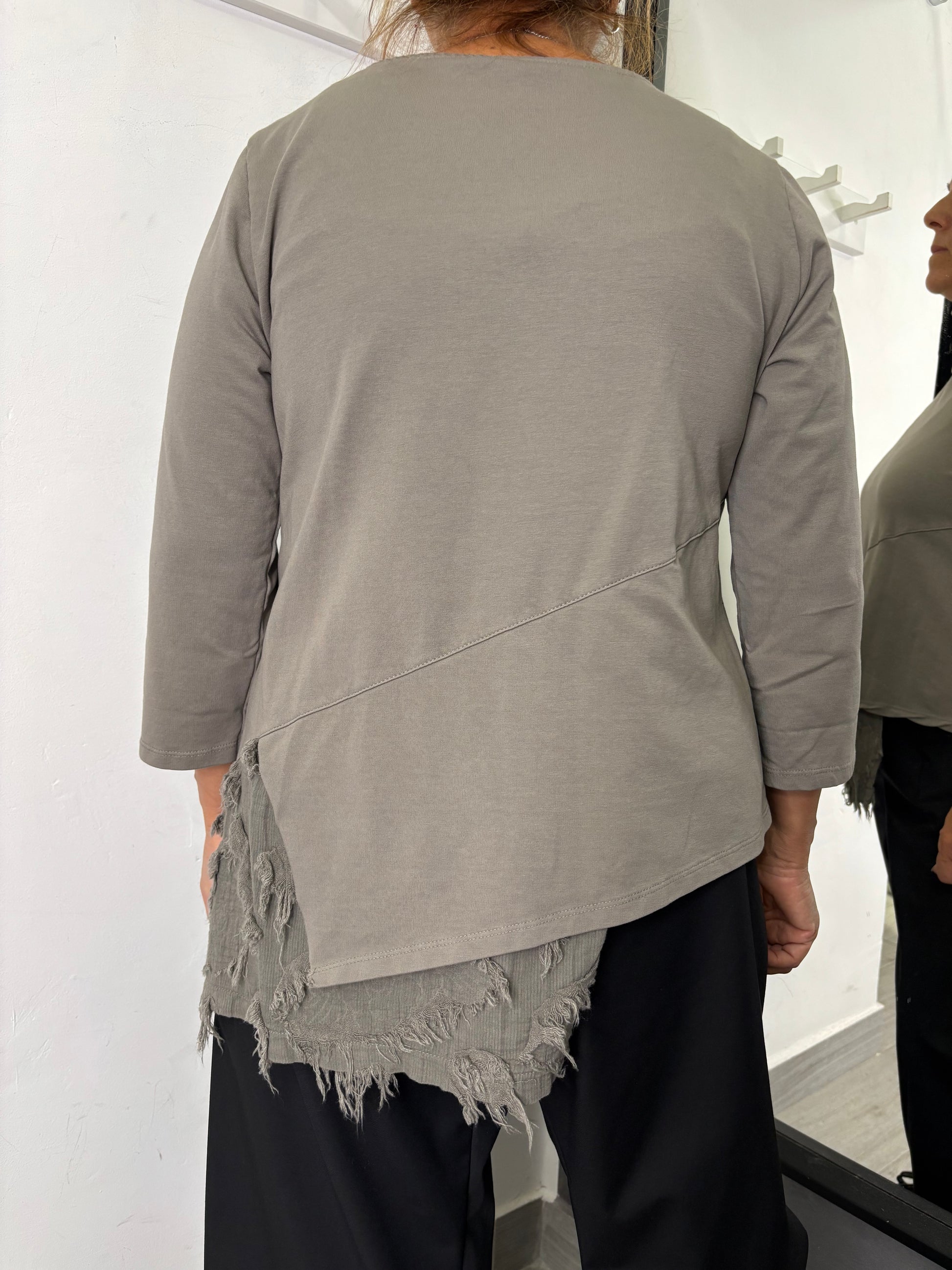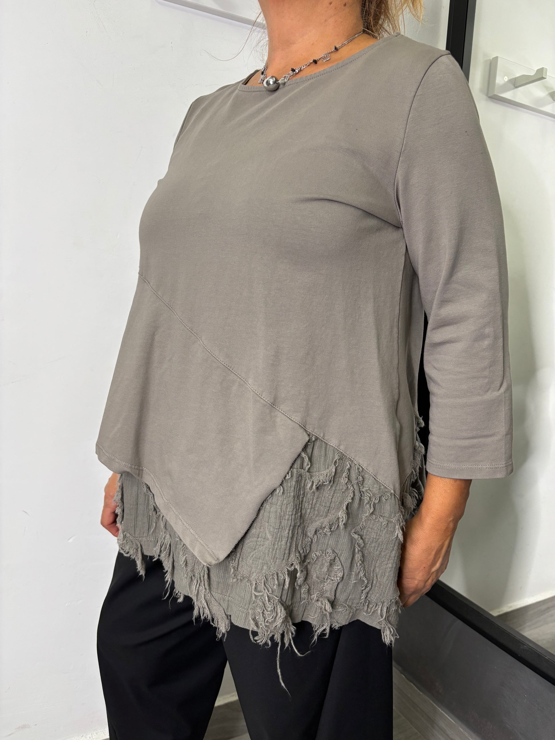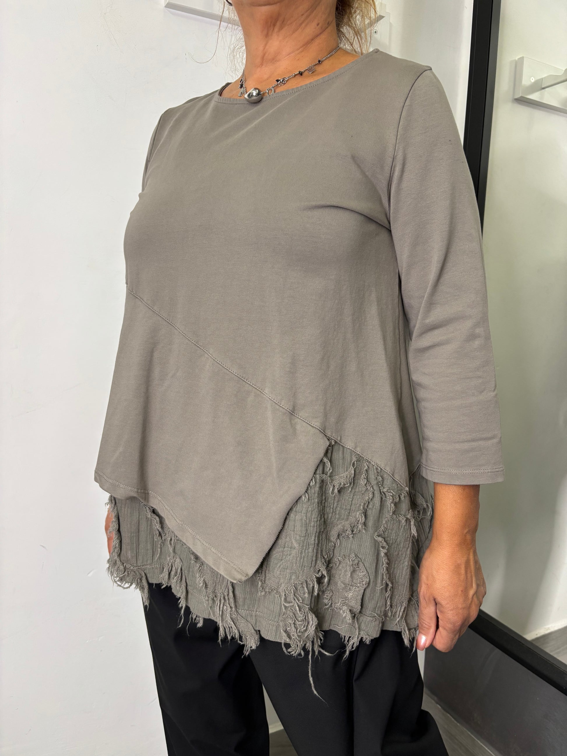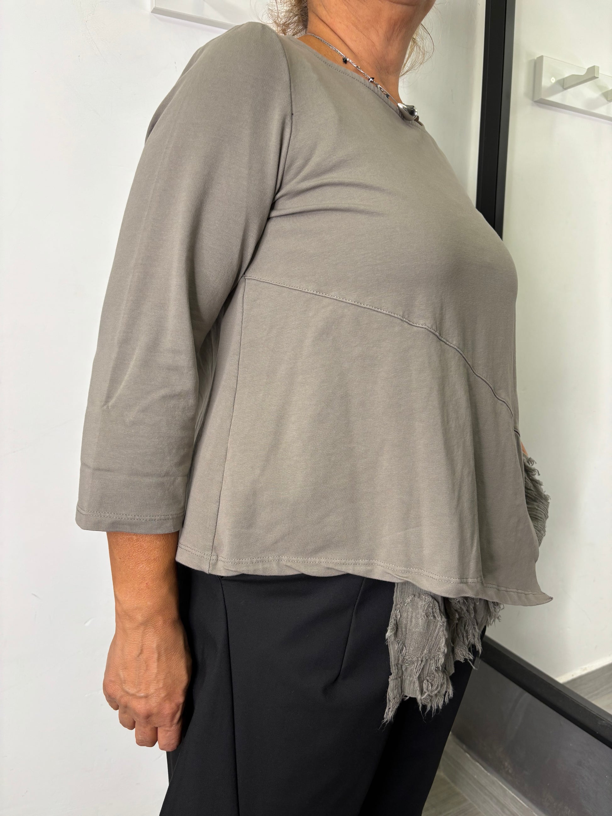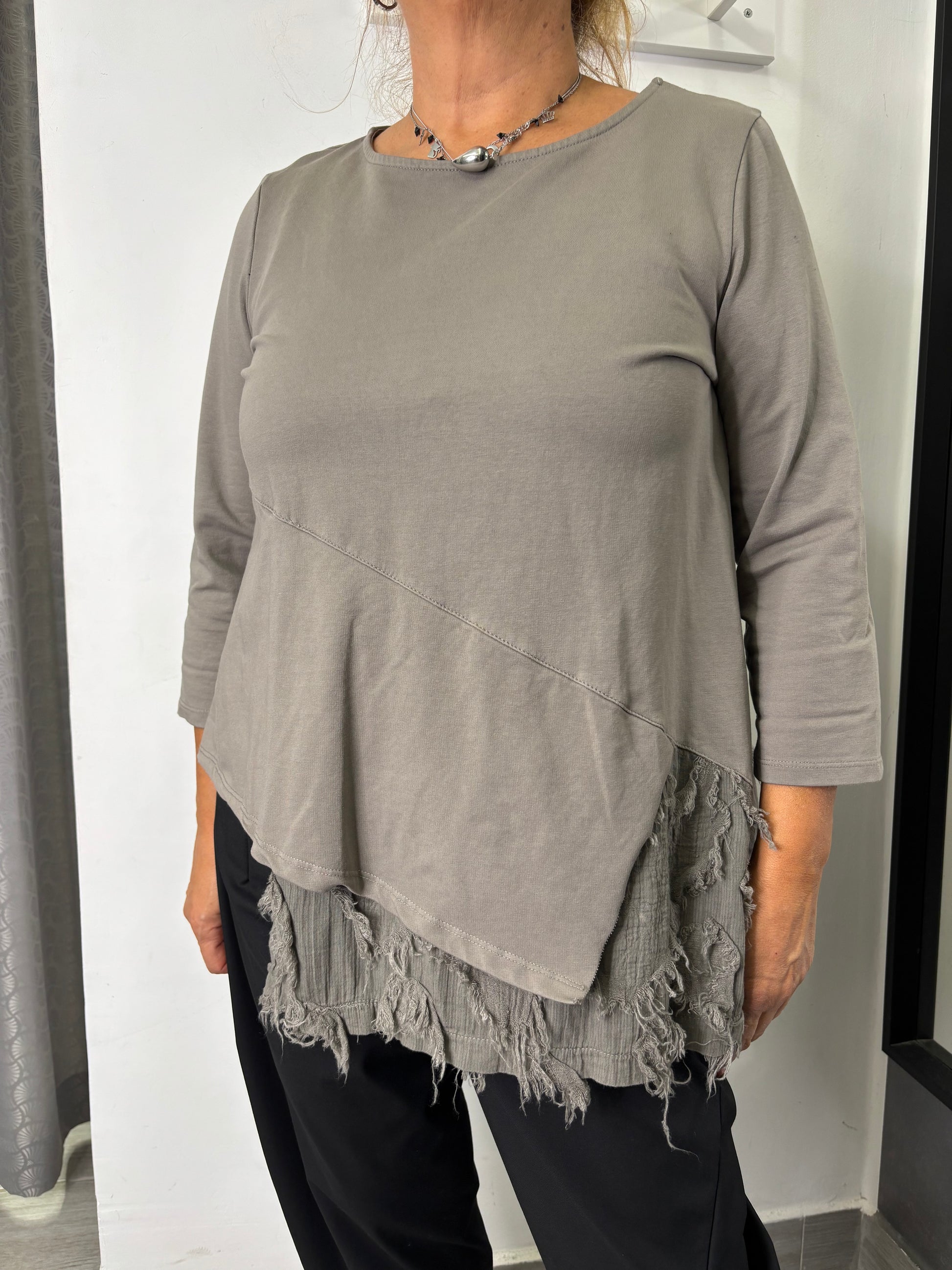 Maglia in tessuto a giro collo, manica 3/4, presenta nella parte sinistra sia davanti che dietro un inserto di tessuto lavorato e sfilacciato. Taglia unica veste fino ad una 46.