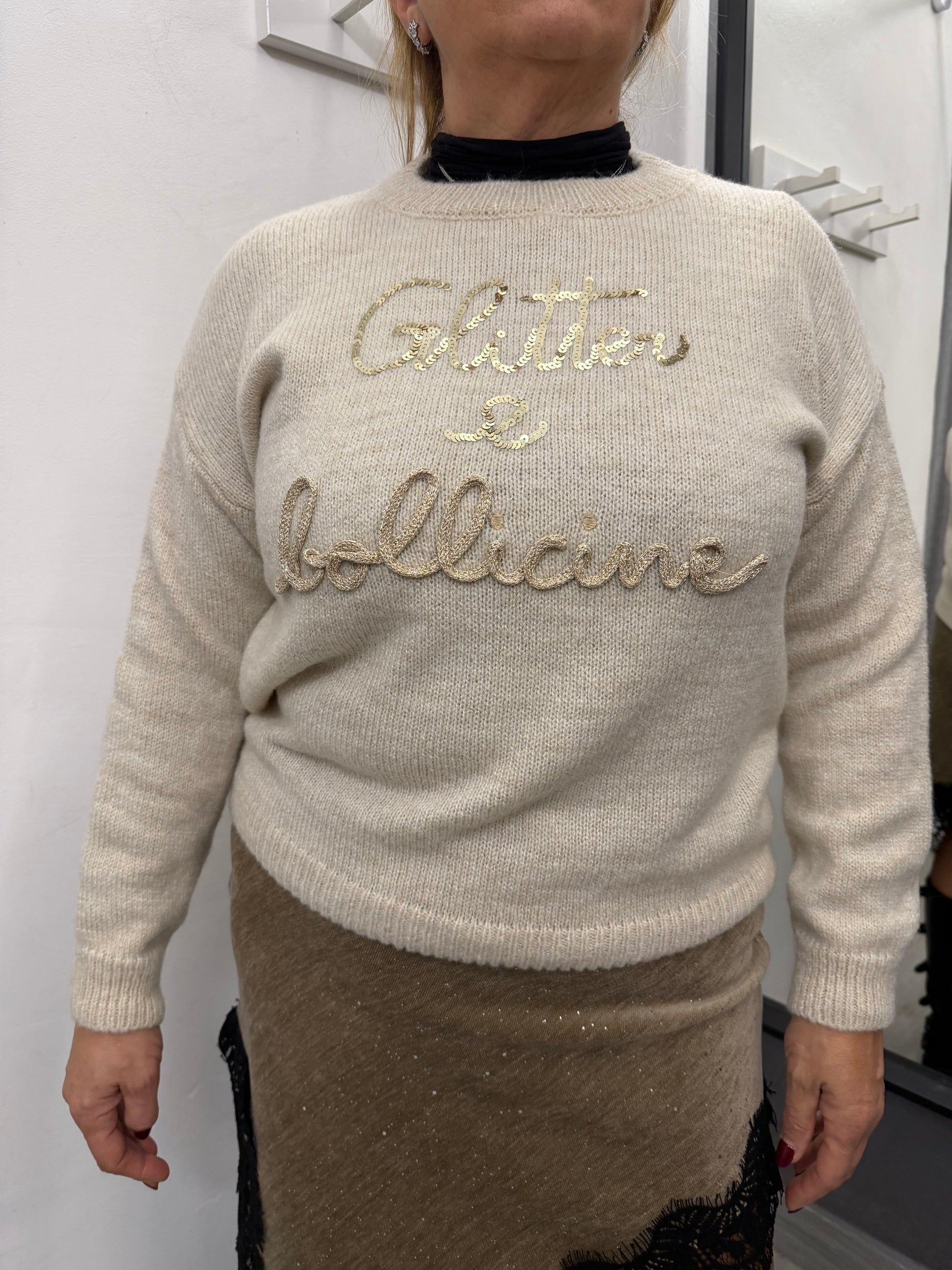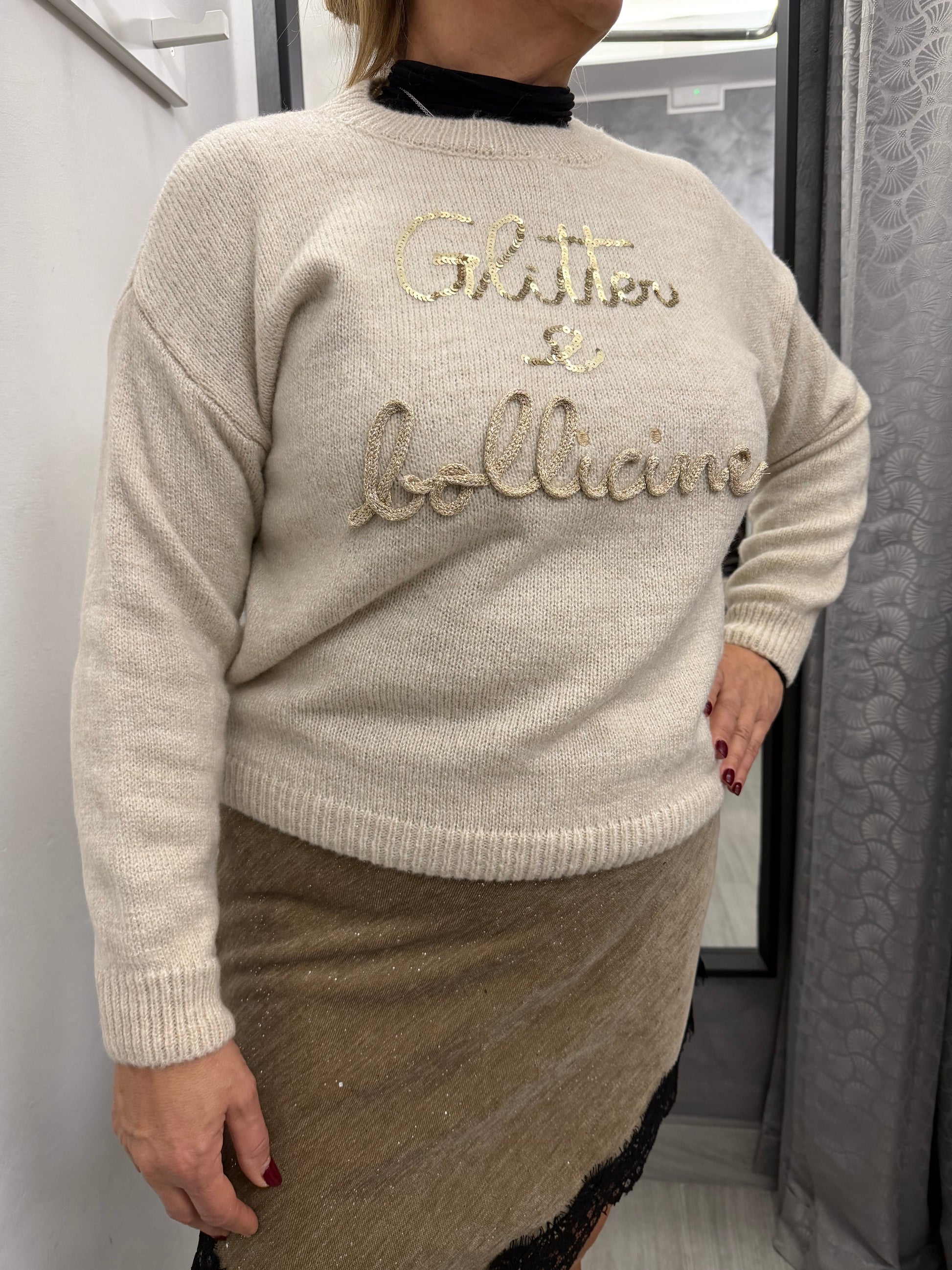 Maglioncino giro collo con scritta davanti, modello oversize veste fino ad una 46. Composizione 56% acrilico 28% poliammide 8% lana 8% viscosa